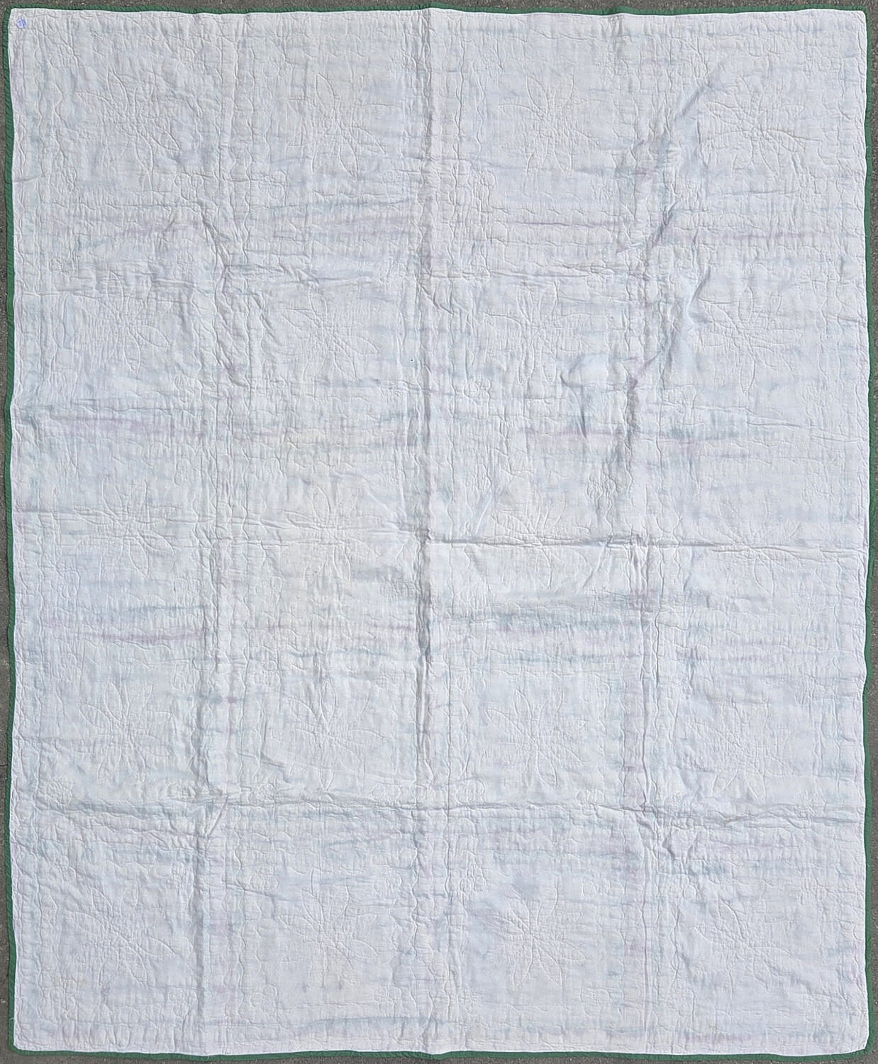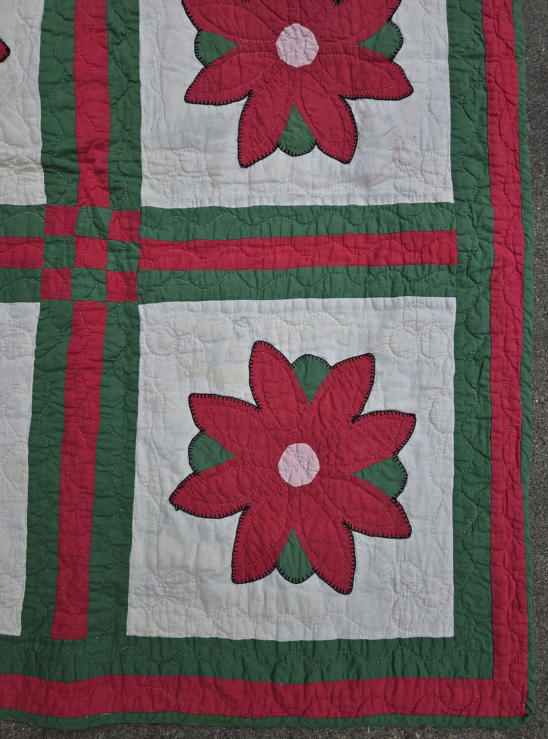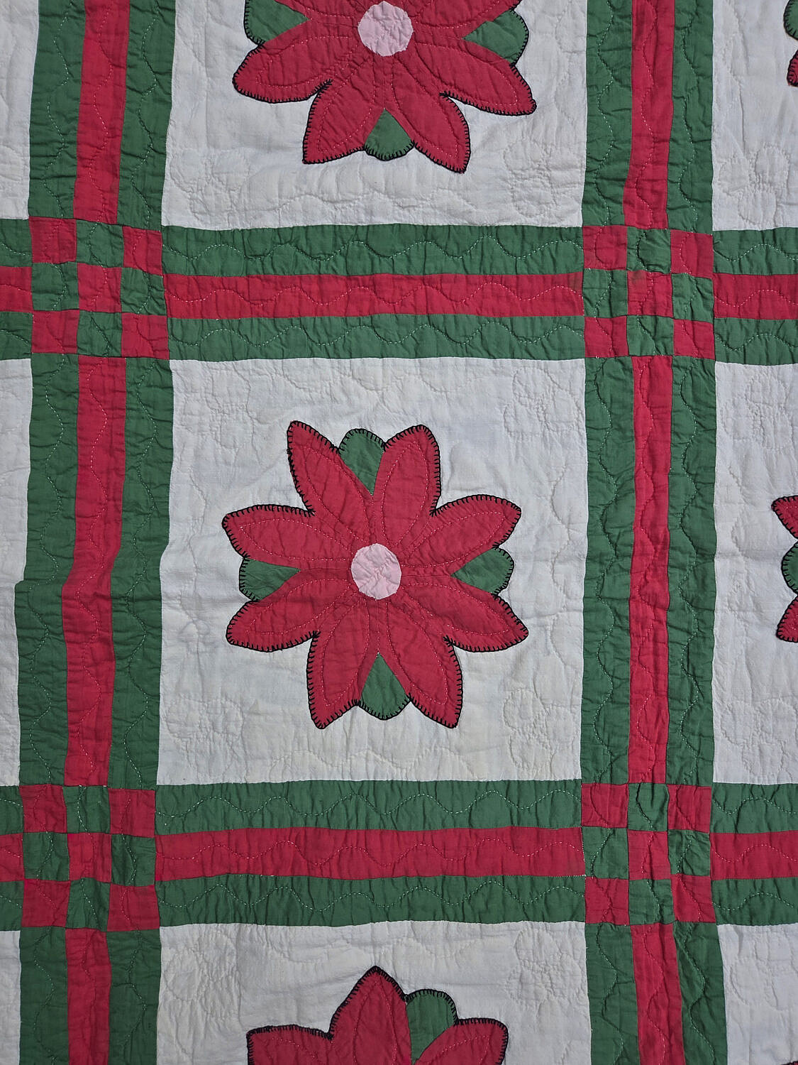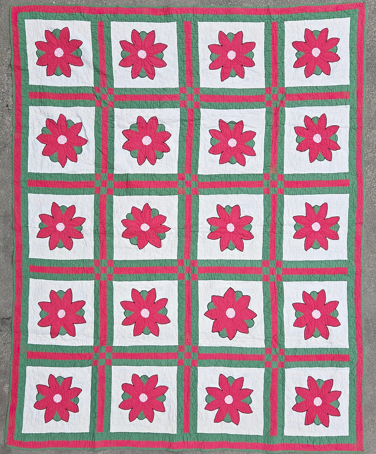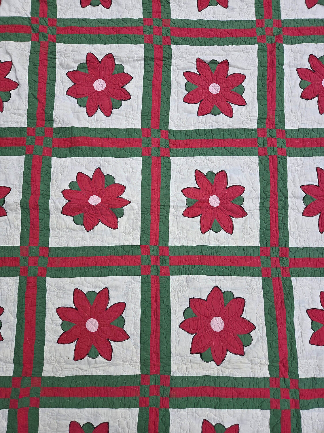 Vintage Floral Patchwork Quilt, circa 1930s, bold red and green border and 9-patch in a square grid