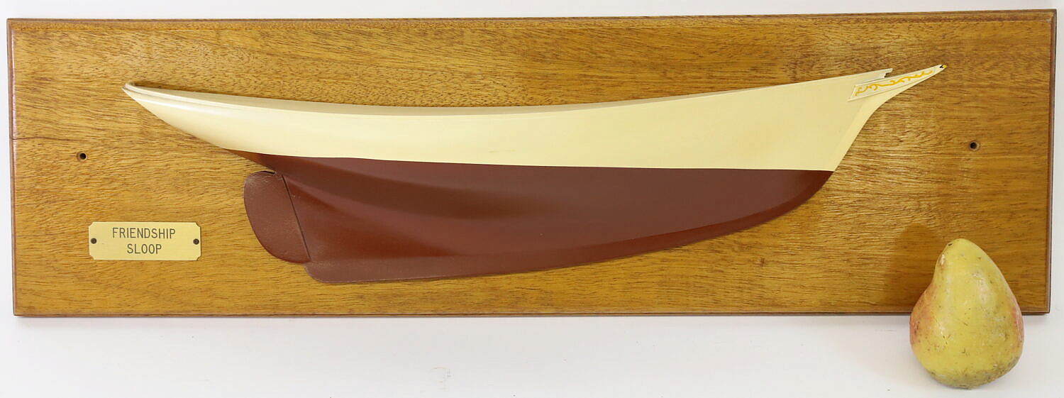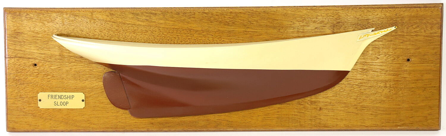 Vintage Friendship Sloop Shipbuilder’s Half Hull Model, paint decorated solid wood hull mounted to a mahogany backboard.