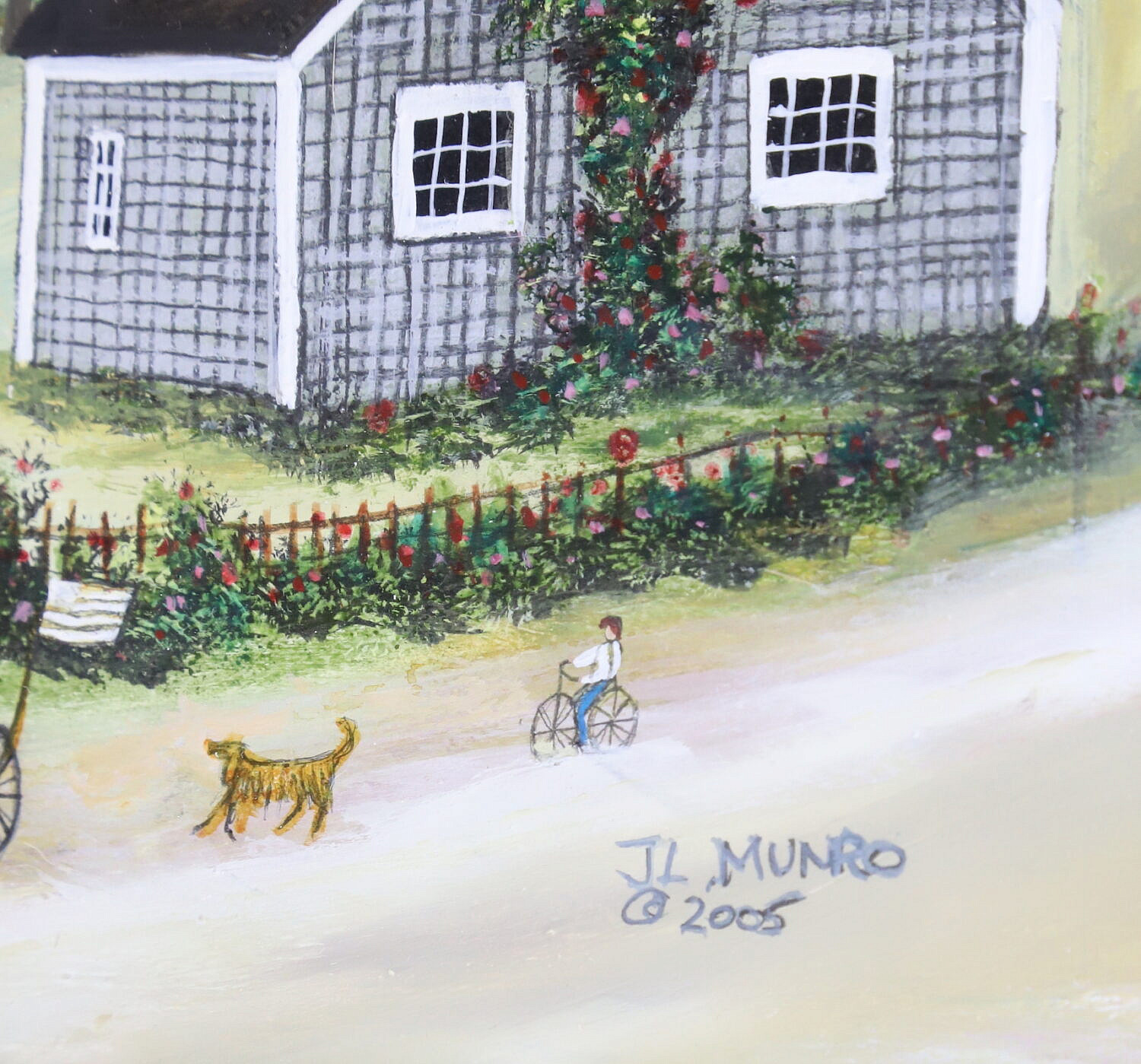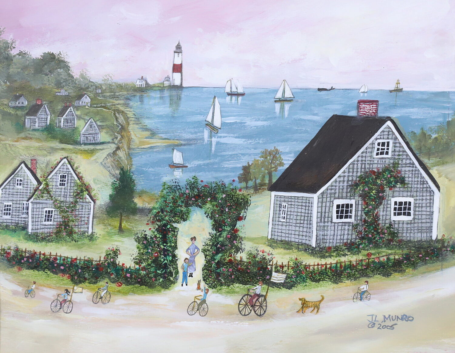 Vintage Jan Munro Nantucket Folk Art View of Sconset and Sankaty Light, oil on board, signed and dated 2005 lower right.