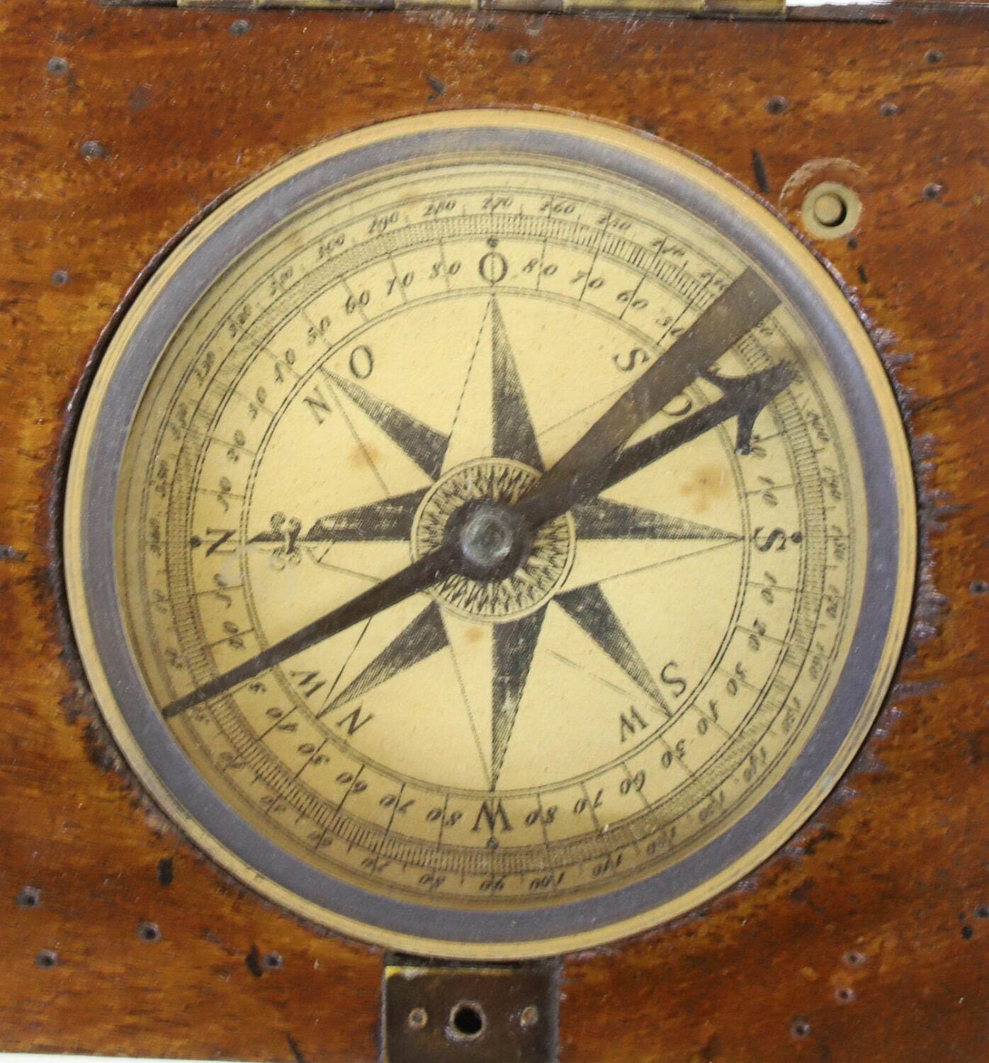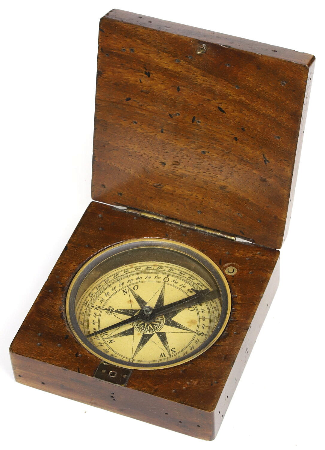 Vintage Mahogany Pocket Size Box Compass, printed paper insert, distressed mahogany case.