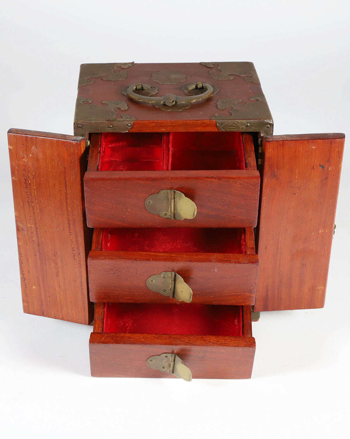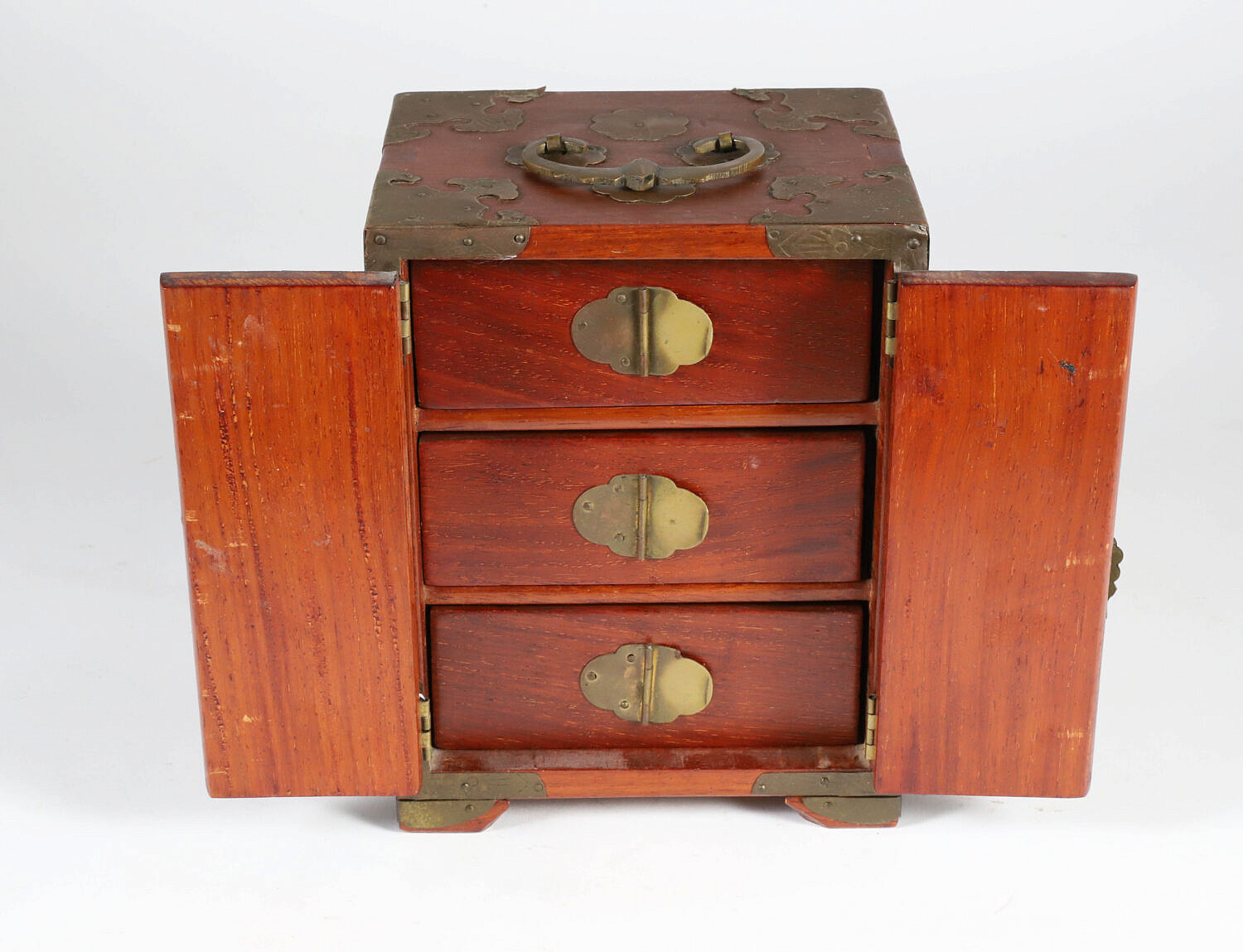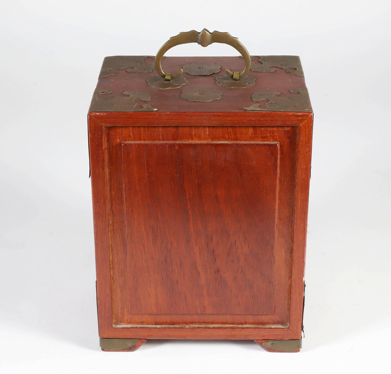 Vintage Miniature Chinese Teakwood and Brass Bound Jewelry Cabinet