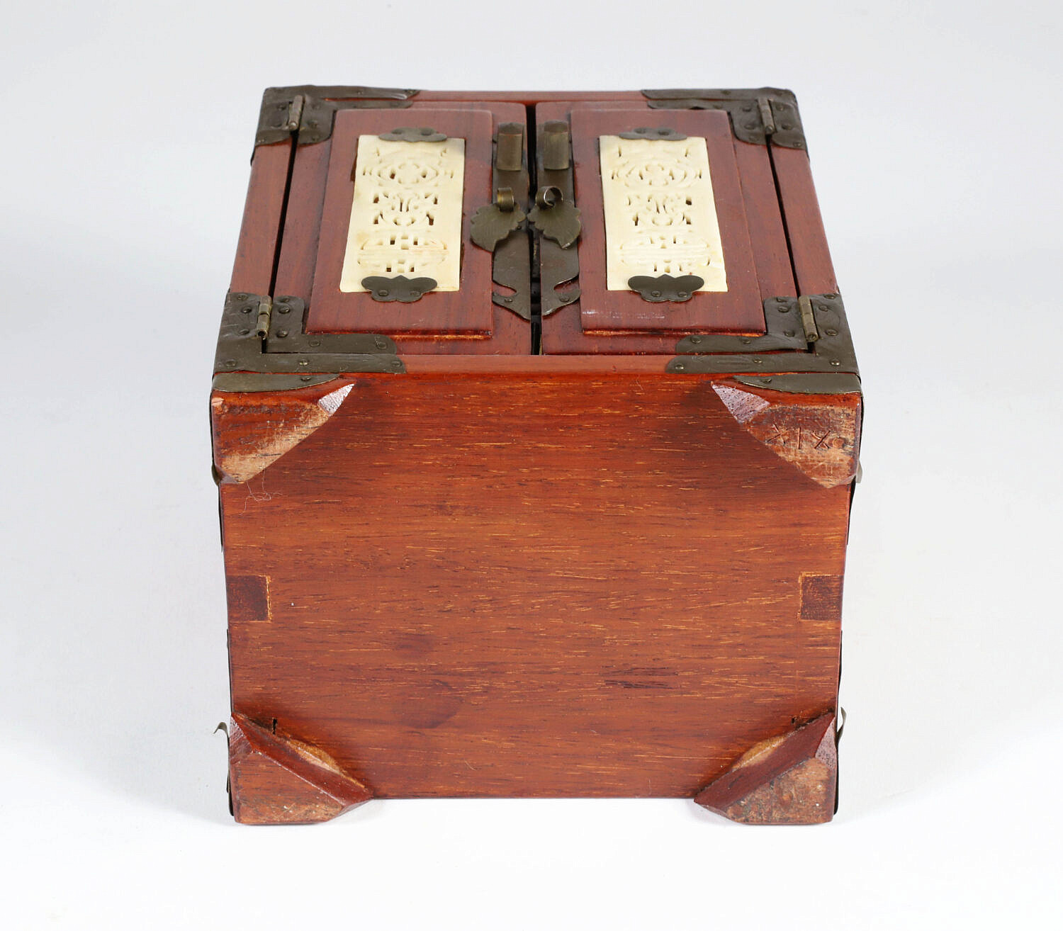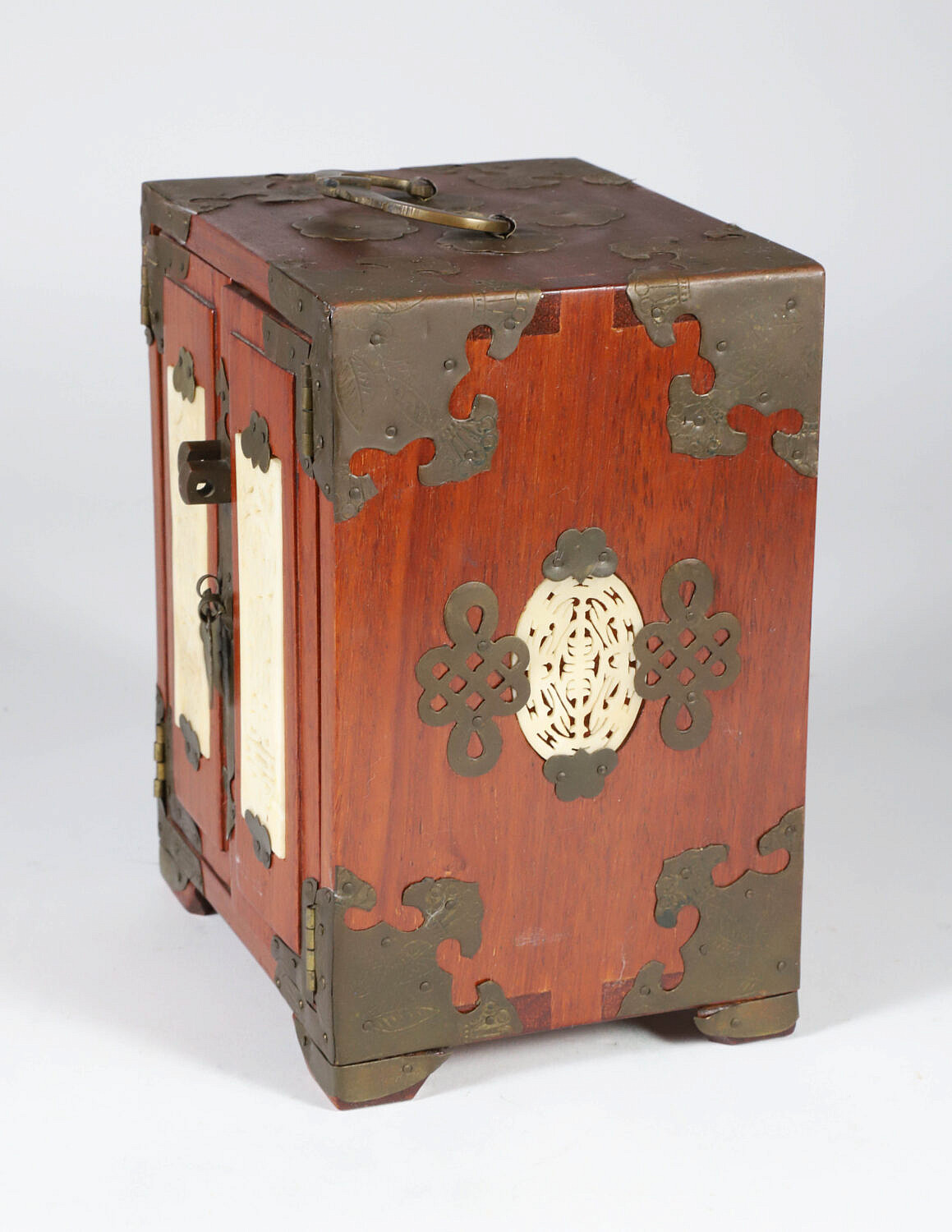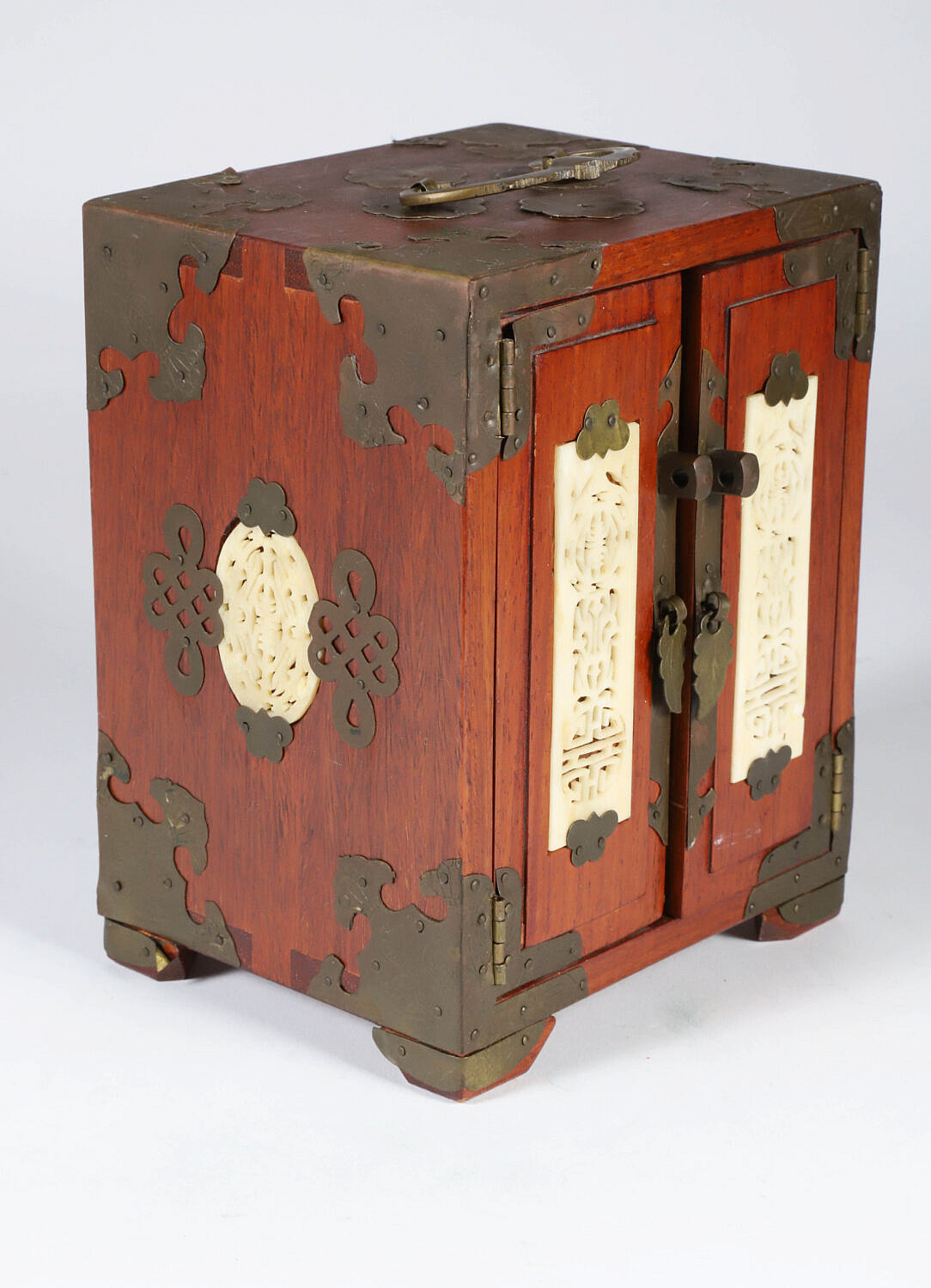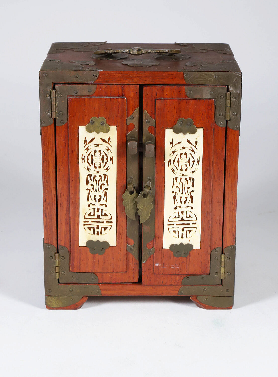 Vintage Miniature Chinese Teakwood and Brass Bound Jewelry Cabinet