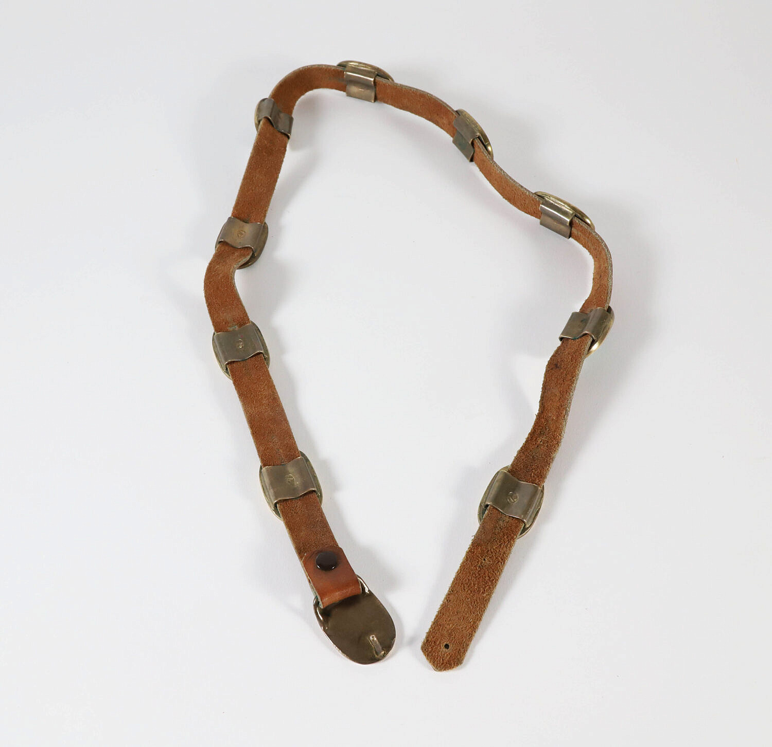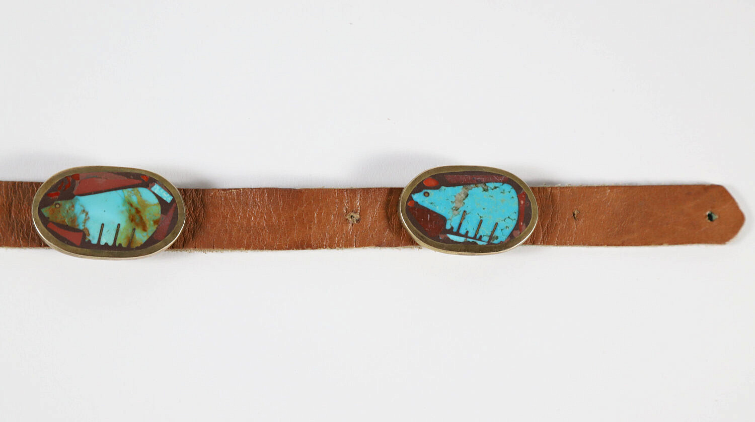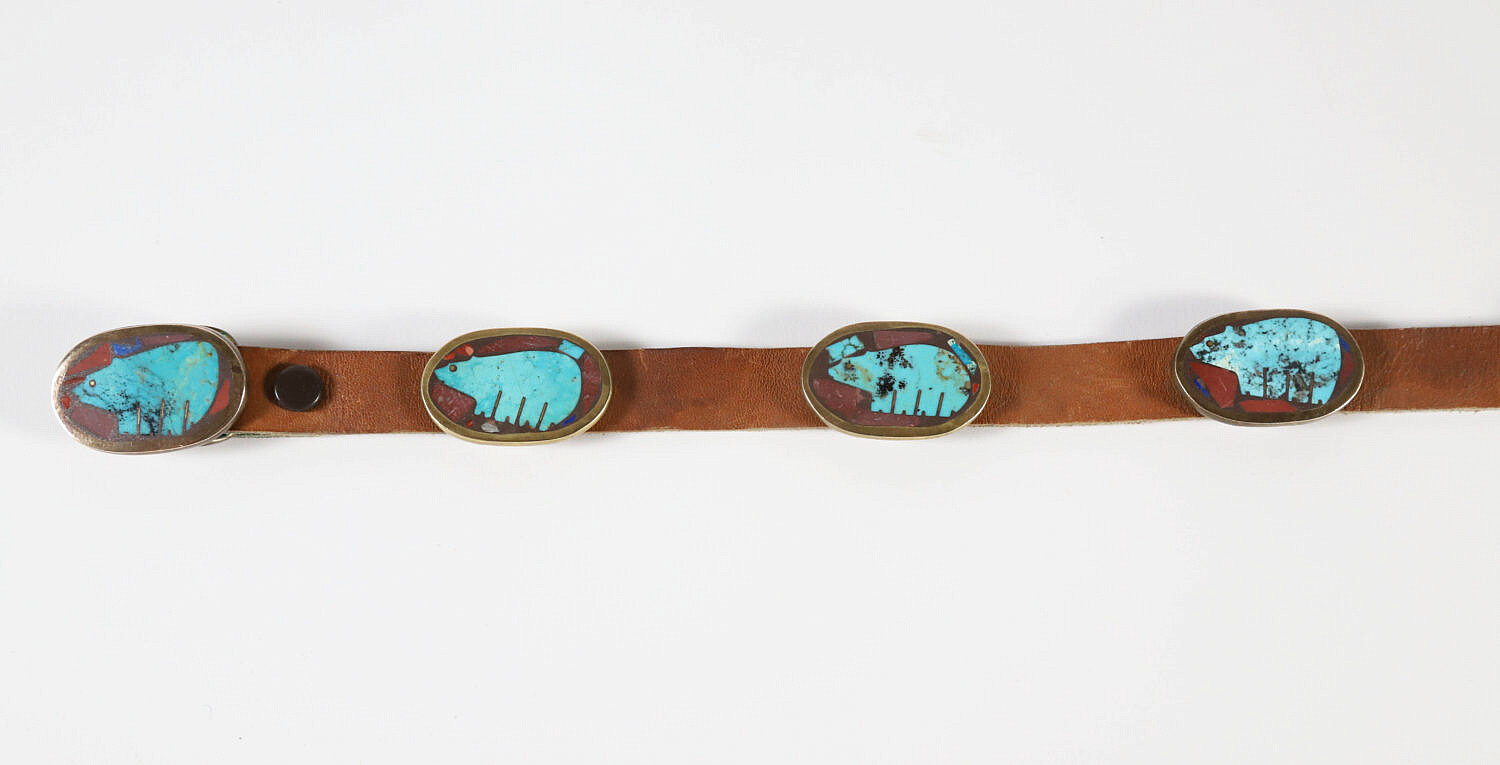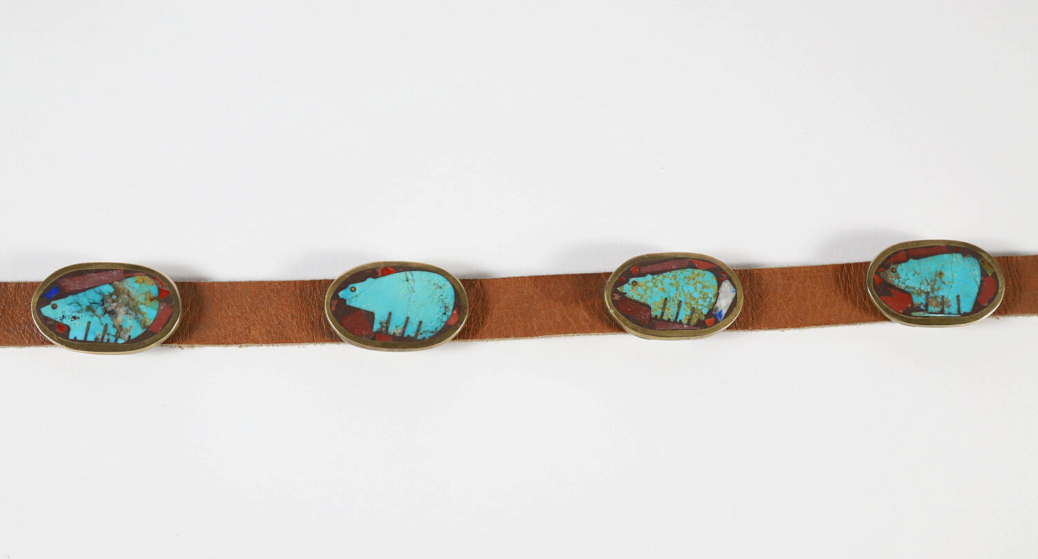 Vintage Native American Turquoise Bear Concho Belt, 10 medallions in brass and other mixed stones, stamped on reverse