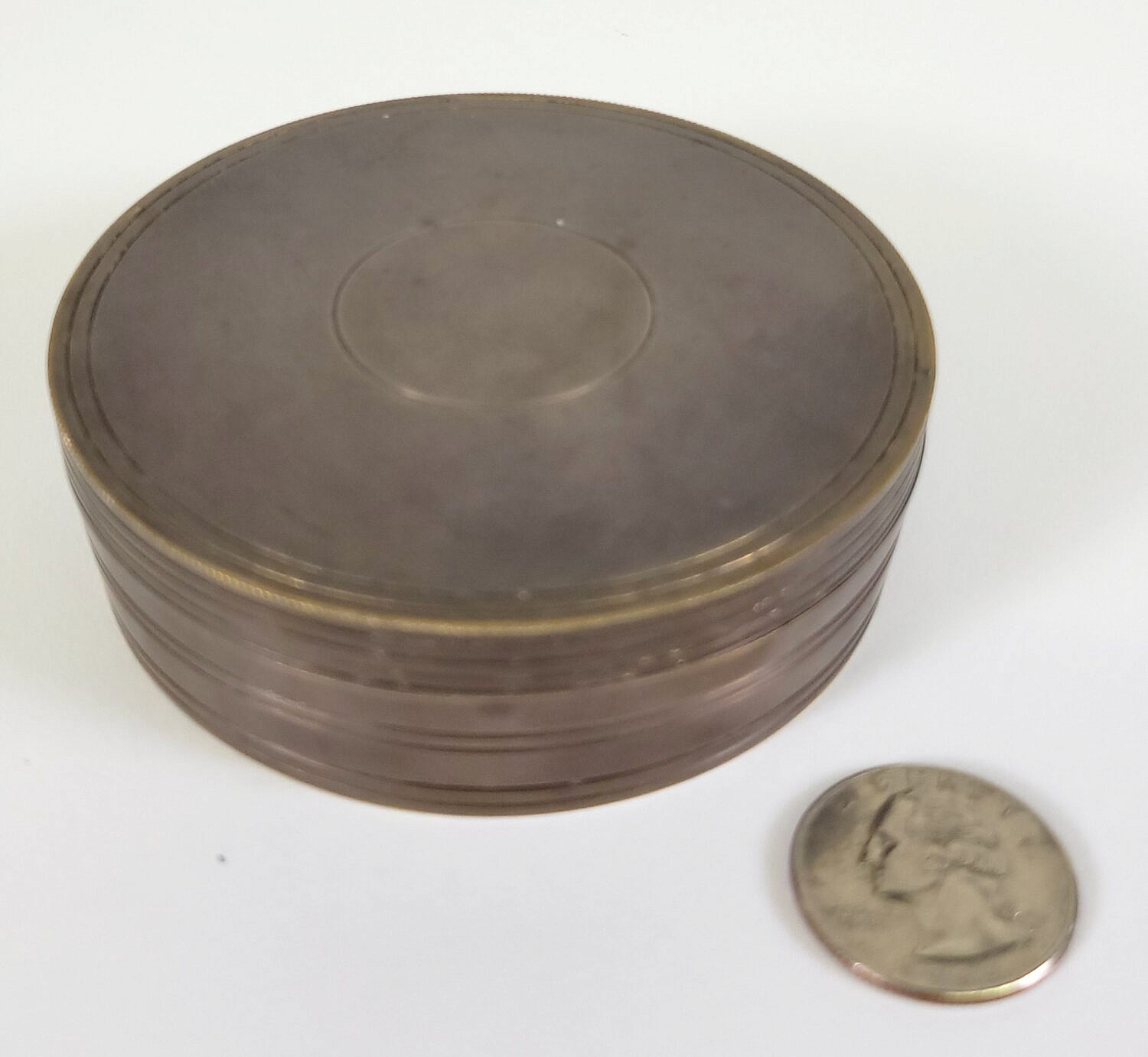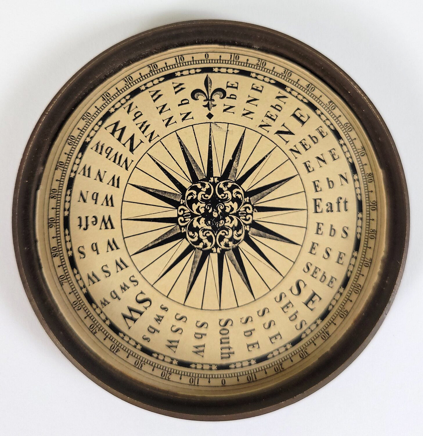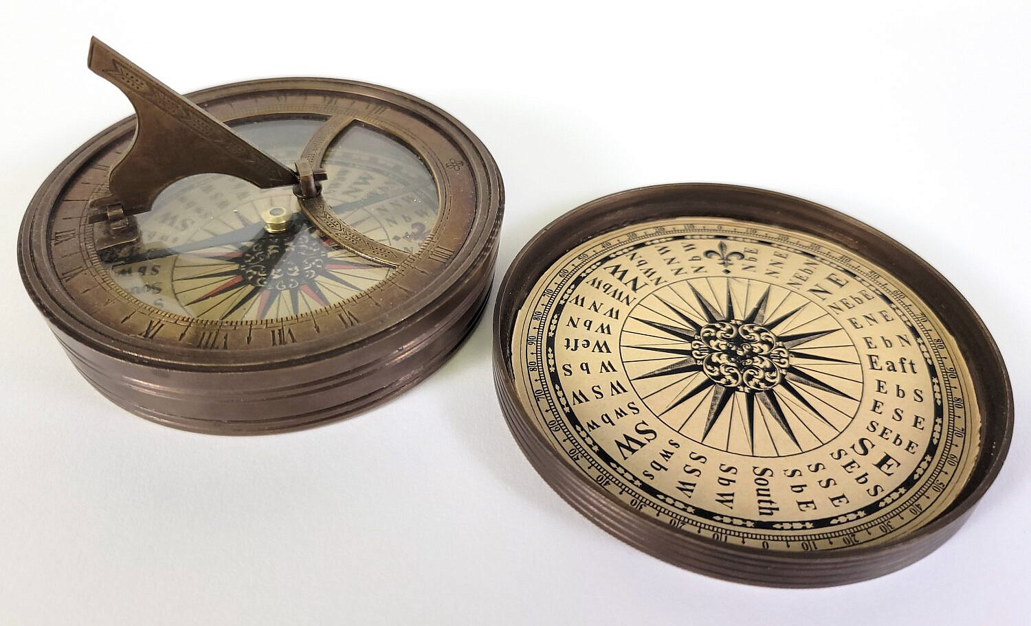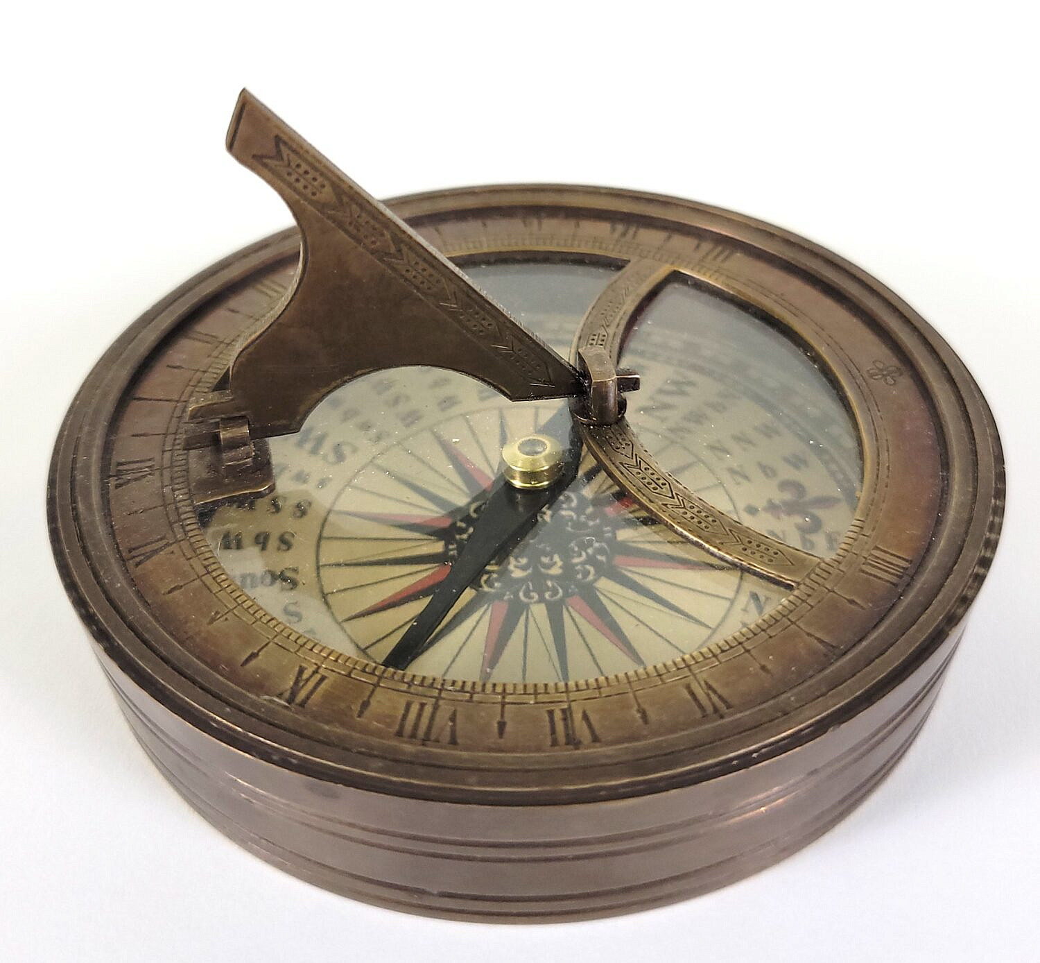 Vintage Nautical Military Brass Pocket Compass Sundial, brass case with paper inserts, folding sundial arm, threaded lid.