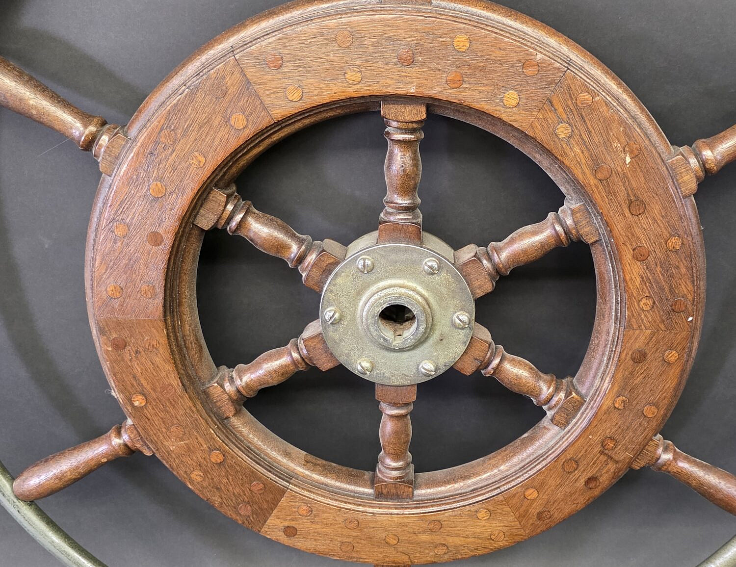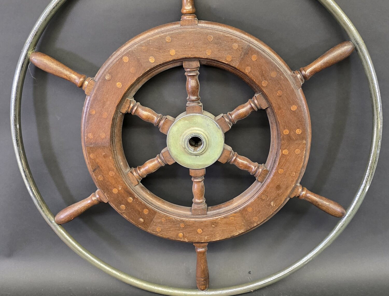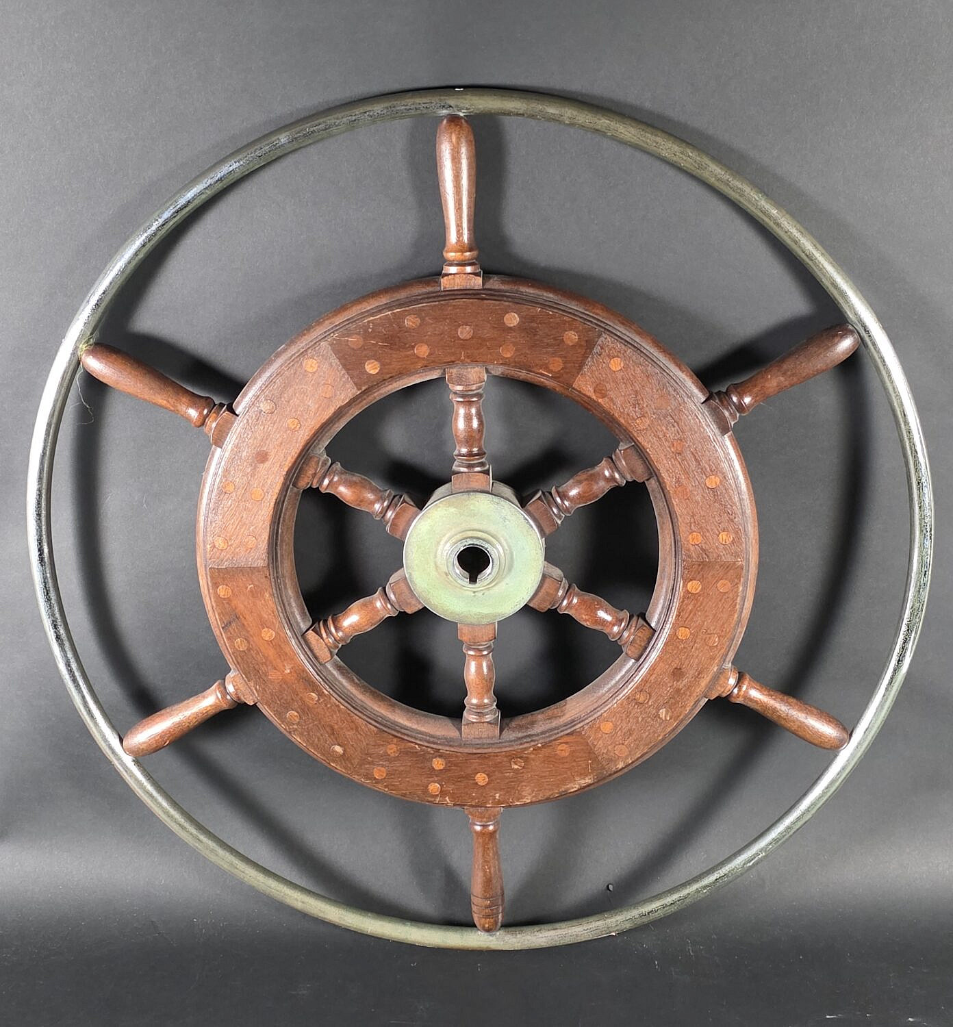 Vintage Nickel Plated and Mahogany Inlaid Yacht Ships Wheel