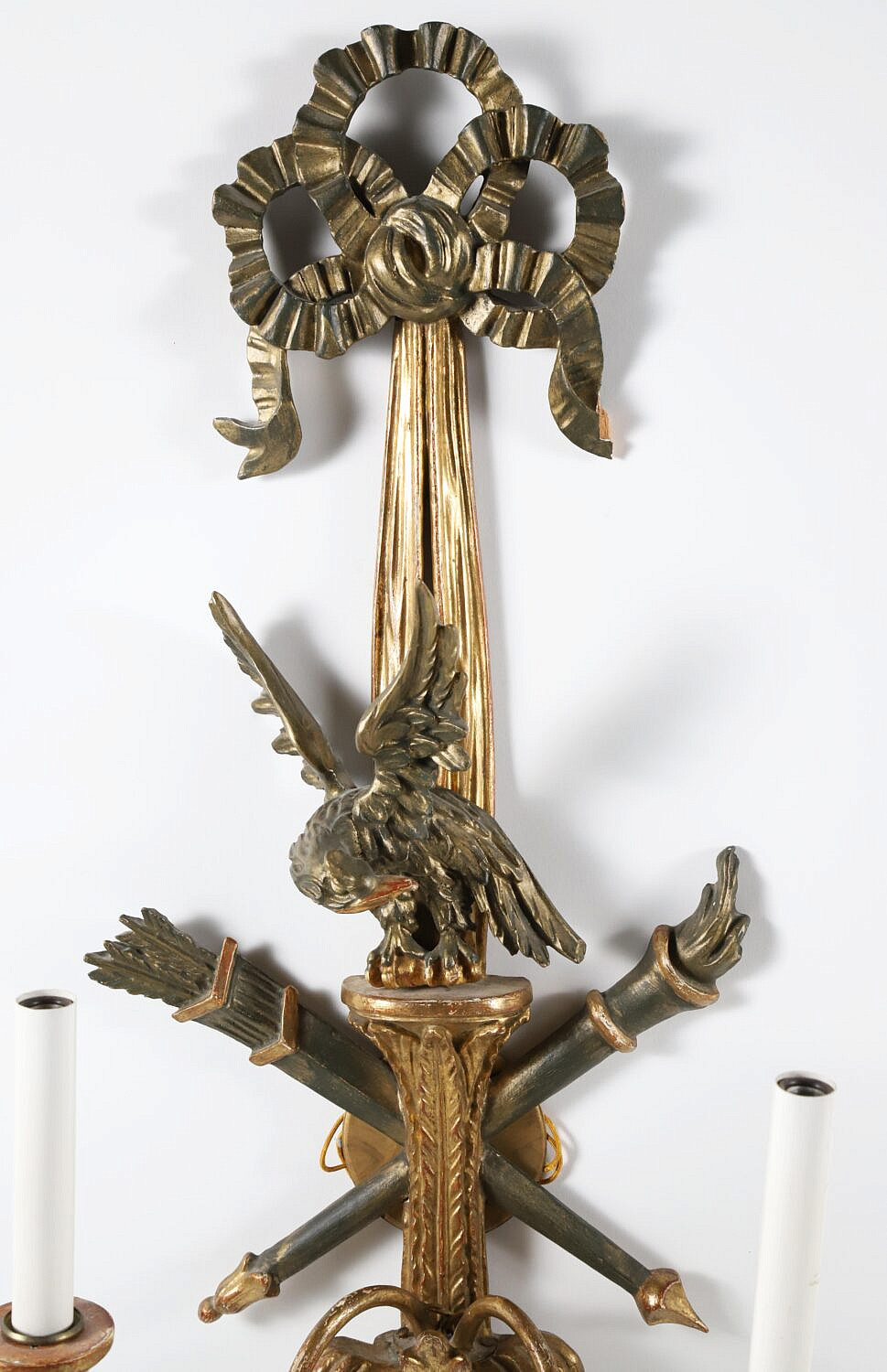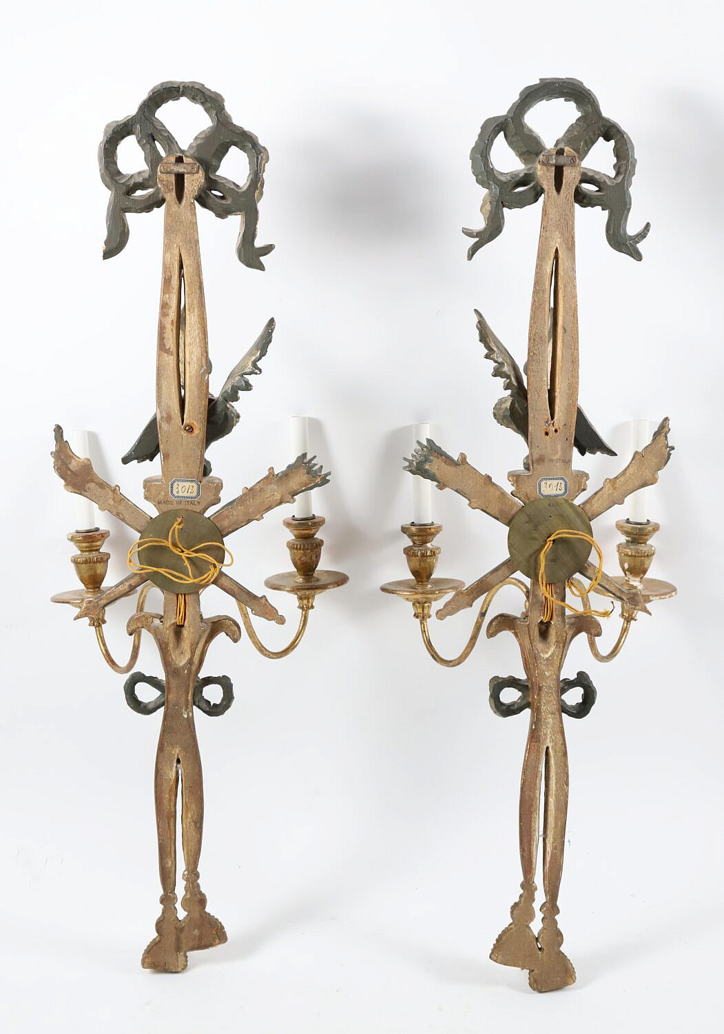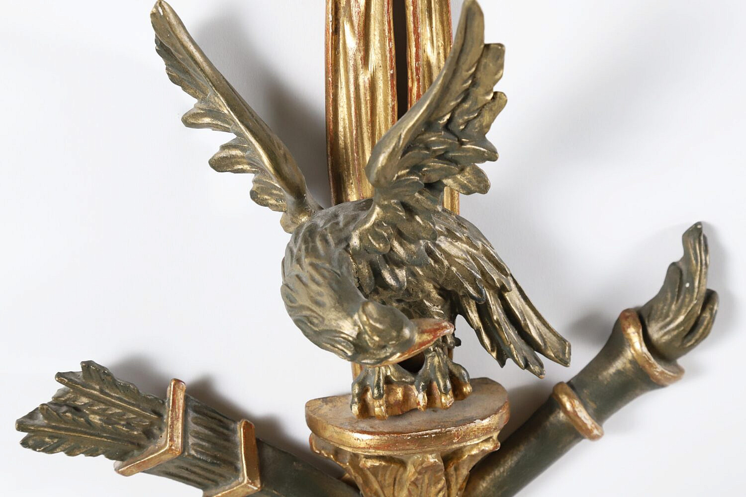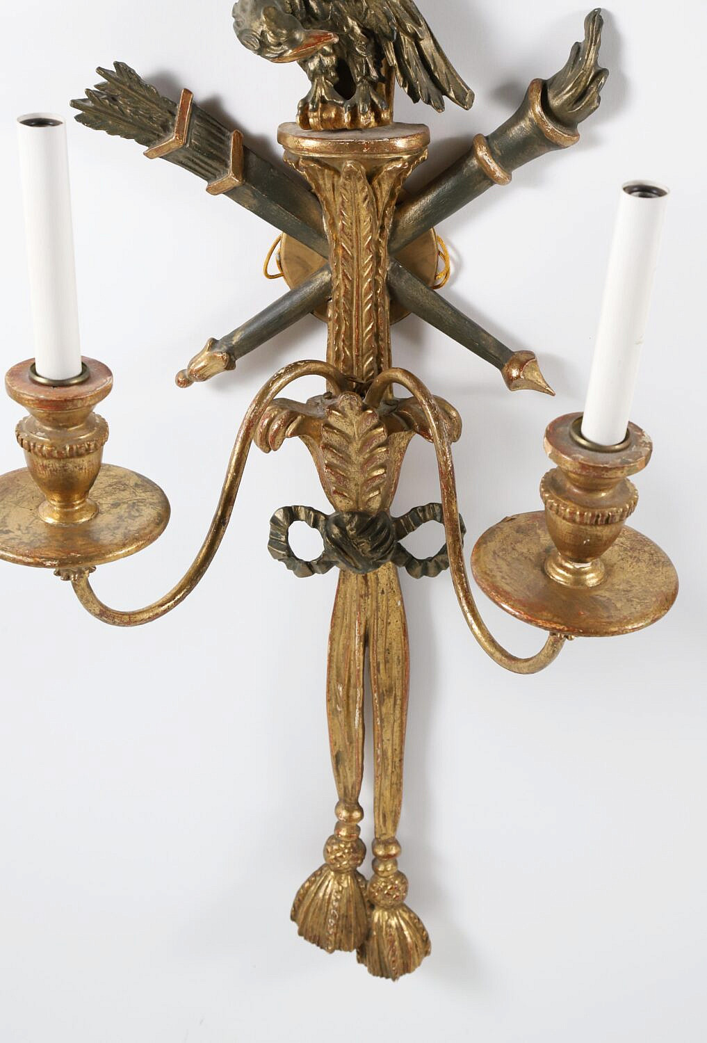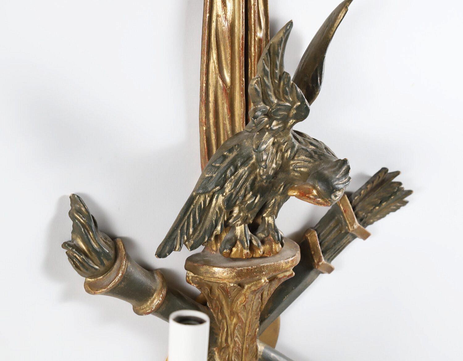 Vintage Pair of Italian Carved and Gilt Eagle Sconses, with ribbon pediment, aggressive posture eagle, cross torches above tasseled ribbon drop pediment