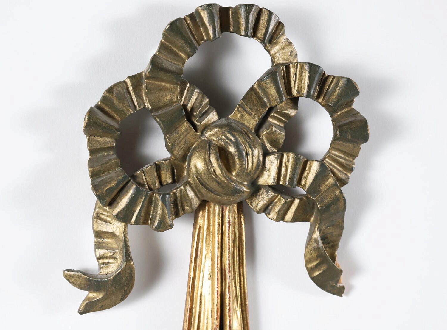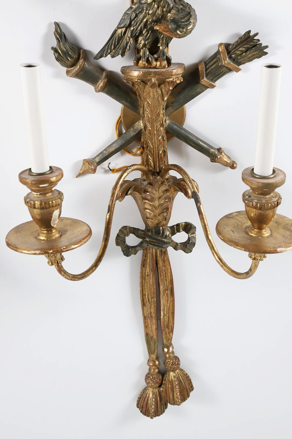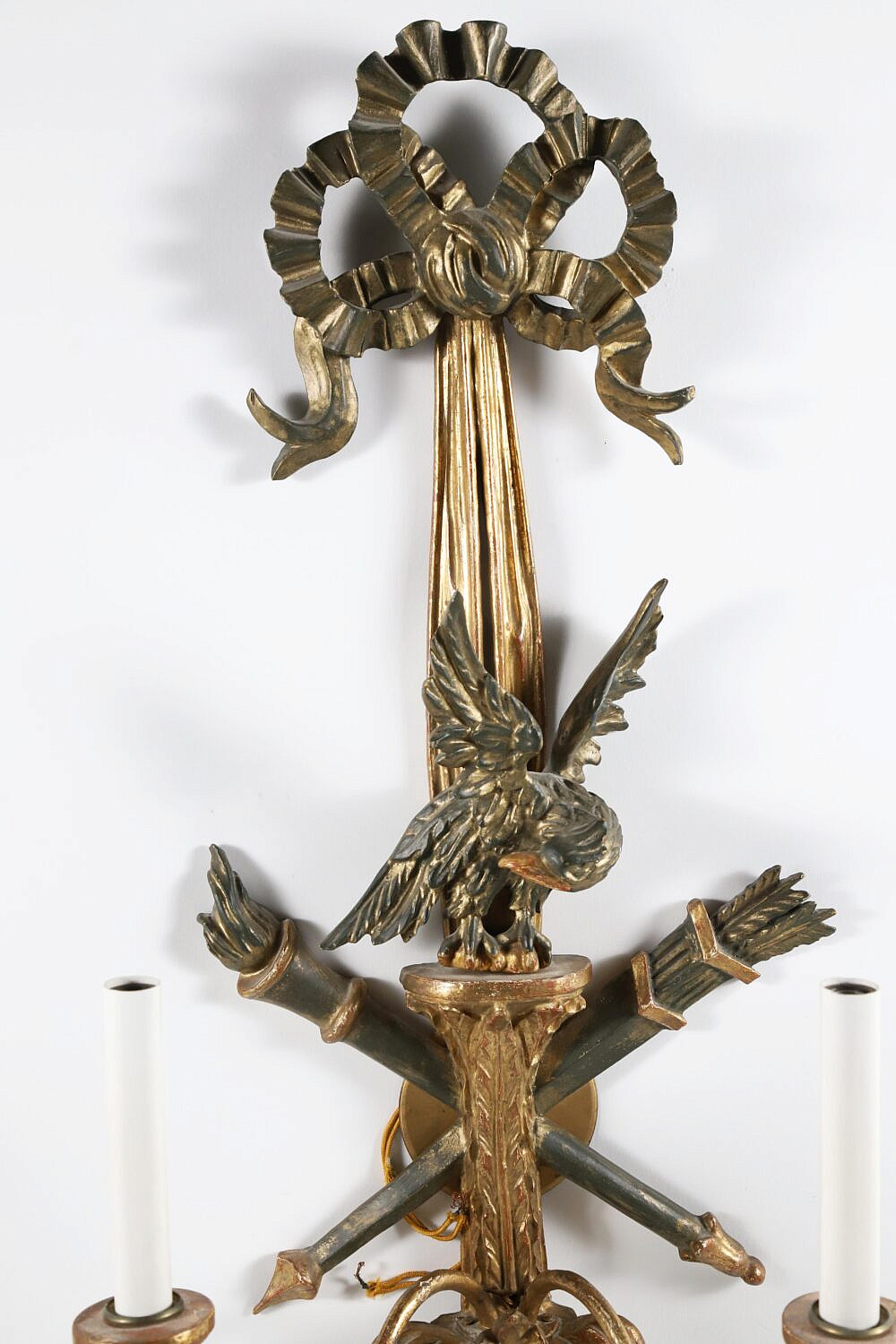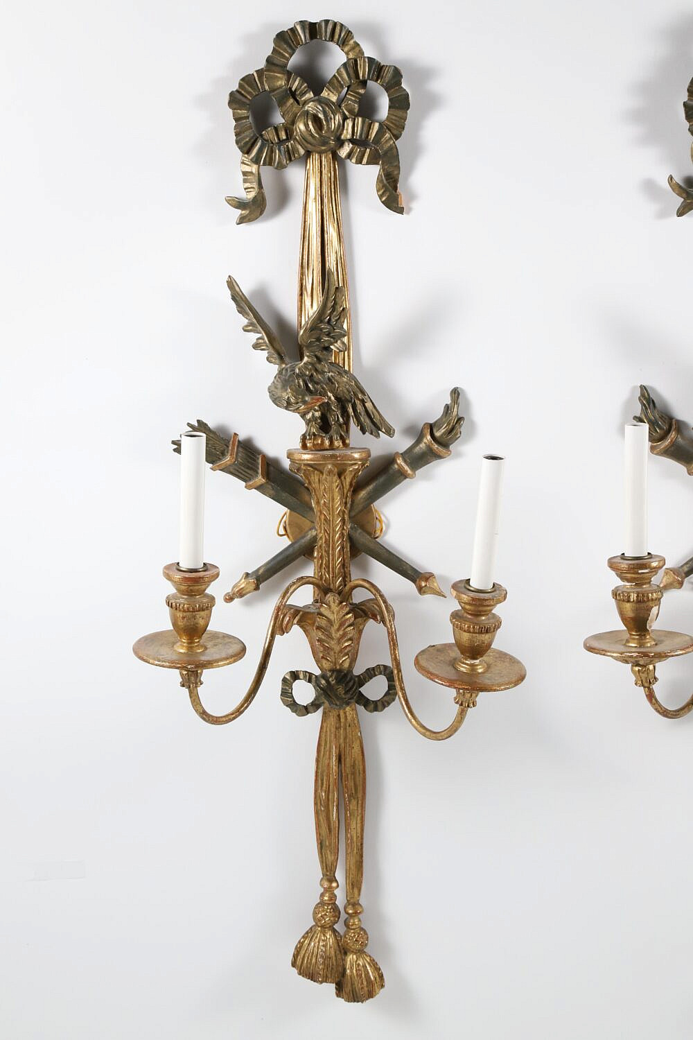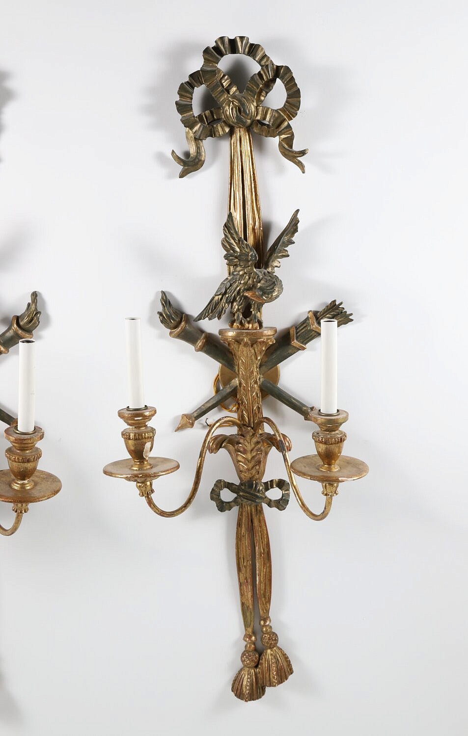 Vintage Pair of Italian Carved and Gilt Eagle Sconses, with ribbon pediment, aggressive posture eagle, cross torches above tasseled ribbon drop pediment