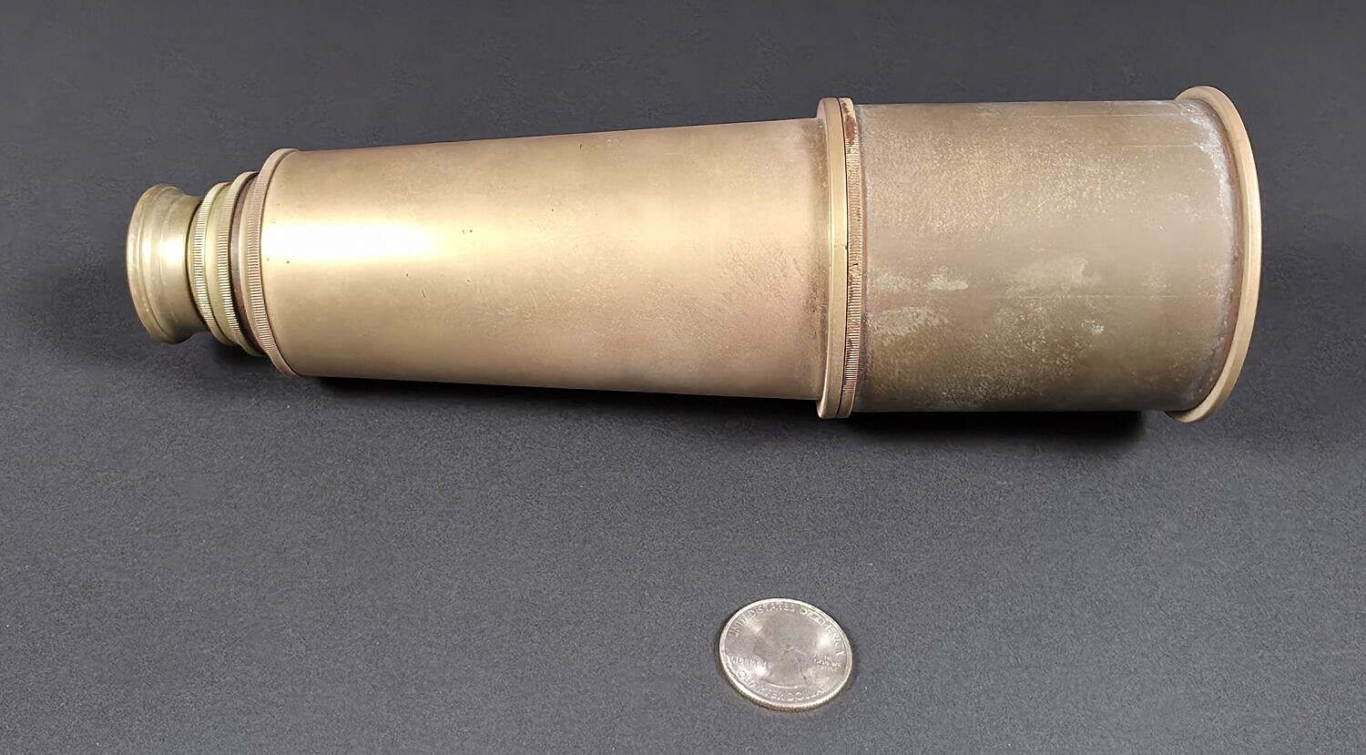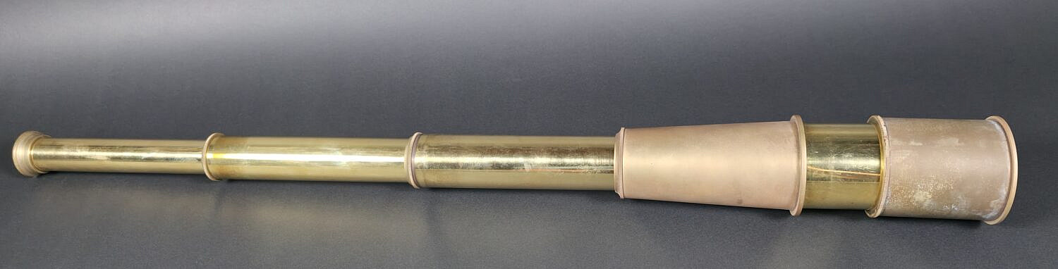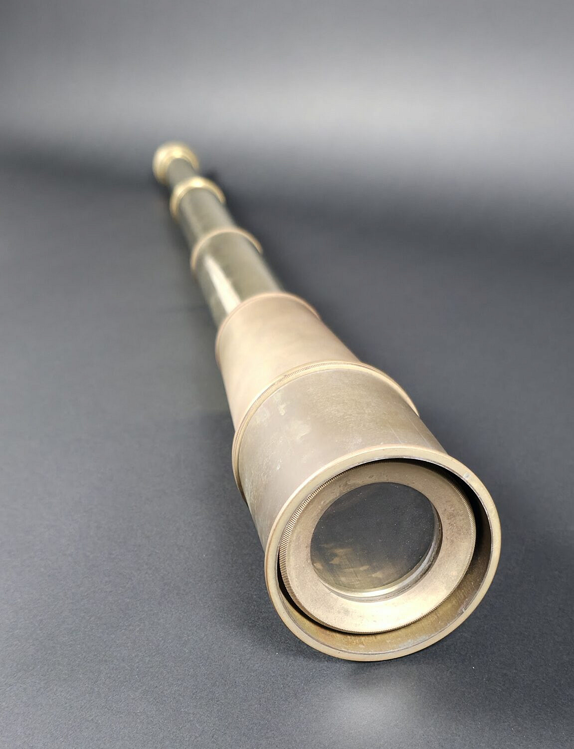 Vintage Three Draw Brass Captains Spyglass, unusual graduated form, with sun shade, accompanied by leather case.