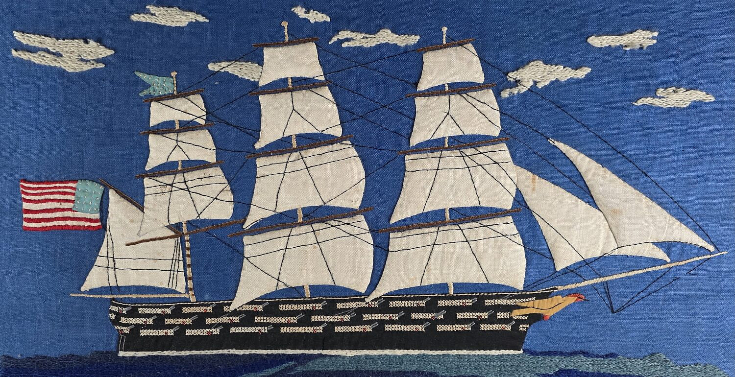 Vintage Three Masted American Clipper Ship Needlepoint Embroidery, 20th century