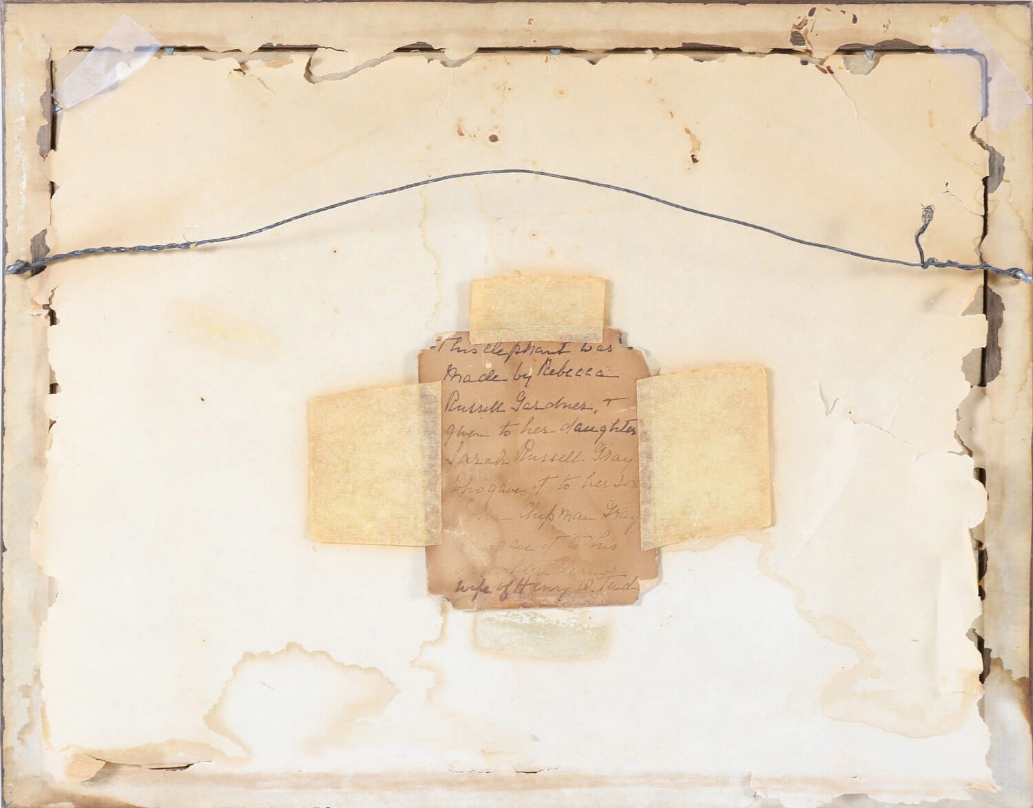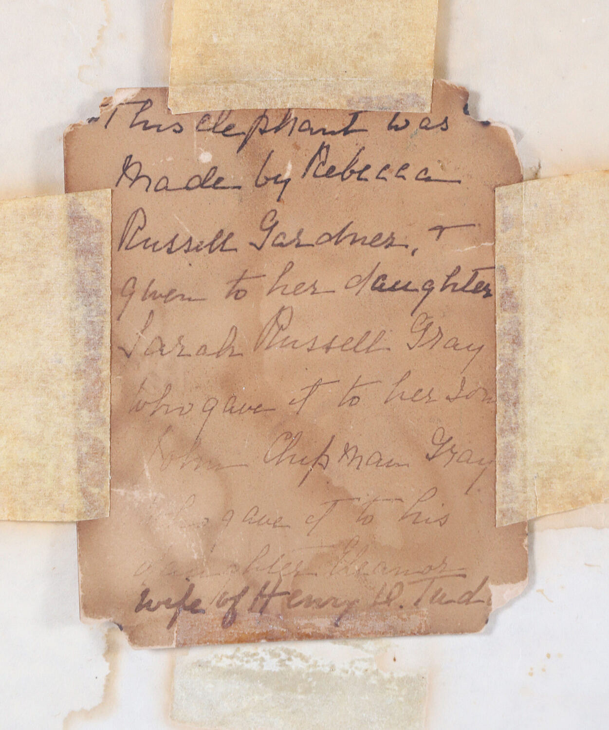 19th C. Needlework Depicting an Elephant, Made by Rebecca Russell Gardner Consign Now DeptDecorative Arts, Fine Arts, Textiles and QuiltsSize11 in. x 14 in. Framed 13 in. x 16 in. 19th C. Needlework Depicting an Elephant, Made by Rebecca Russell Gardner, with original handwritten Provenance on reverse 11 in. x 14 in. Framed 13 in. x 16 in. Please note that this auction has ended. Click here for an overview of this auction.