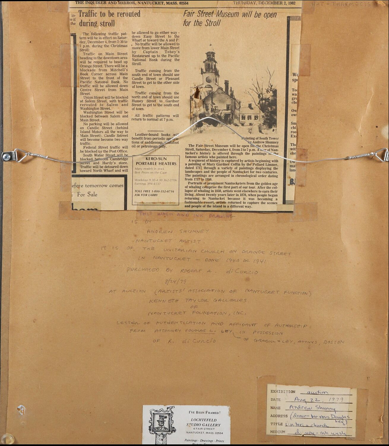 Andrew Shunney Ink Wash Drawing “Unitarian Church, Nantucket” Consign Now ArtistAndrew Shunney (1916-1978)Click here for artist bioDeptFine Arts, Nantucket ArtSize12 in. x 10 in. Framed 18.5 in. 15.5 in. Andrew Shunney (1916-1978) Ink Wash Drawing “Unitarian Church, Nantucket”, authentication en verso, matted and framed 12 in. x 10 in. Framed 18.5 in. 15.5 in. Please note that this auction has ended. Click here for an overview of this auction.