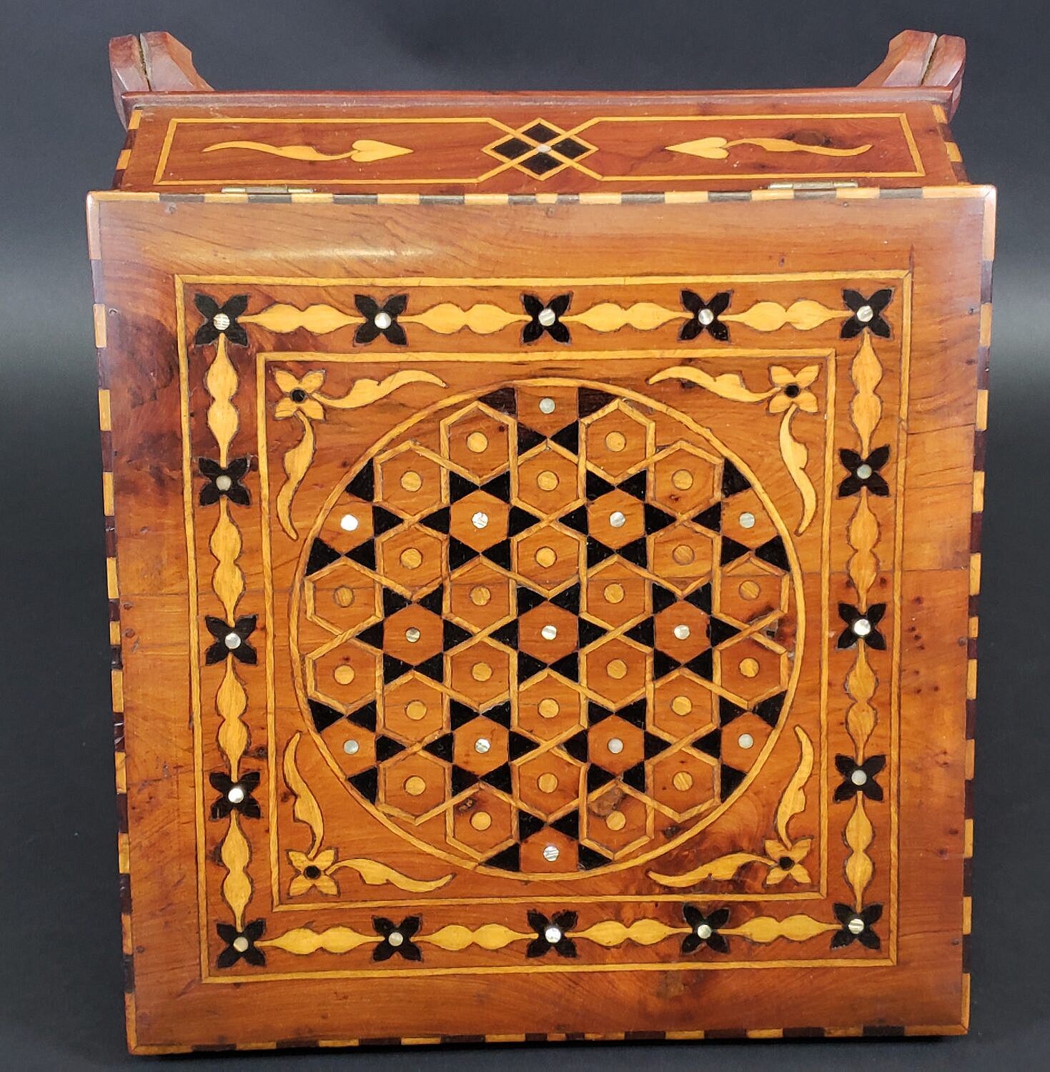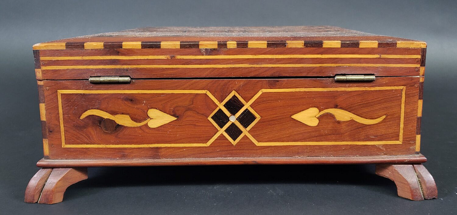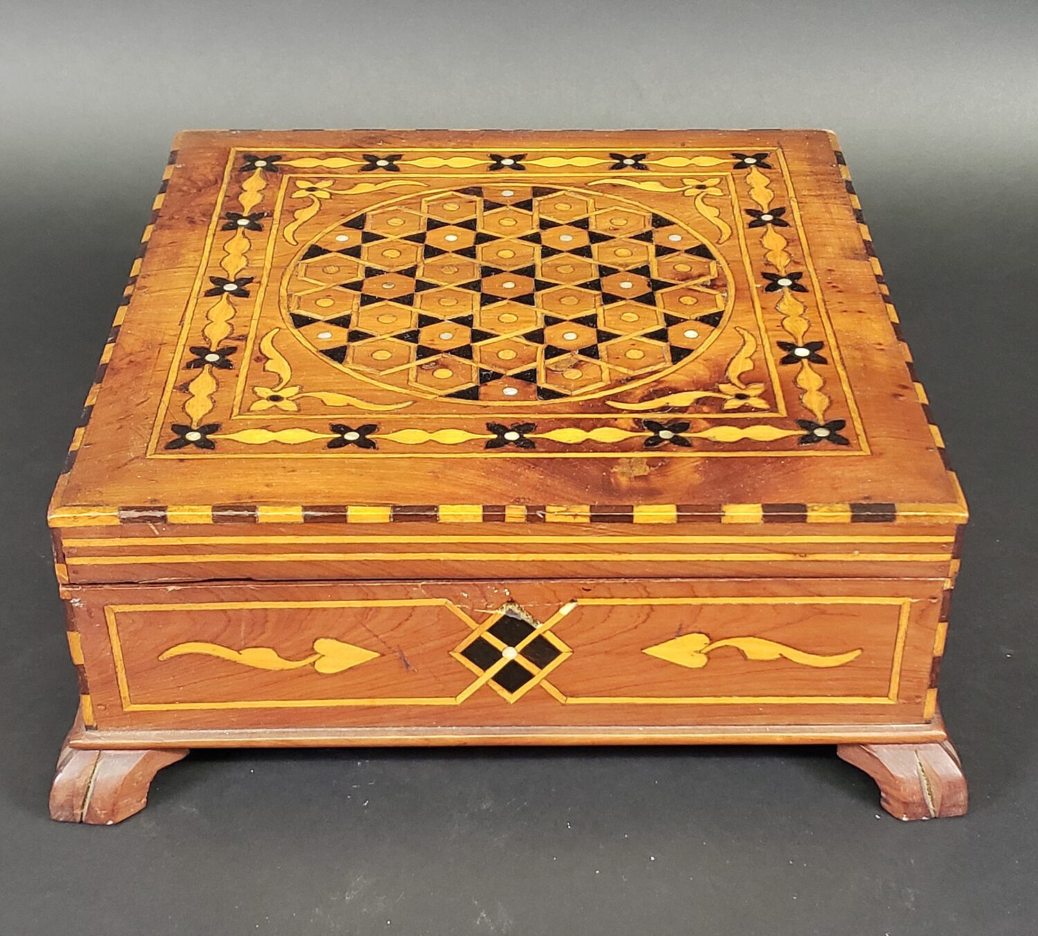 Antique Geometric Exotic Multiwood and Mother of Pearl Inlaid Box Consign Now DeptAmericana and Folk Arts, Decorative Arts, Furniture/Decorative ArtsSizeHeight 4 in. Width 4 in. Depth 4 in. Antique Geometric Exotic Multiwood and Mother of Pearl Inlaid Box, with compartmentalized removable inner tray, on carved feet. Height 4 in. Width 4 in. Depth 4 in. Please note that this auction has ended. Click here for an overview of this auction.