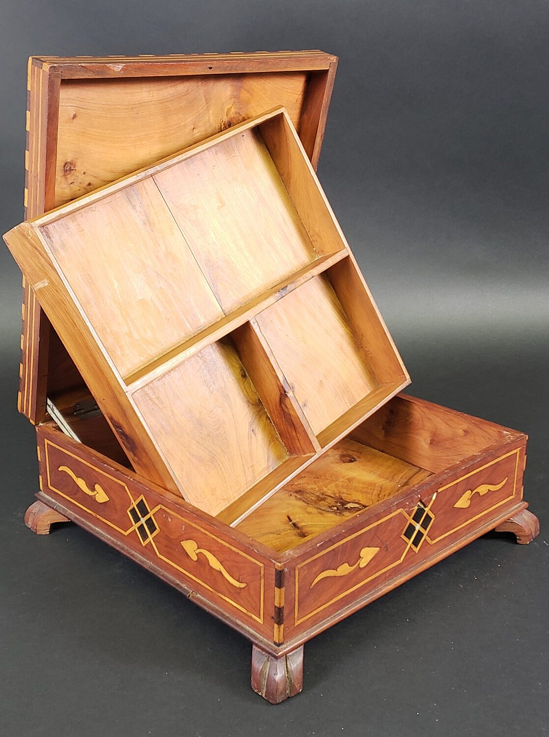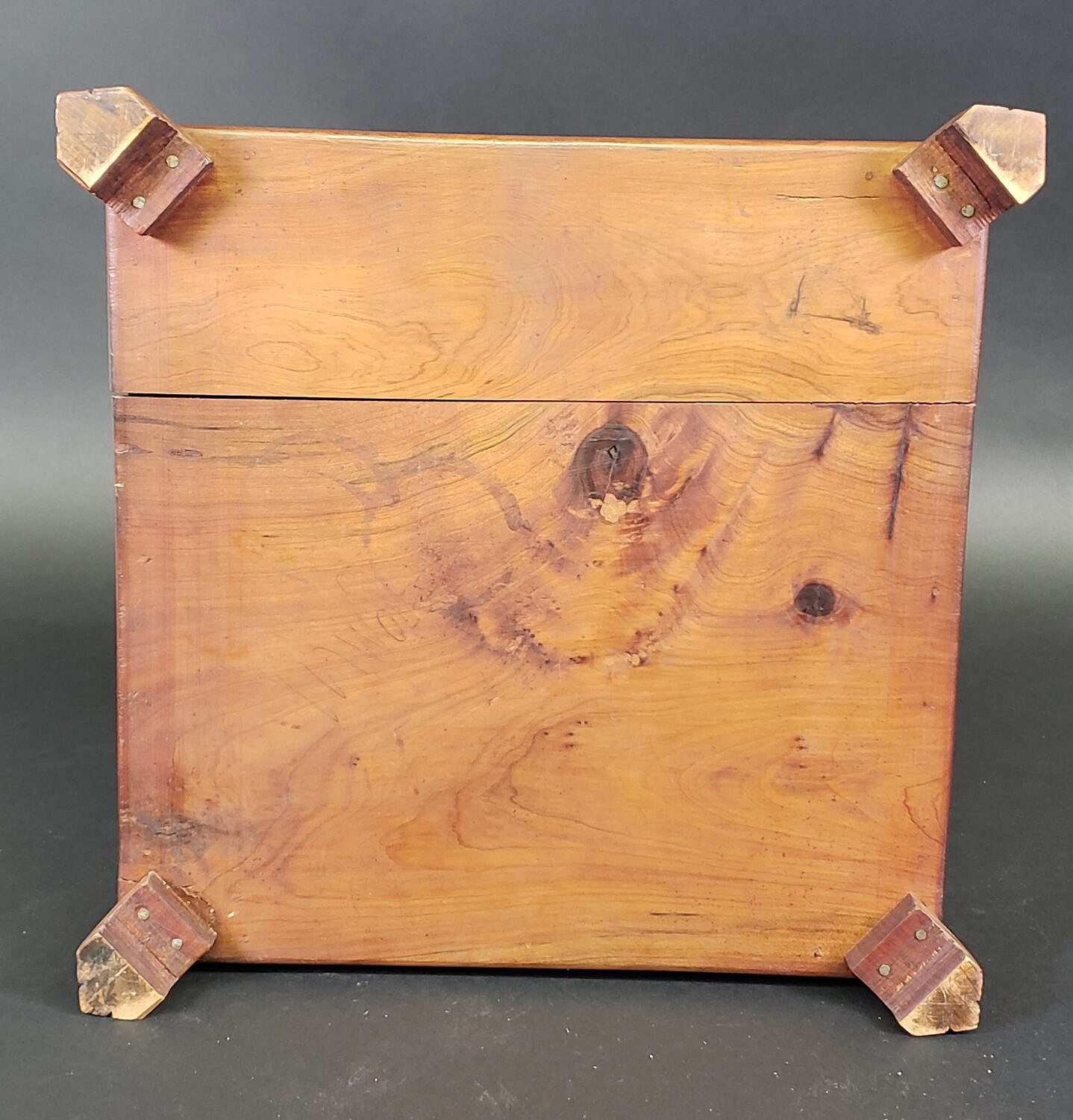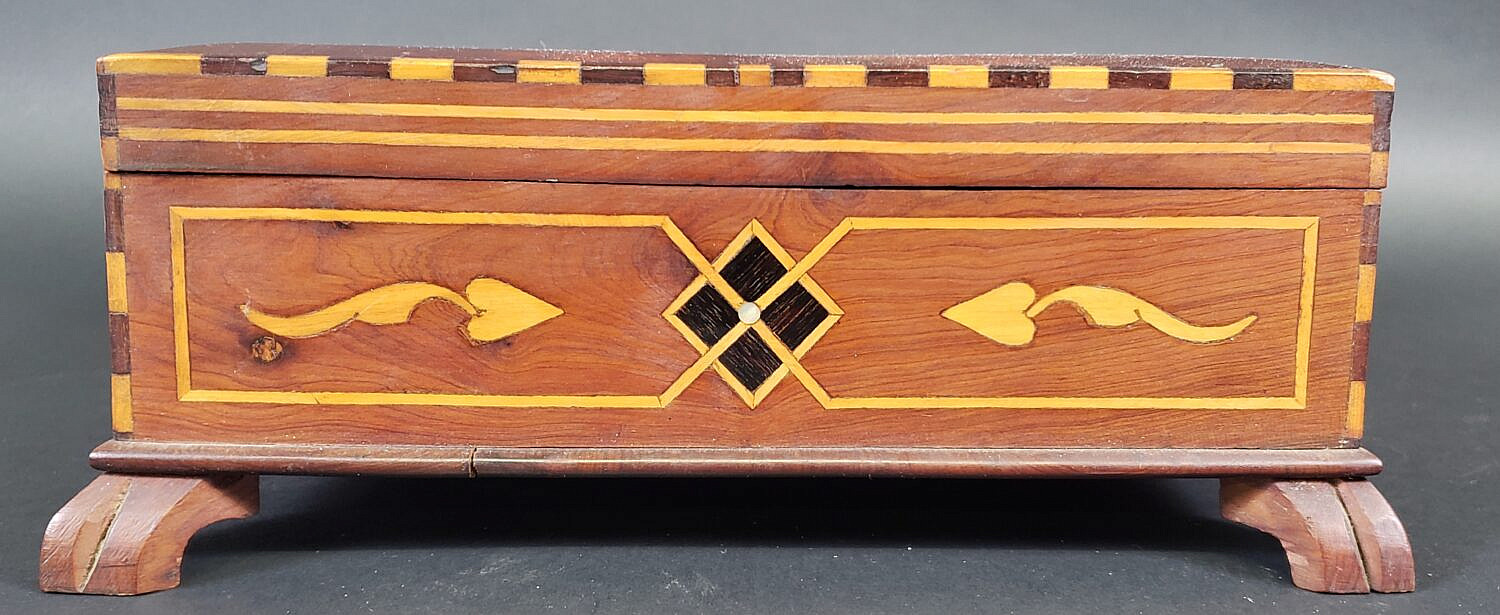 Antique Geometric Exotic Multiwood and Mother of Pearl Inlaid Box Consign Now DeptAmericana and Folk Arts, Decorative Arts, Furniture/Decorative ArtsSizeHeight 4 in. Width 4 in. Depth 4 in. Antique Geometric Exotic Multiwood and Mother of Pearl Inlaid Box, with compartmentalized removable inner tray, on carved feet. Height 4 in. Width 4 in. Depth 4 in. Please note that this auction has ended. Click here for an overview of this auction.