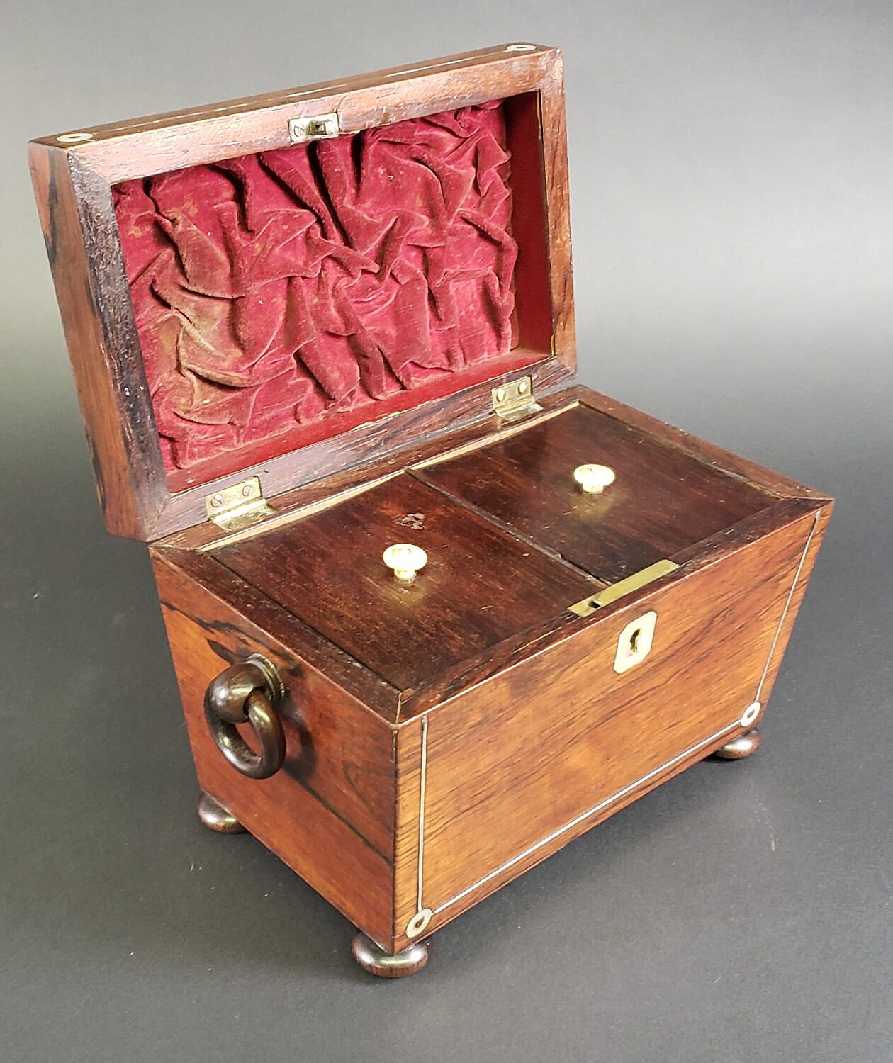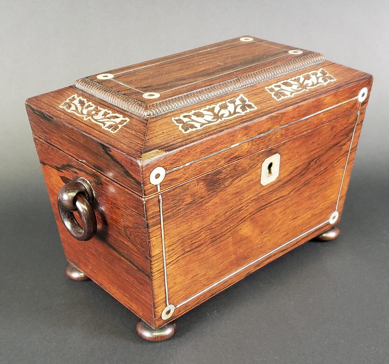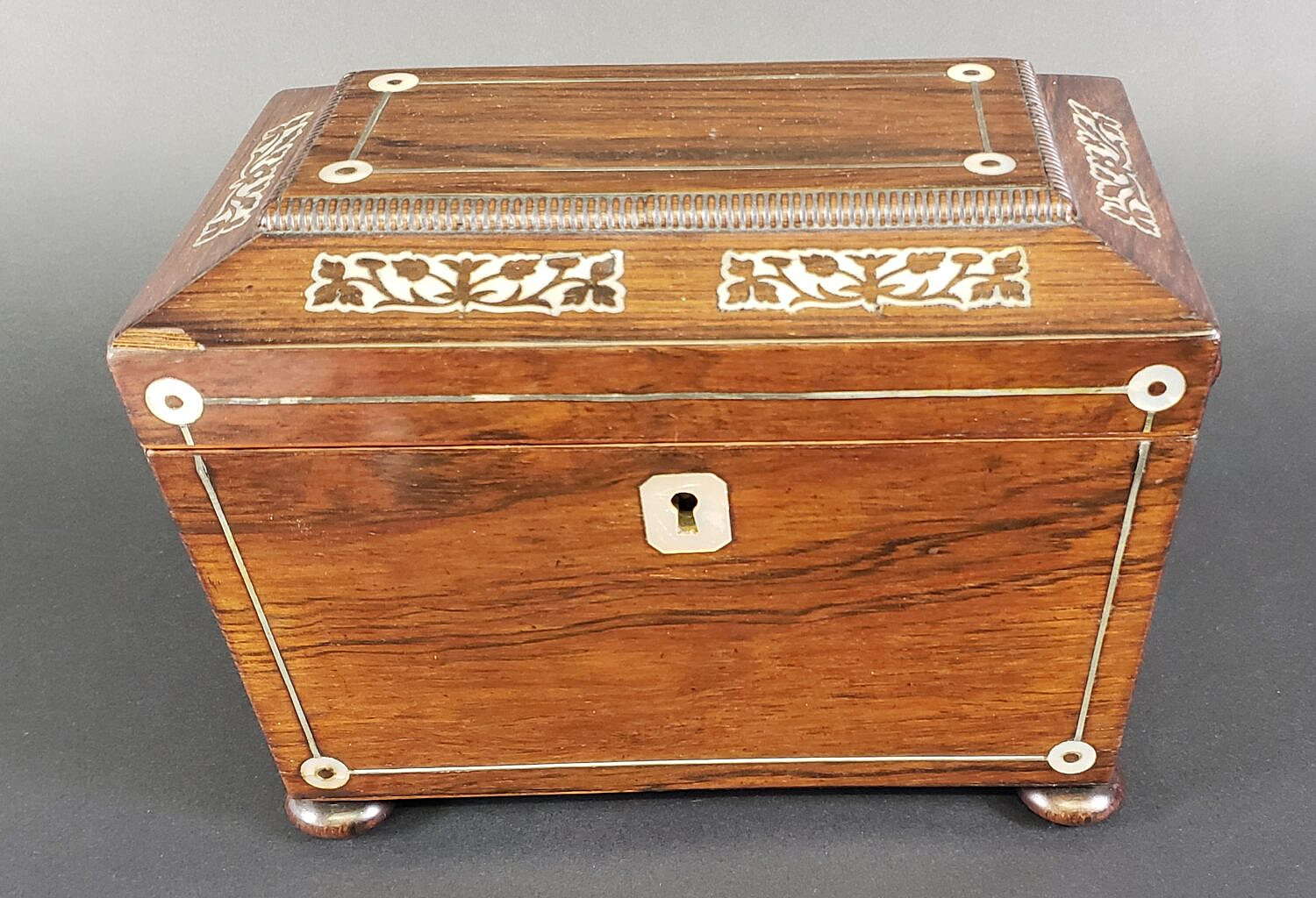 Antique Mother of Pearl Inlaid Double Compartment Tea Caddy, 19th century Consign Now DeptDecorative ArtsSizeHeight 6 in. Width 8.75 in. Depth 4.75 in. Antique Mother of Pearl Inlaid Double Compartment Tea Caddy, 19th century, exotic wood case with individual inner lids, and flanking carved loop handles on bun feet. Height 6 in. Width 8.75 in. Depth 4.75 in. Please note that this auction has ended. Click here for an overview of this auction.