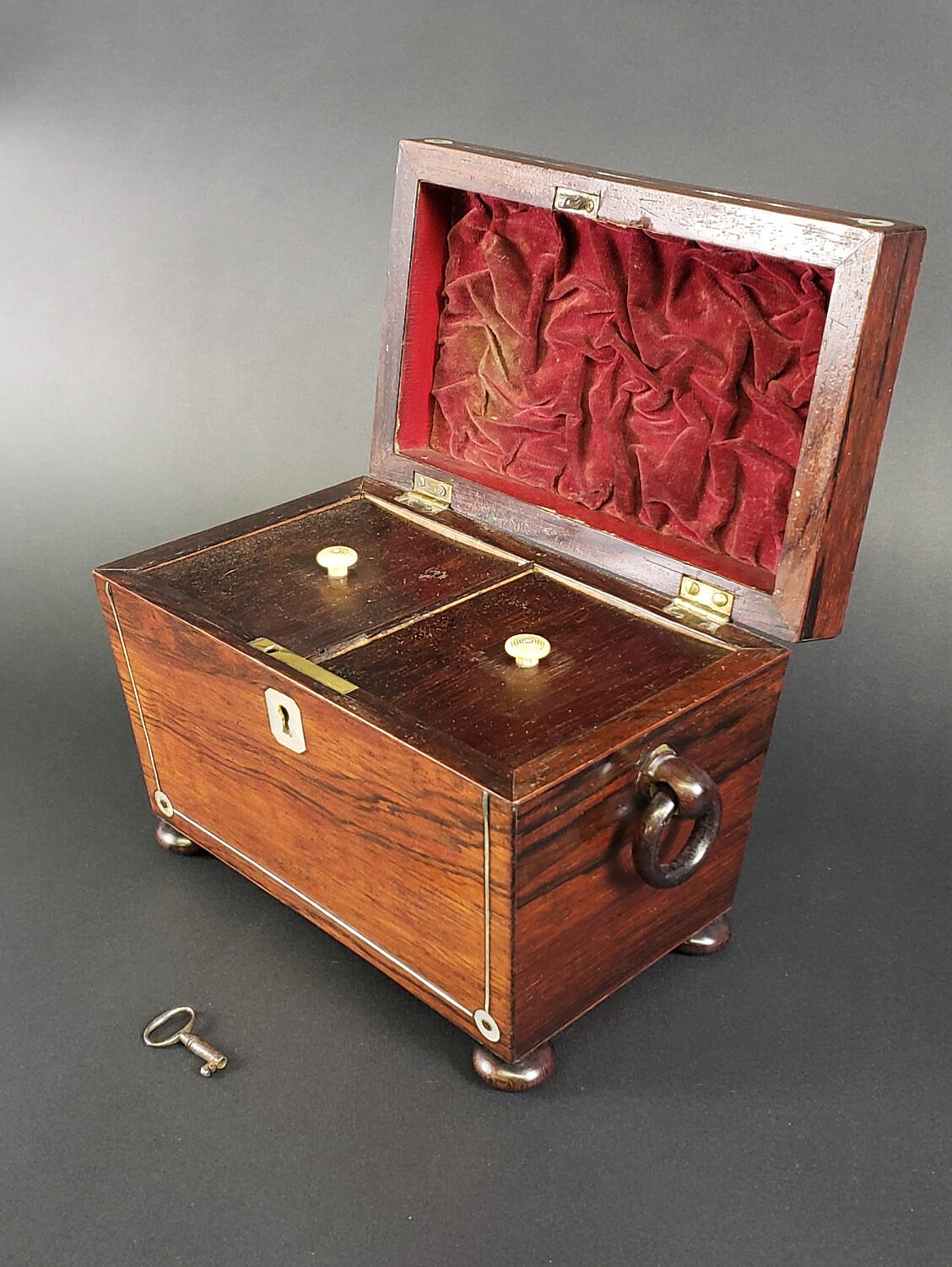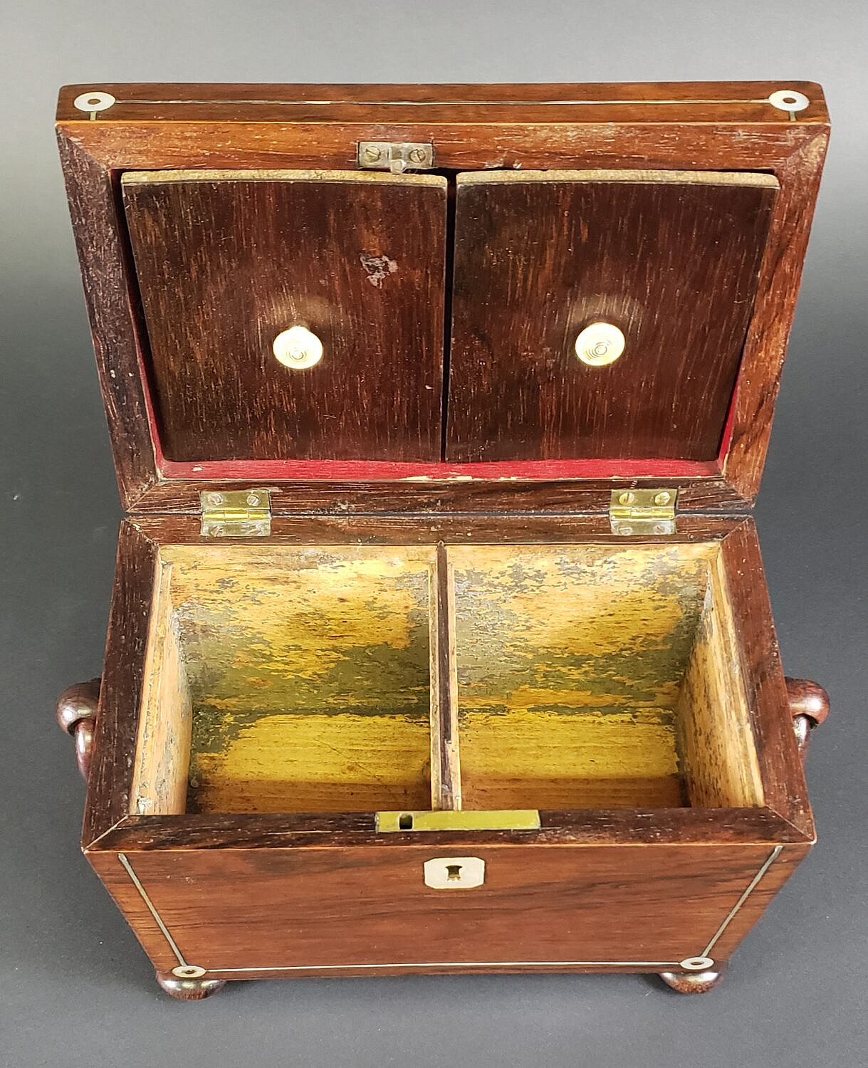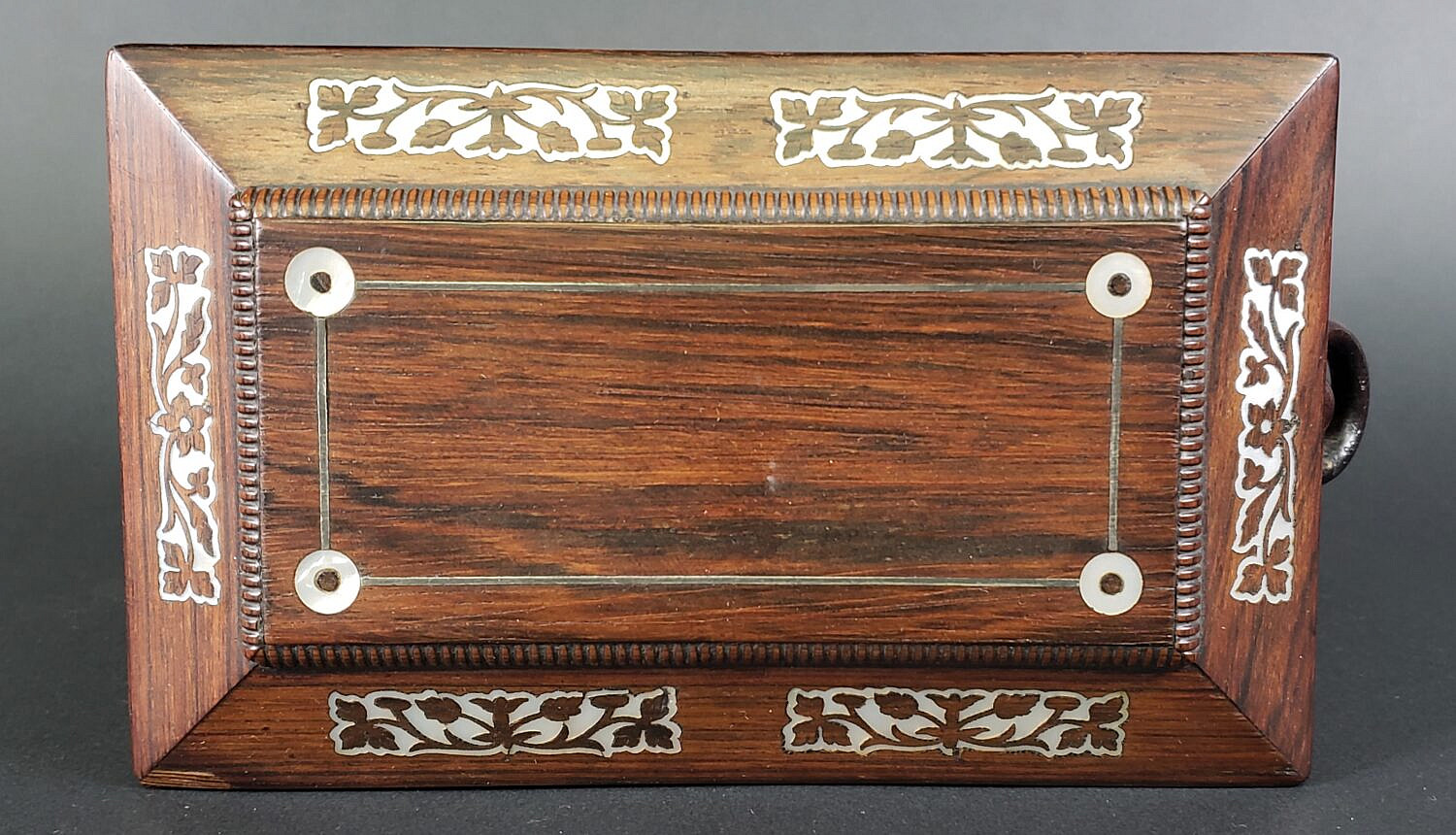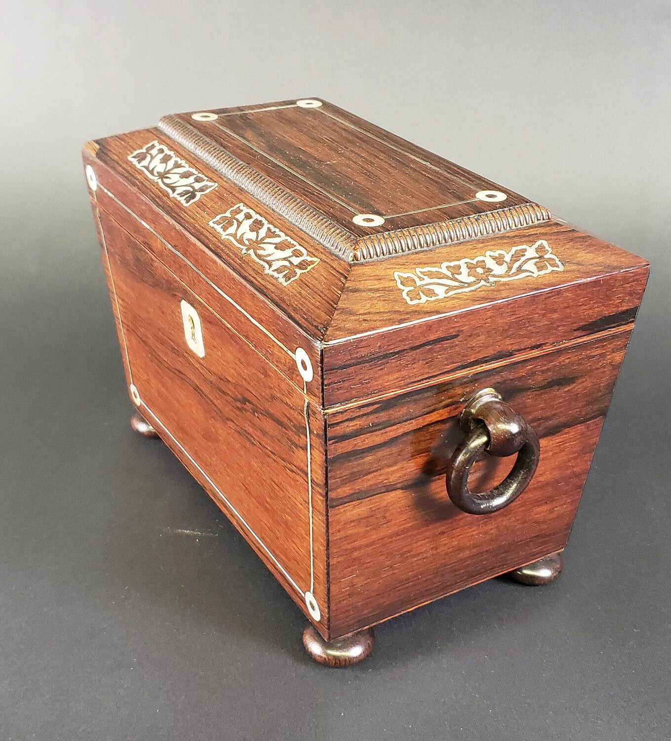 Antique Mother of Pearl Inlaid Double Compartment Tea Caddy, 19th century Consign Now DeptDecorative ArtsSizeHeight 6 in. Width 8.75 in. Depth 4.75 in. Antique Mother of Pearl Inlaid Double Compartment Tea Caddy, 19th century, exotic wood case with individual inner lids, and flanking carved loop handles on bun feet. Height 6 in. Width 8.75 in. Depth 4.75 in. Please note that this auction has ended. Click here for an overview of this auction.