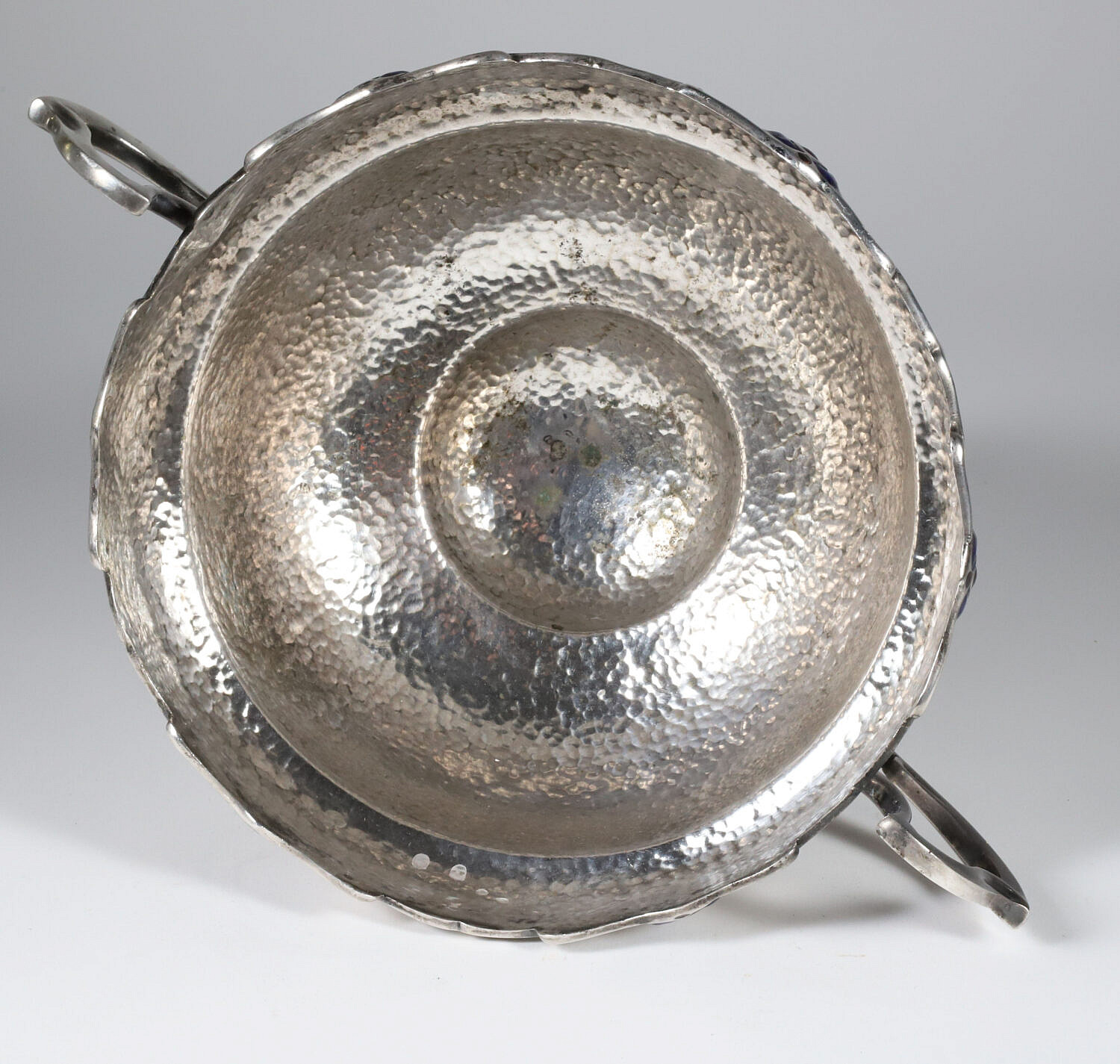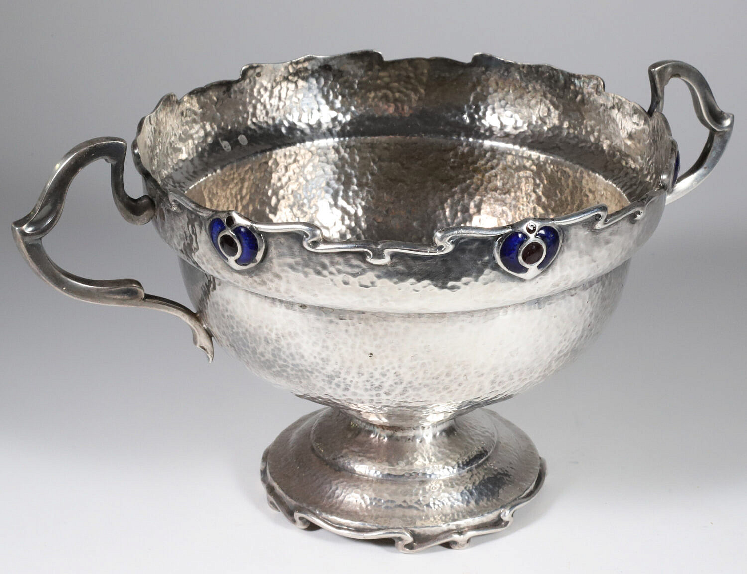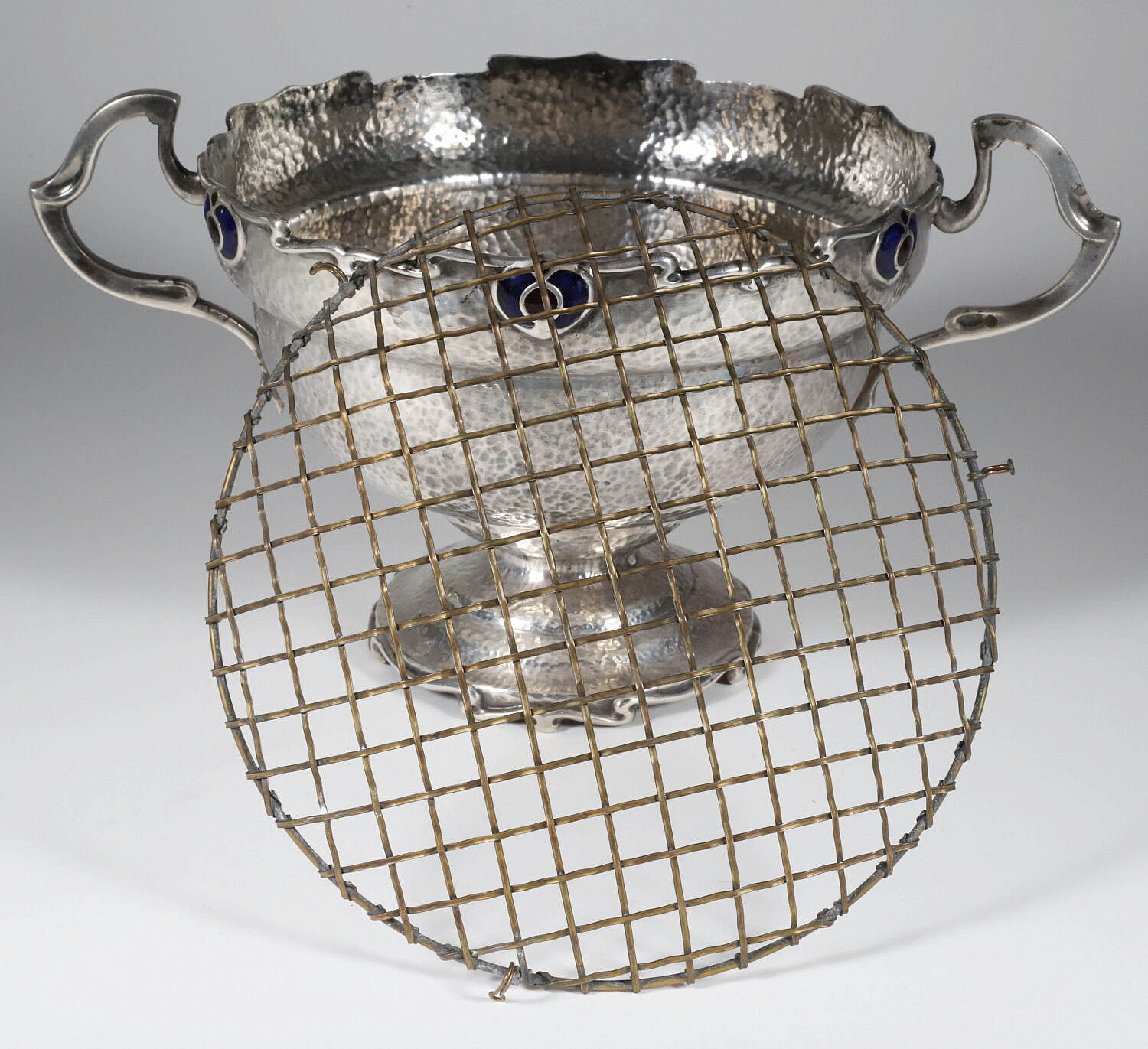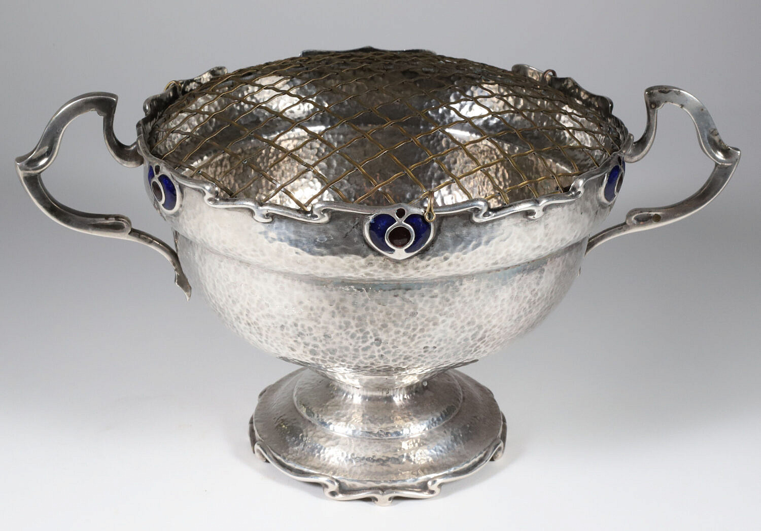 Antique Sheffield “Art Nouveau” Hand Hammered Pedestal Rose Bowl with Flower Frog Consign Now DeptDecorative Arts, SilverSizeHeight 6.25 in. Diameter 8 in. Antique Sheffield “Art Nouveau” Hand Hammered Pedestal Rose Bowl with Flower Frog, applied handles, cobalt enamel and custom floral cage Height 6.25 in. Diameter 8 in. Please note that this auction has ended. Click here for an overview of this auction.