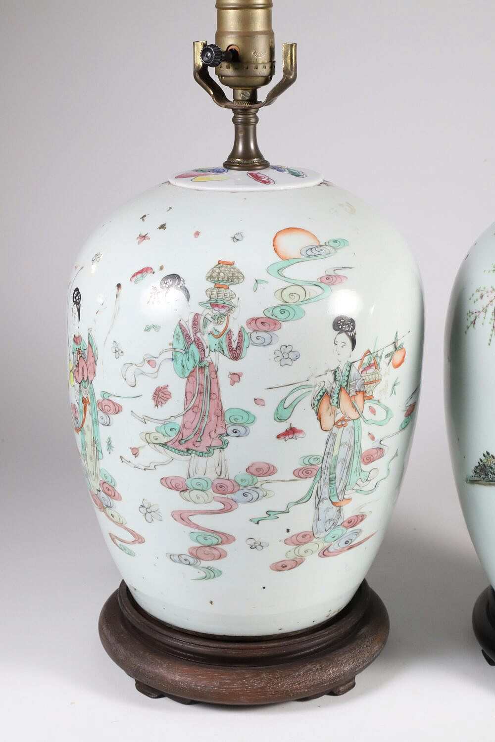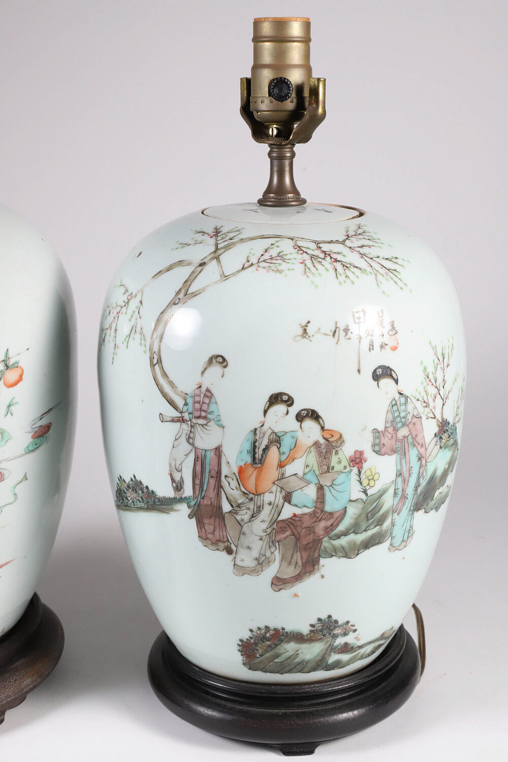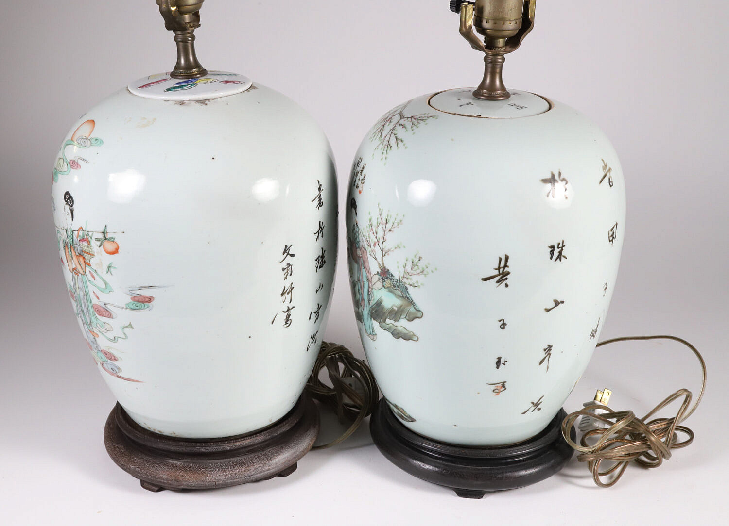 Associated Pair of Chinese Ginger Jars Mounted as Lamps Consign Now DeptAsian Arts/China Trade, Ceramics & Glass, Decorative Arts, Lighting/Candlesticks/SconcesSizeHeight 11 in. Associated Pair of Chinese Ginger Jars Mounted as Lamps, with painted figural and characters decorations, on teak wood bases Height 11 in. Provenance: Collection of Susan Akers, 7 Pleasant Street, Nantucket Island, Massachusetts Please note that this auction has ended. Click here for an overview of this auction.