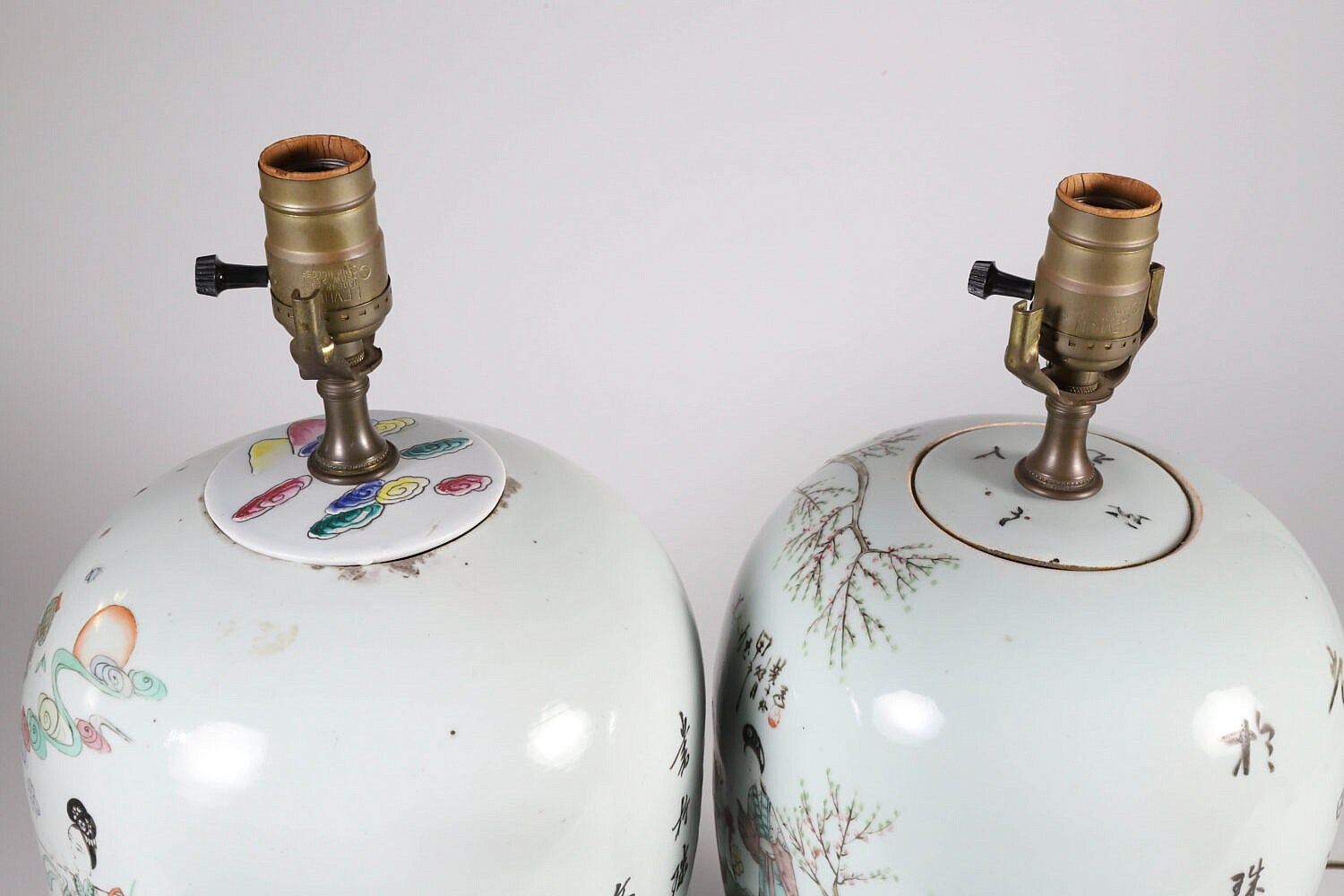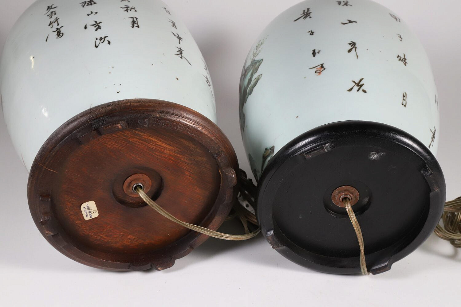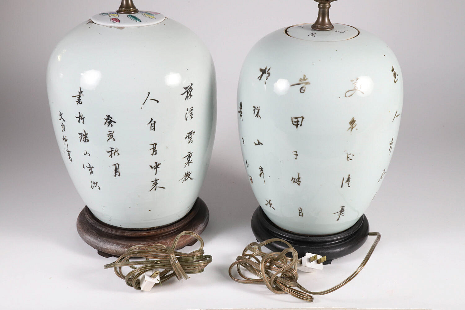 Associated Pair of Chinese Ginger Jars Mounted as Lamps Consign Now DeptAsian Arts/China Trade, Ceramics & Glass, Decorative Arts, Lighting/Candlesticks/SconcesSizeHeight 11 in. Associated Pair of Chinese Ginger Jars Mounted as Lamps, with painted figural and characters decorations, on teak wood bases Height 11 in. Provenance: Collection of Susan Akers, 7 Pleasant Street, Nantucket Island, Massachusetts Please note that this auction has ended. Click here for an overview of this auction.