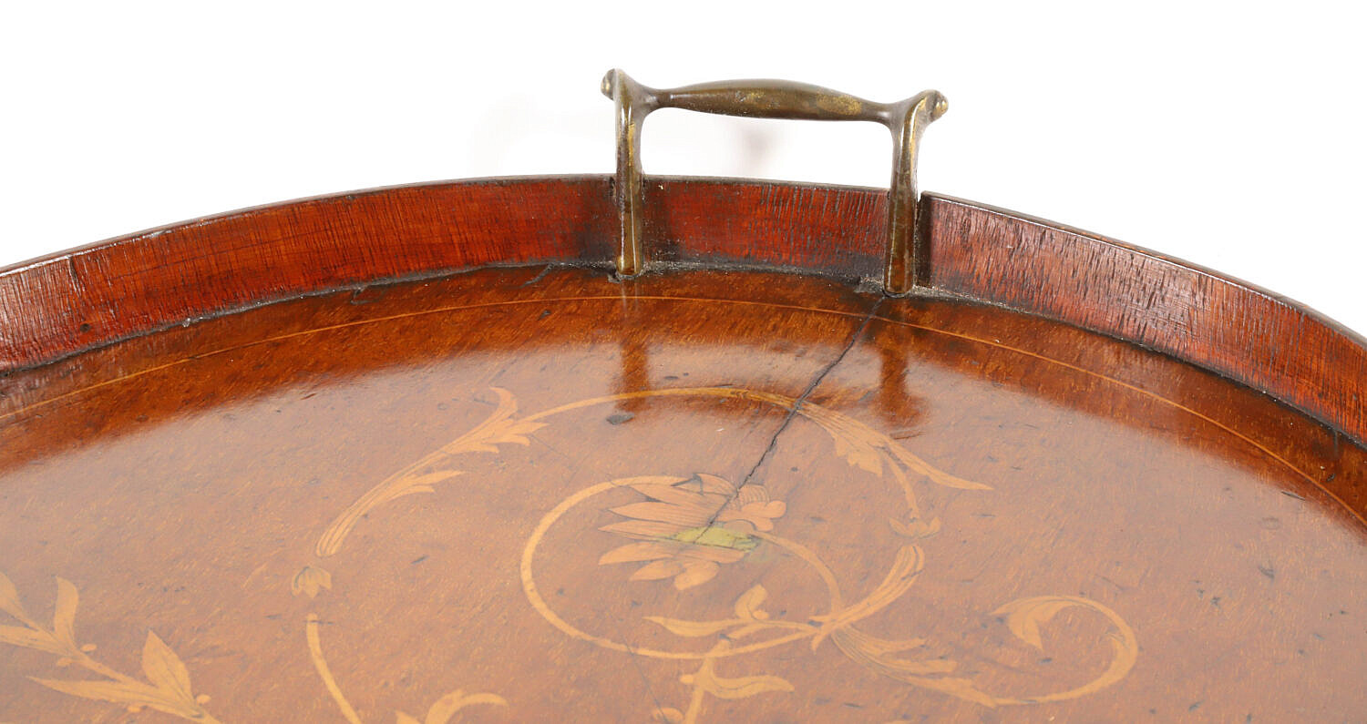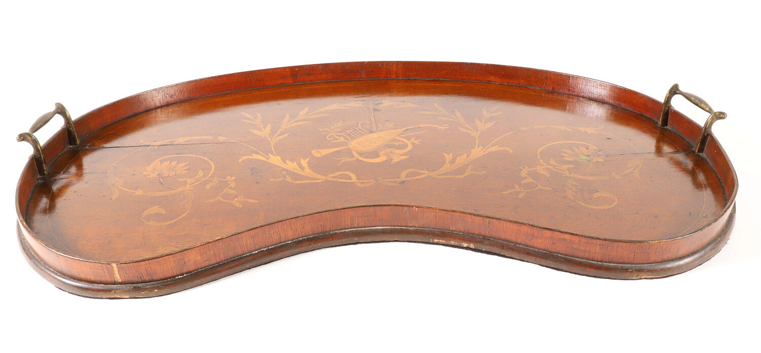 Edwardian Mahogany Marquetry Inlaid Kidney Shaped Serving Tray Consign Now DeptDecorative ArtsSize27 in. x 14 in. Edwardian Mahogany Marquetry Inlaid Kidney Shaped Serving Tray, with two brass handles 27 in. x 14 in. Please note that this auction has ended. Click here for an overview of this auction.