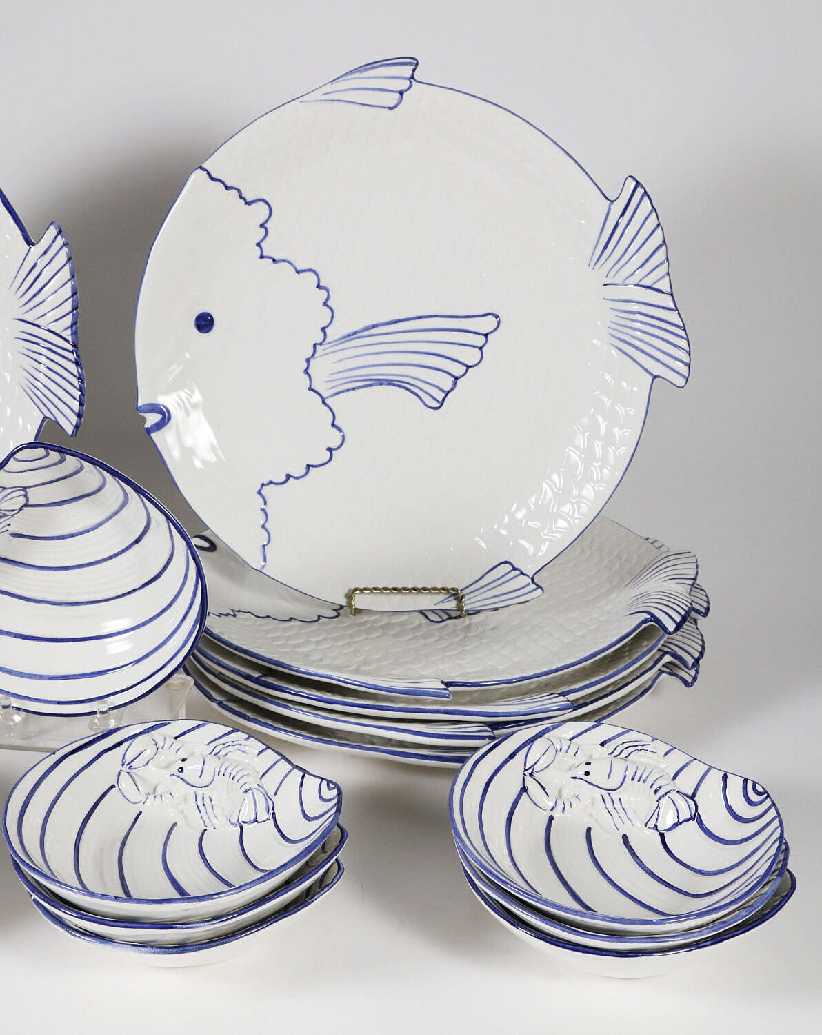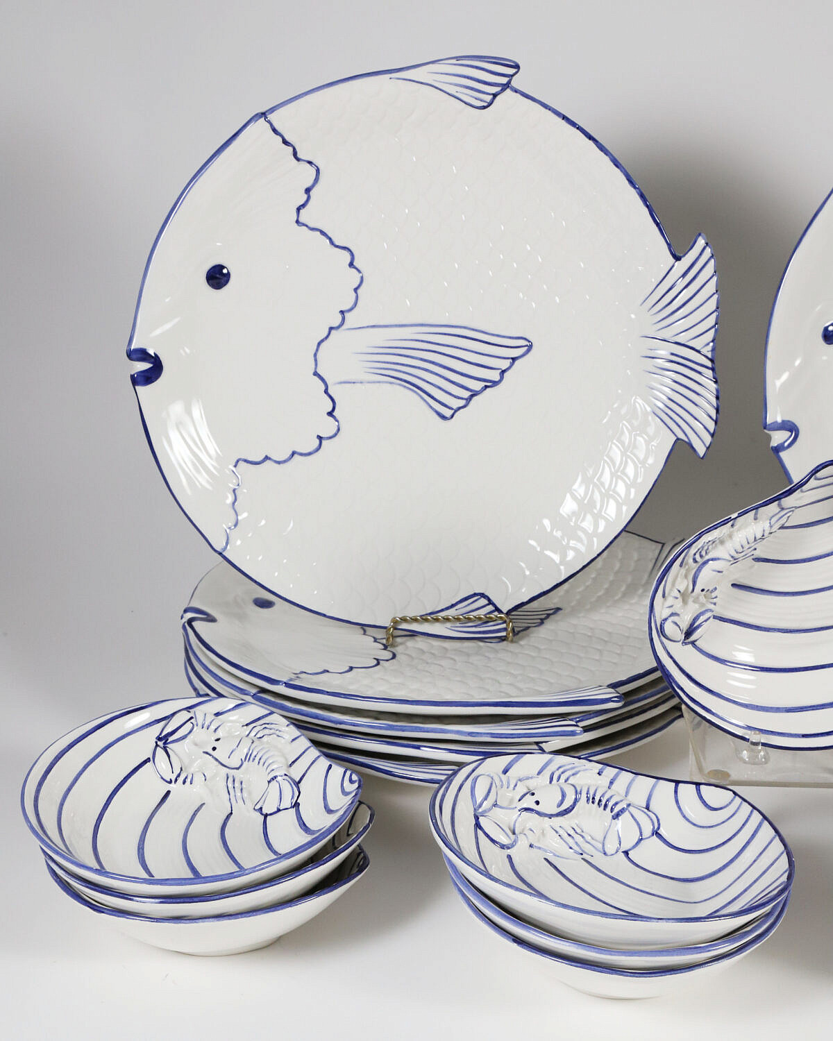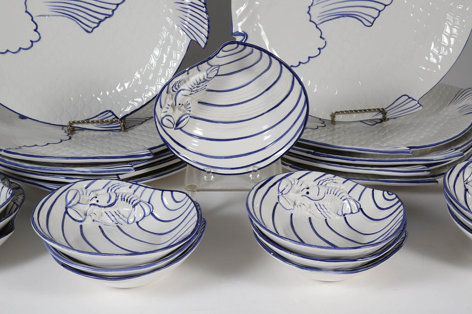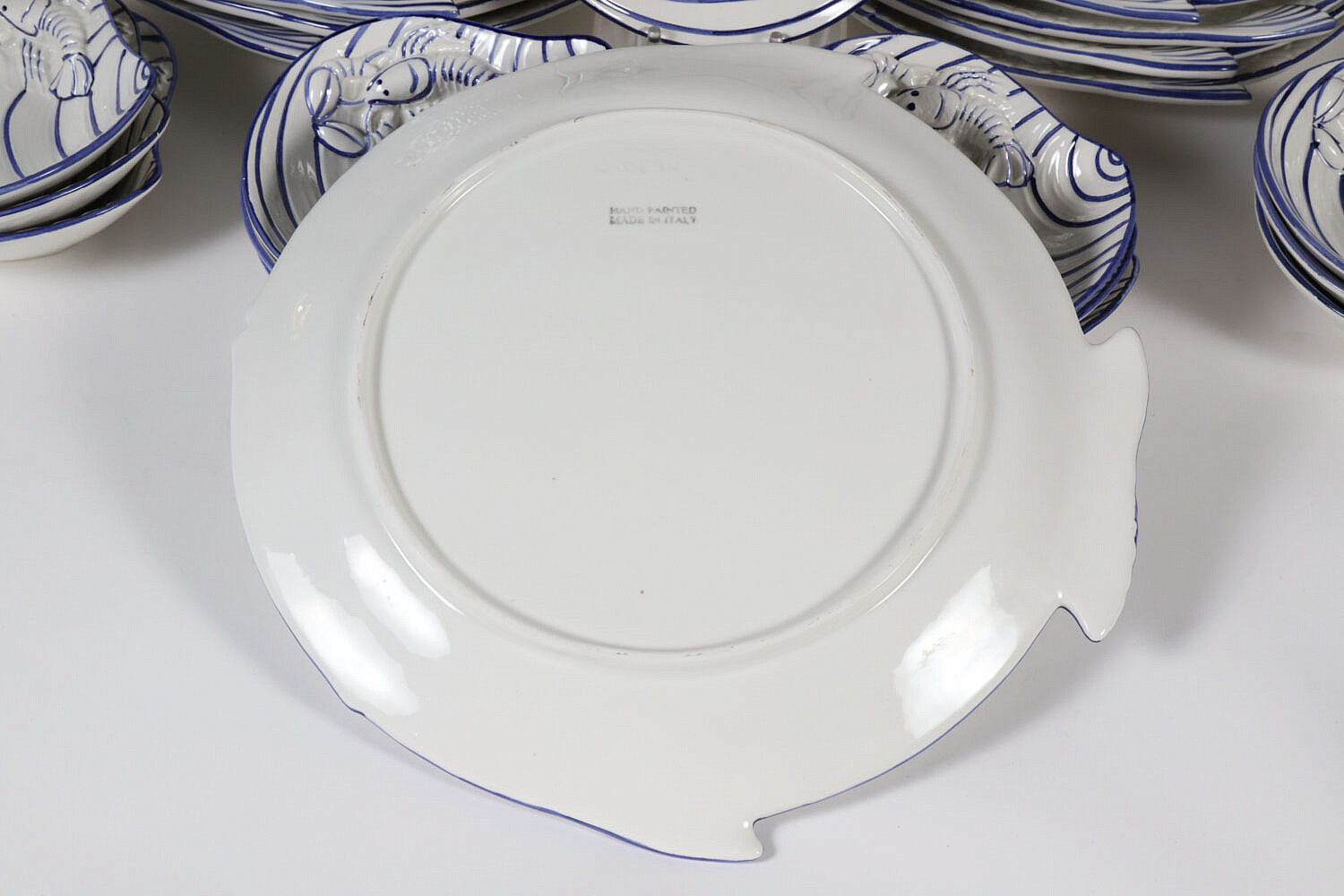 Italian Ceramic Blue and White Dinner Service Comprising: ten fish-form plates and thirteen clamshell form bowls with applied lobsters, stamped underneath: Made in Italy
