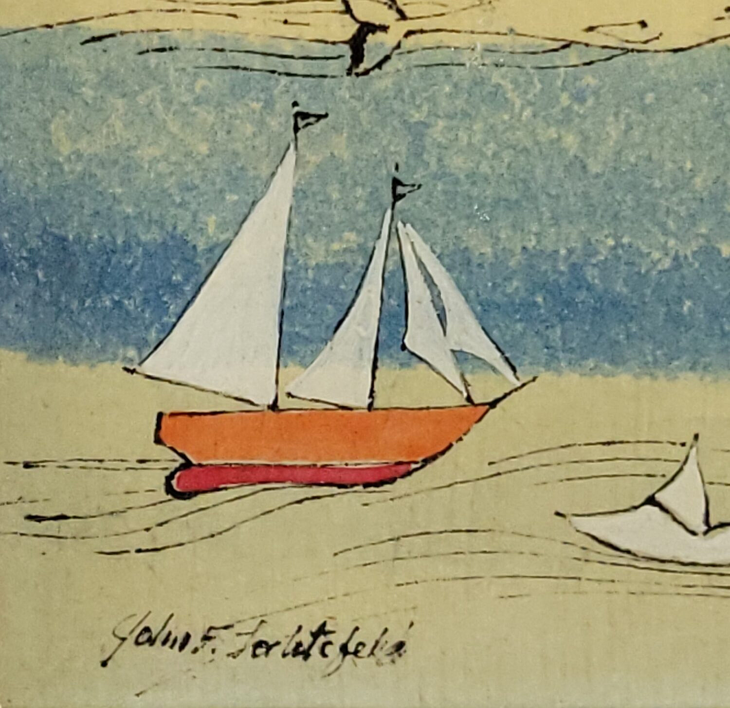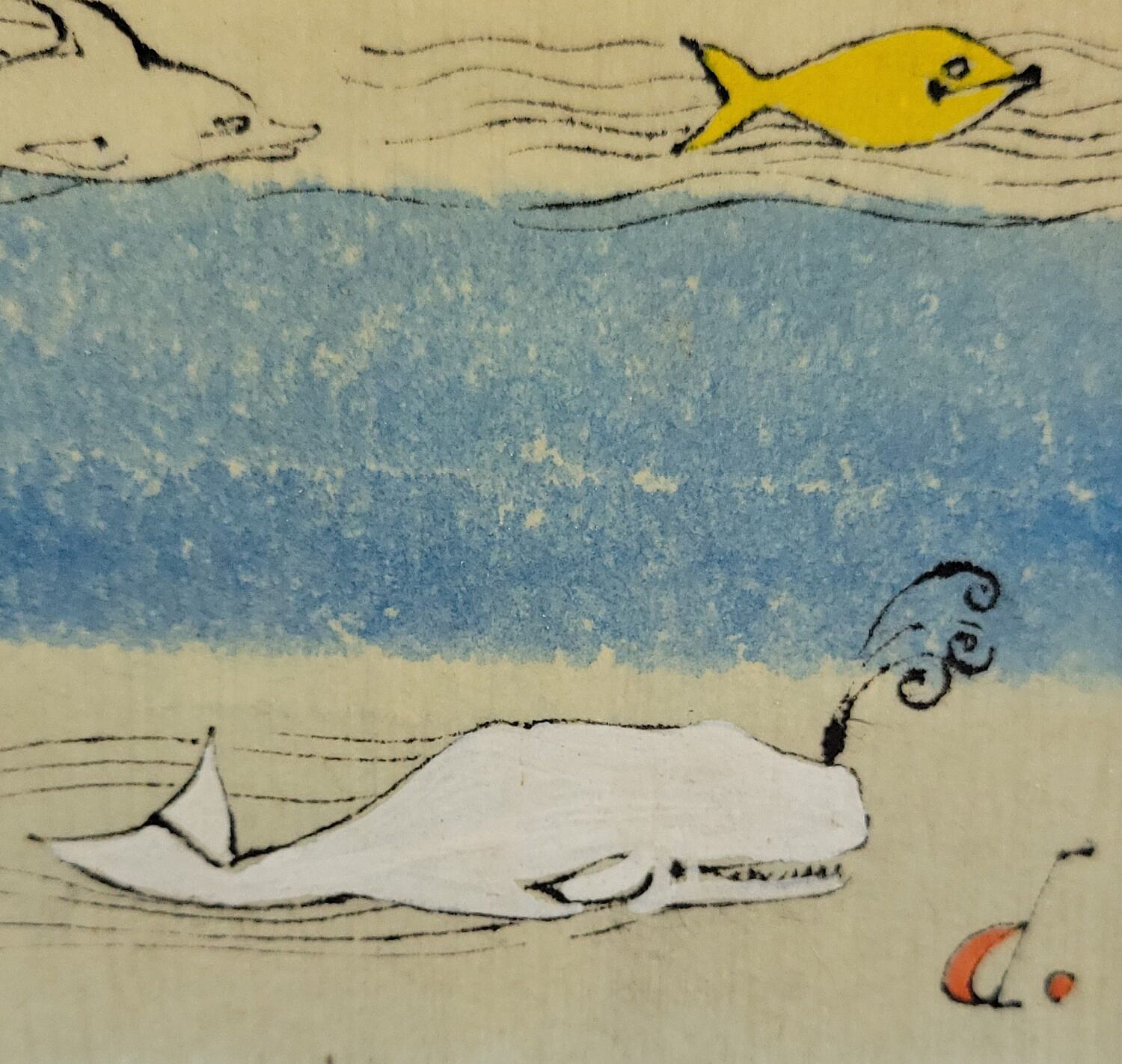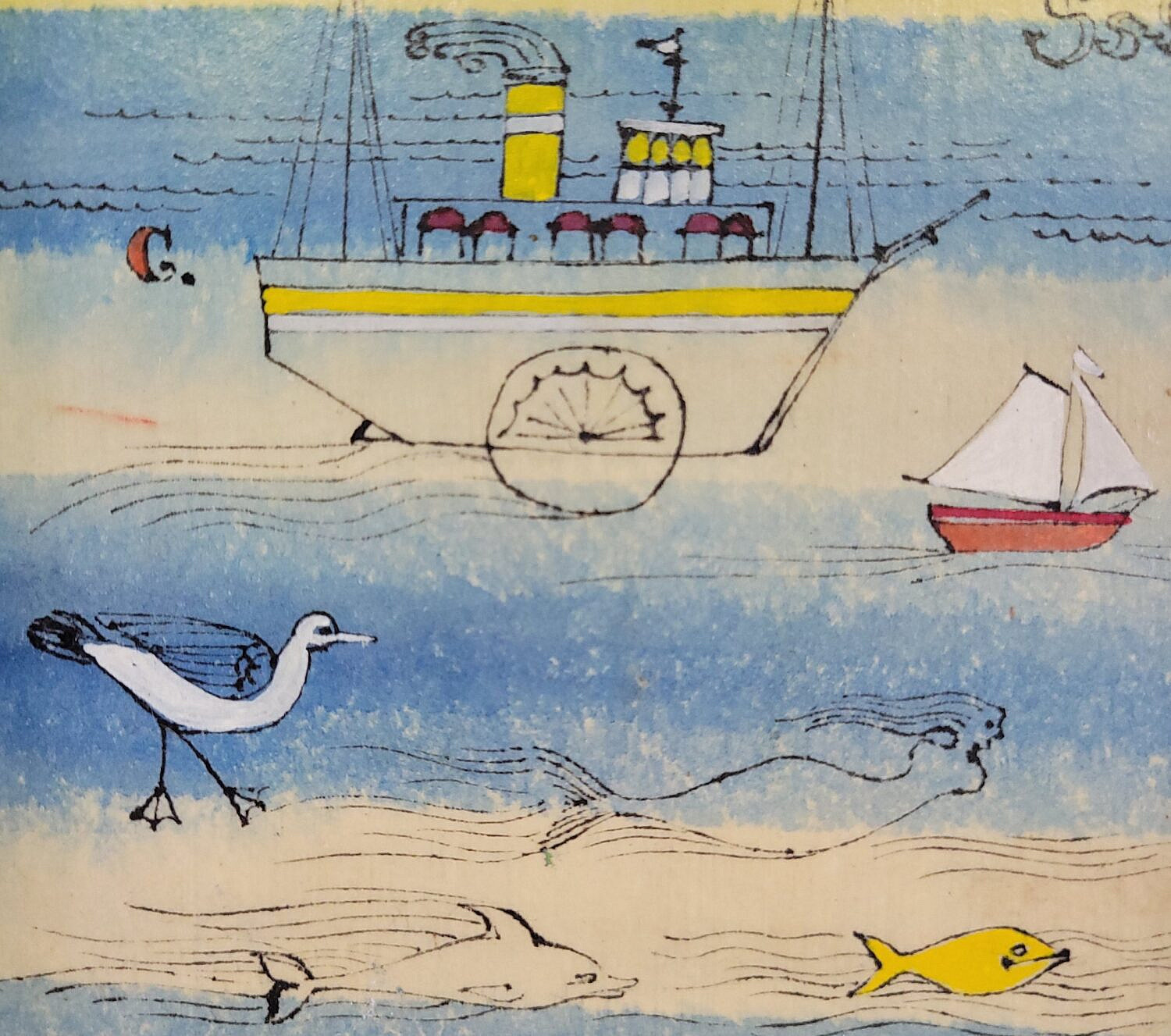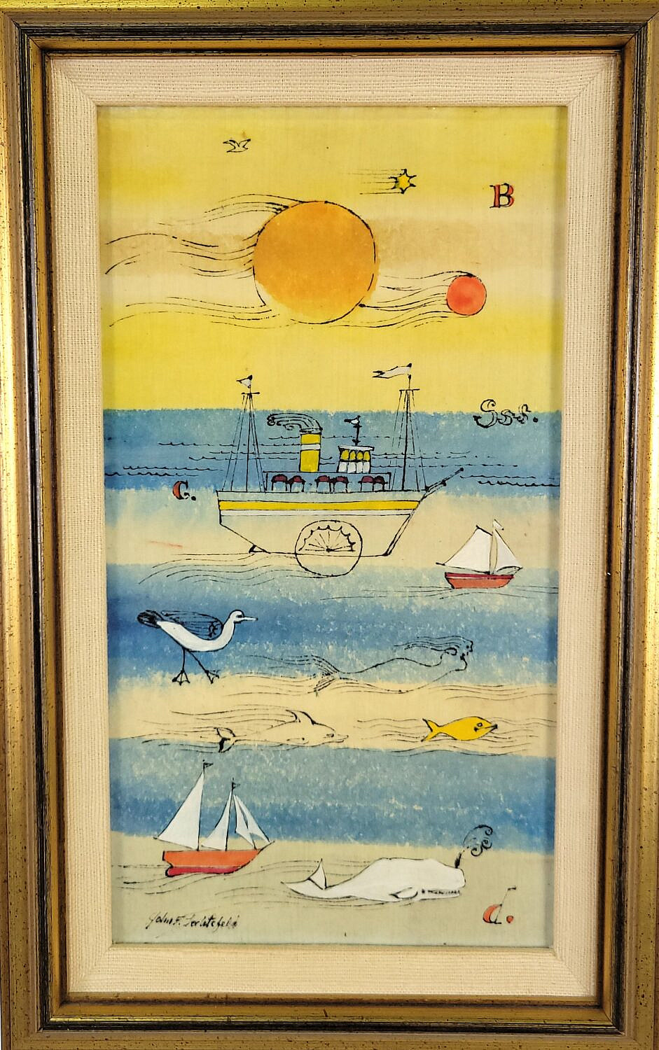 John Lochtefeld (1933-2025) Mixed Media on Board “Moby Dick and The Paddlewheeler off Nantucket”, signed lower left, in original gilt frame with linen liner.