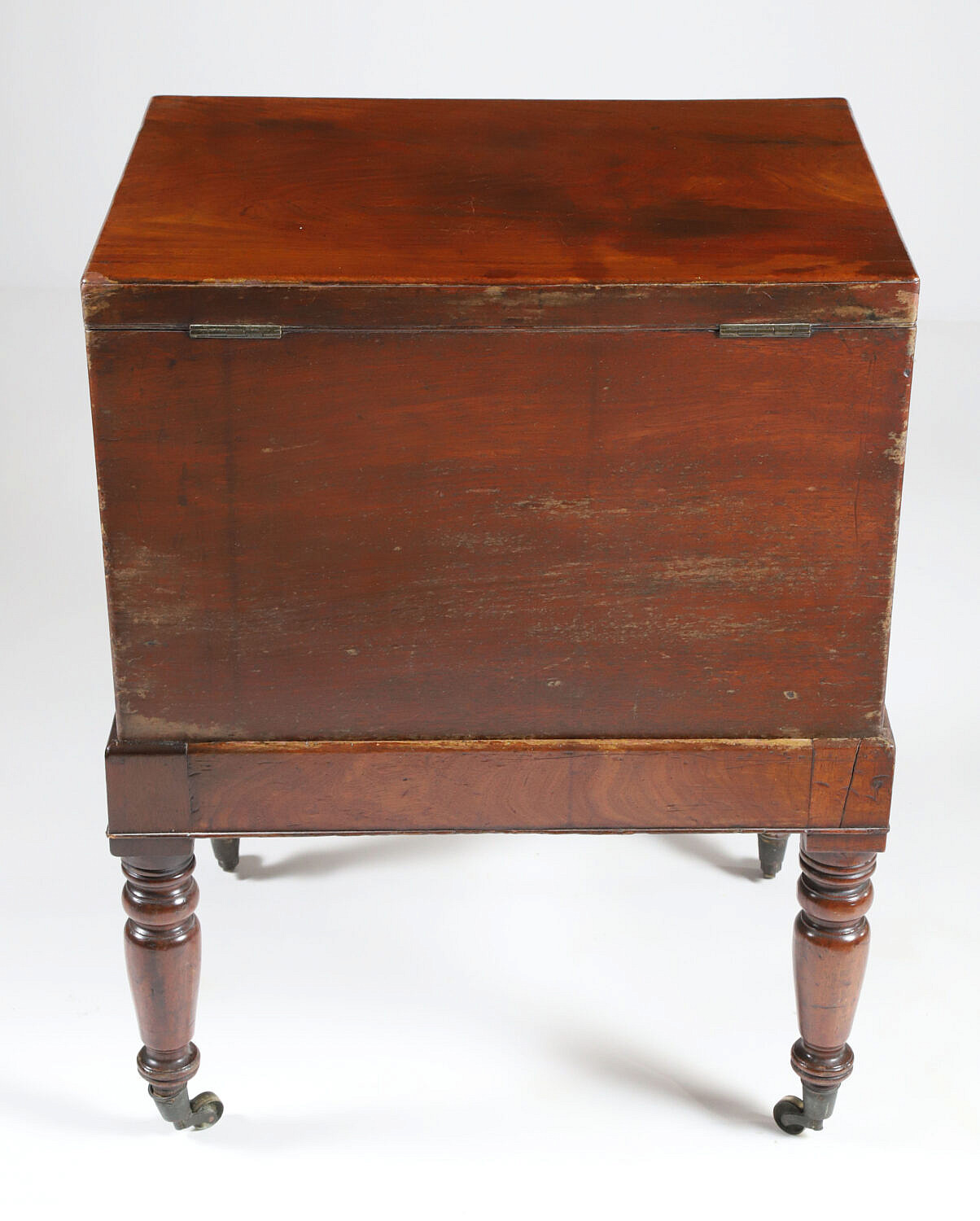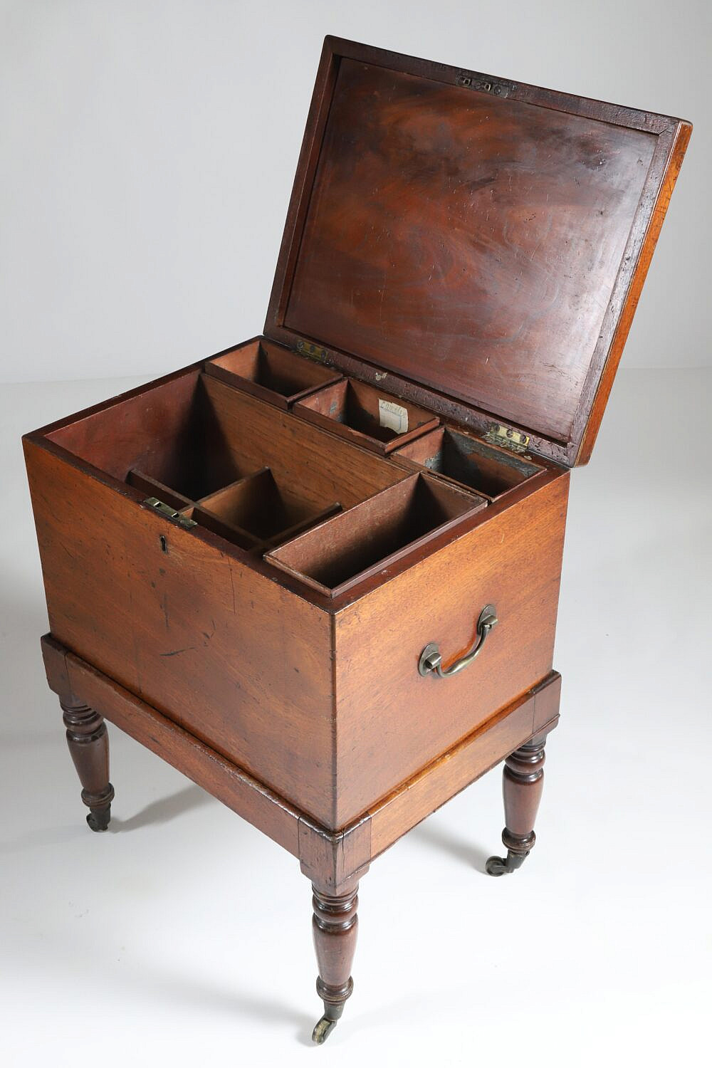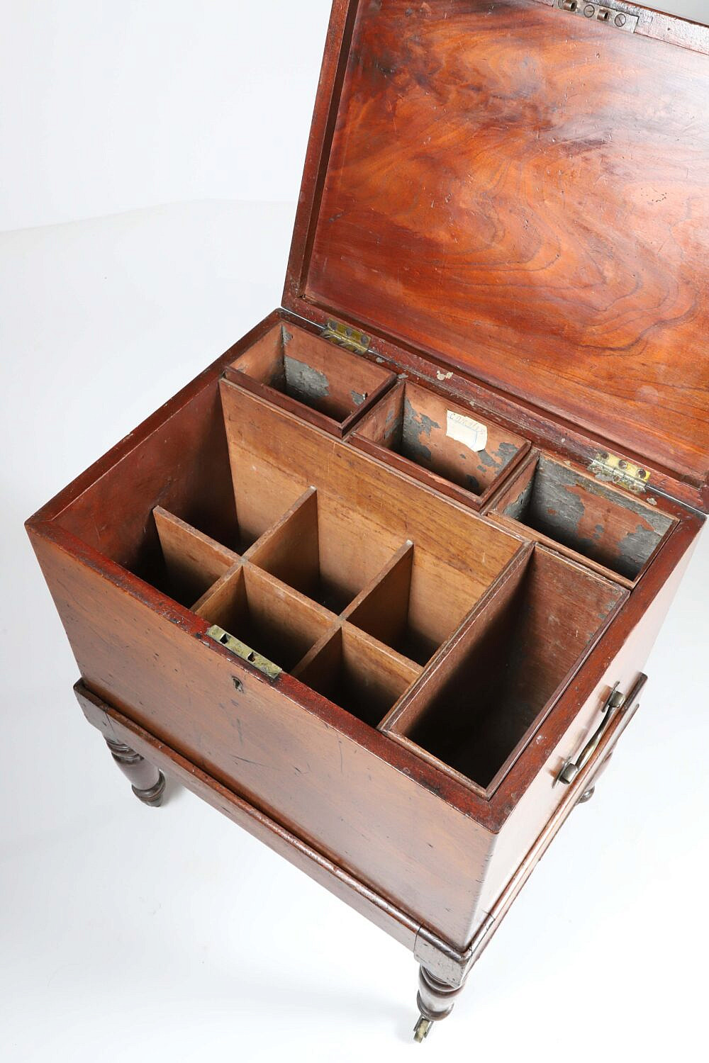 Mahogany Cellarette, 19th Century Consign Now DeptFurnitureSizeHeight 27 in. Width 21 in. Depth 15.5 in. Mahogany Cellarette, 19th Century, the top lifts to reveal numerous compartments, side brass carrying handles, turned legs, on brass casters Height 27 in. Width 21 in. Depth 15.5 in. Provenance: Collection of Susan Akers, 7 Pleasant Street, Nantucket Island, Massachusetts Please note that this auction has ended. Click here for an overview of this auction.