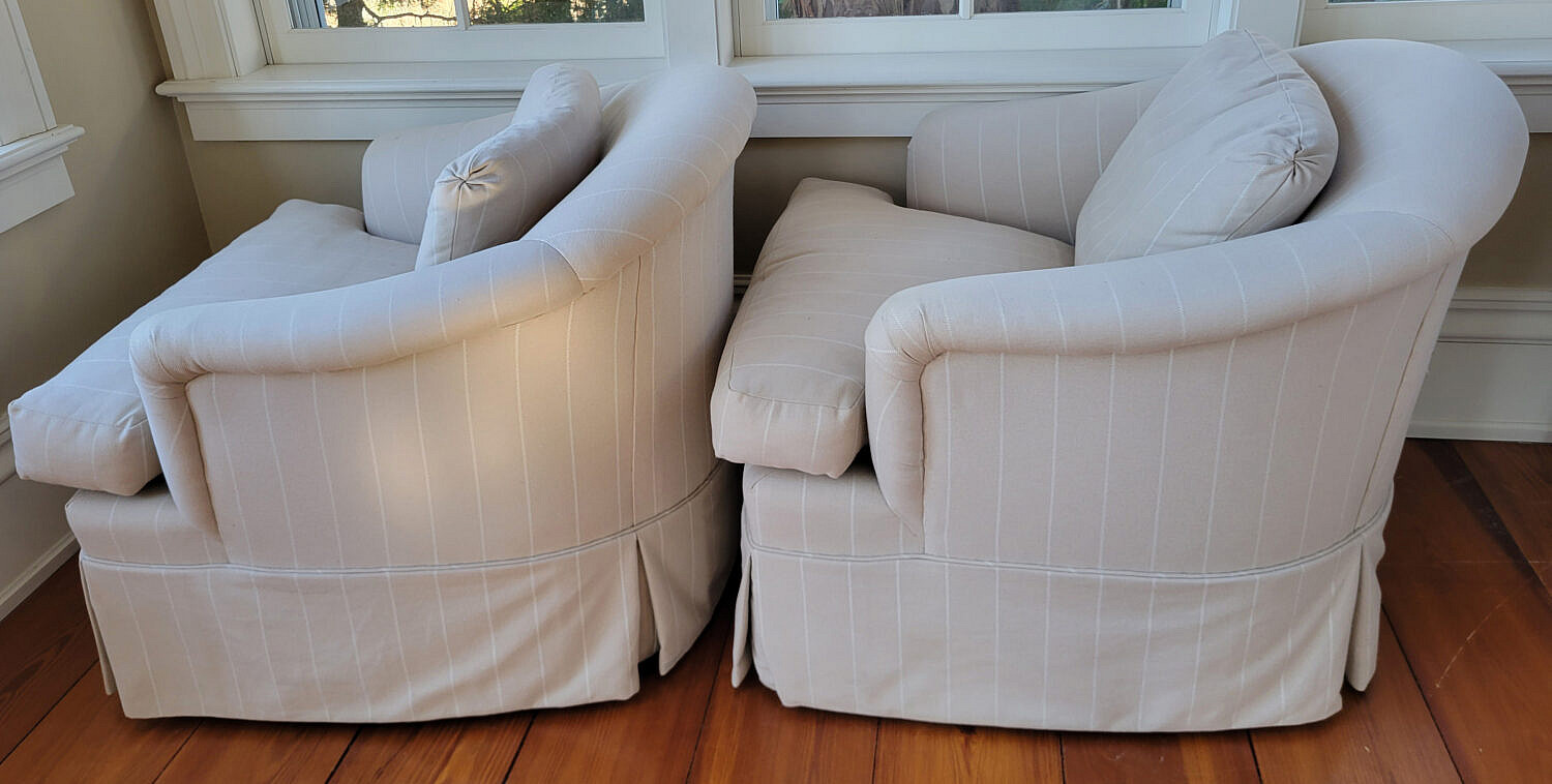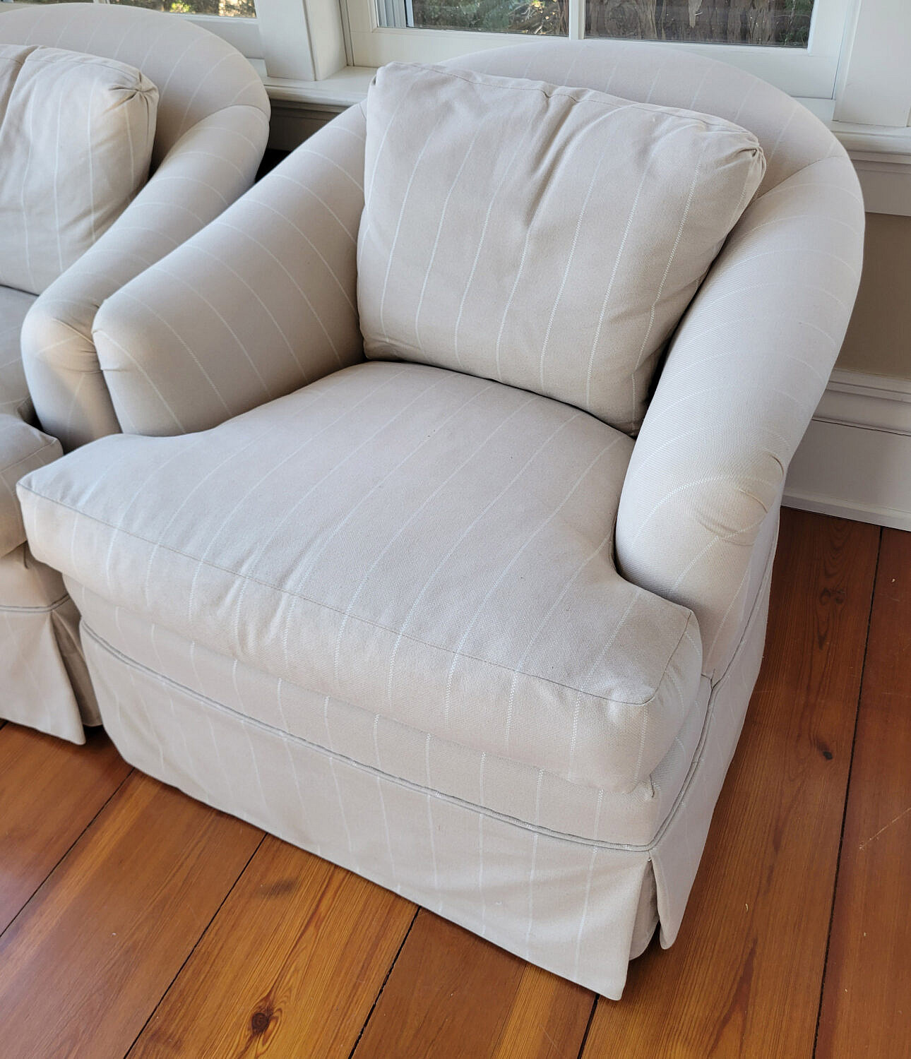 Pair of Creme-Beige Pinstripe Upholstered Swivel Club Chairs Consign Now DeptFurnitureSizeHeight 29 in. Width 30 in. Depth 36 in. Seat Height 18 in. Pair of Creme-Beige Upholstered Pinstrip Swivel Club Chairs Height 29 in. Width 30 in. Depth 36 in. Seat Height 18 in. Provenance: Collection of Susan Akers, 7 Pleasant Street, Nantucket Island, Massachusetts Please note that this auction has ended. Click here for an overview of this auction.