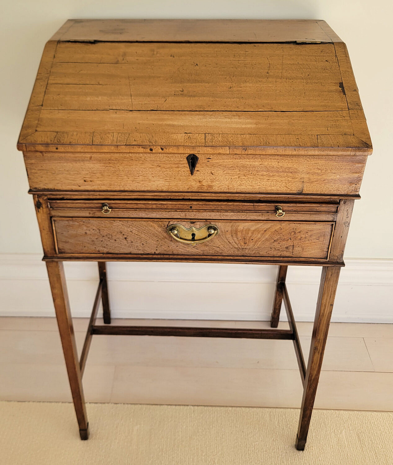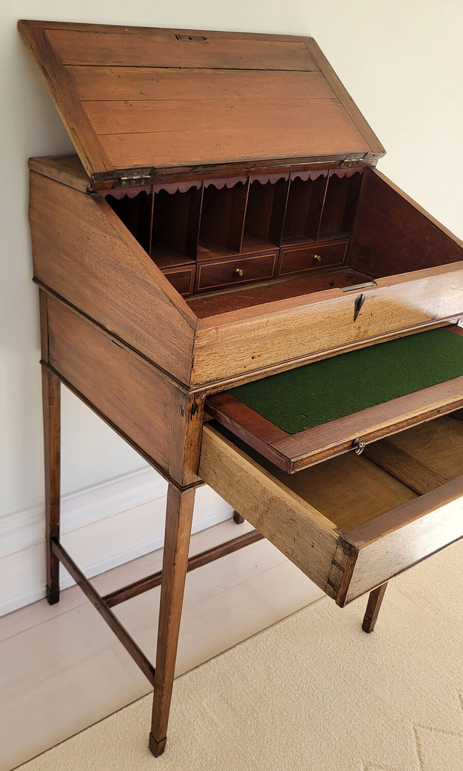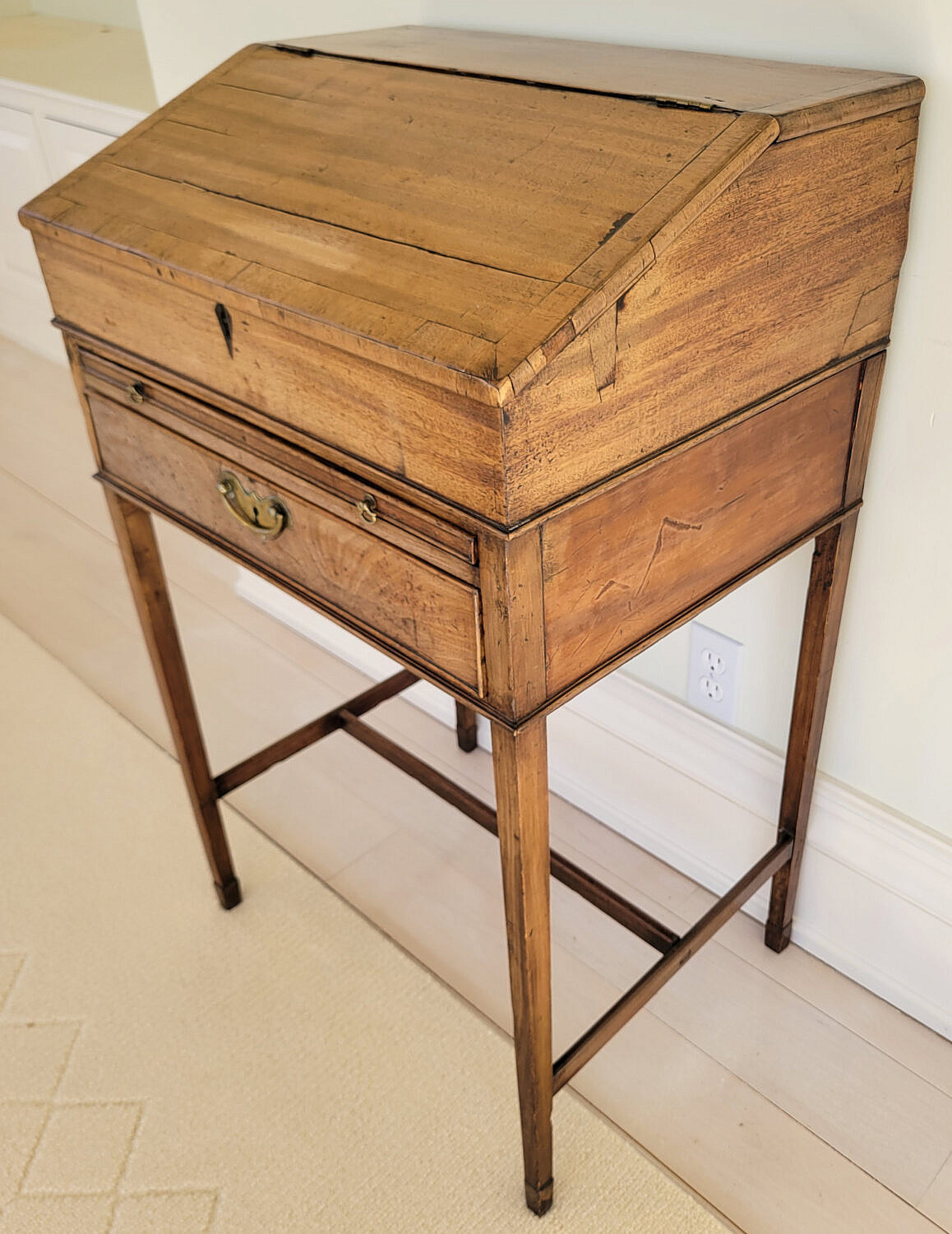 Regency Lady’s Writing Desk, 19th Century, one drawer below felt lined pull-out work surface, accompanied by a 19th Century rush seat side chair