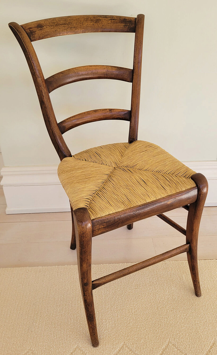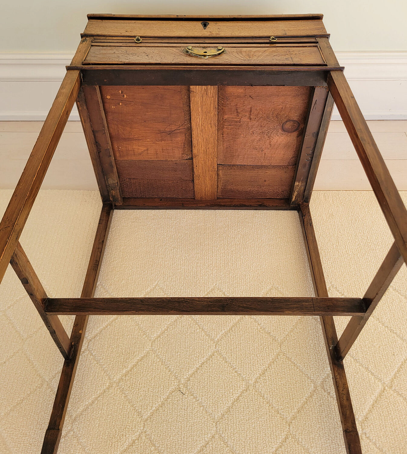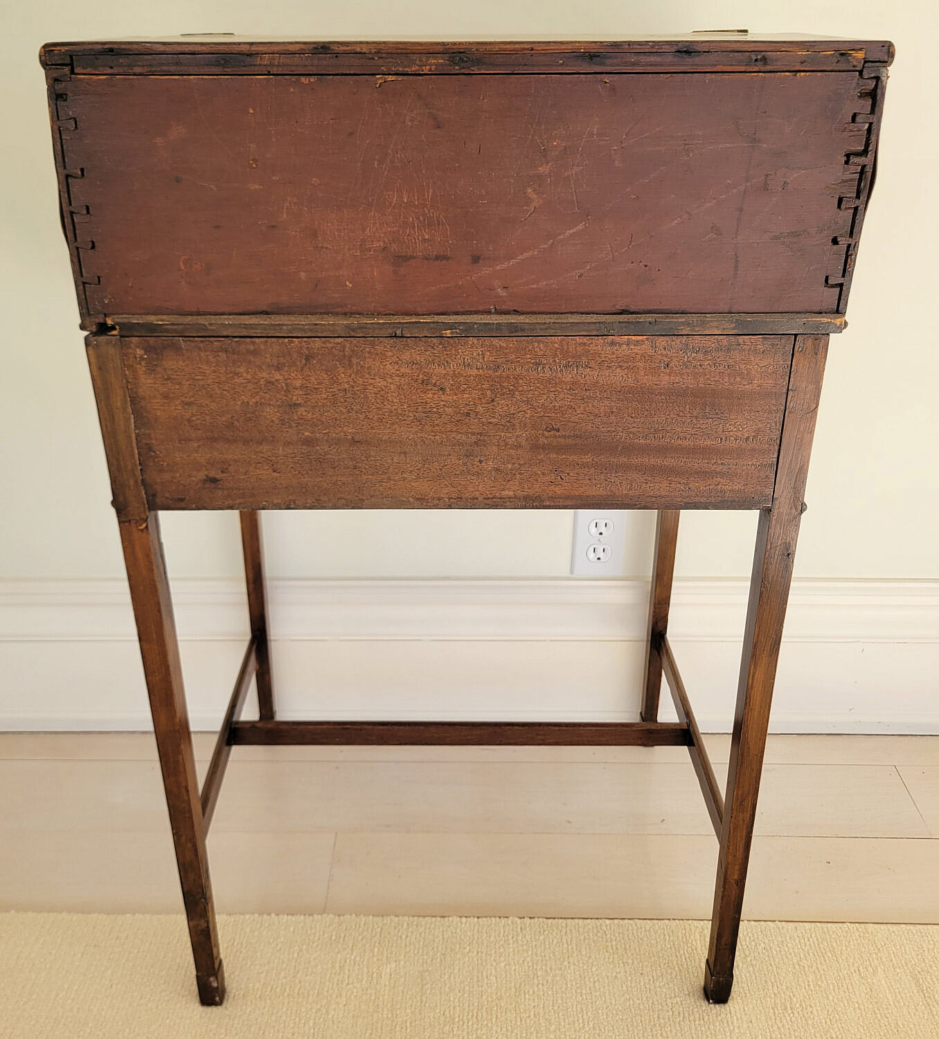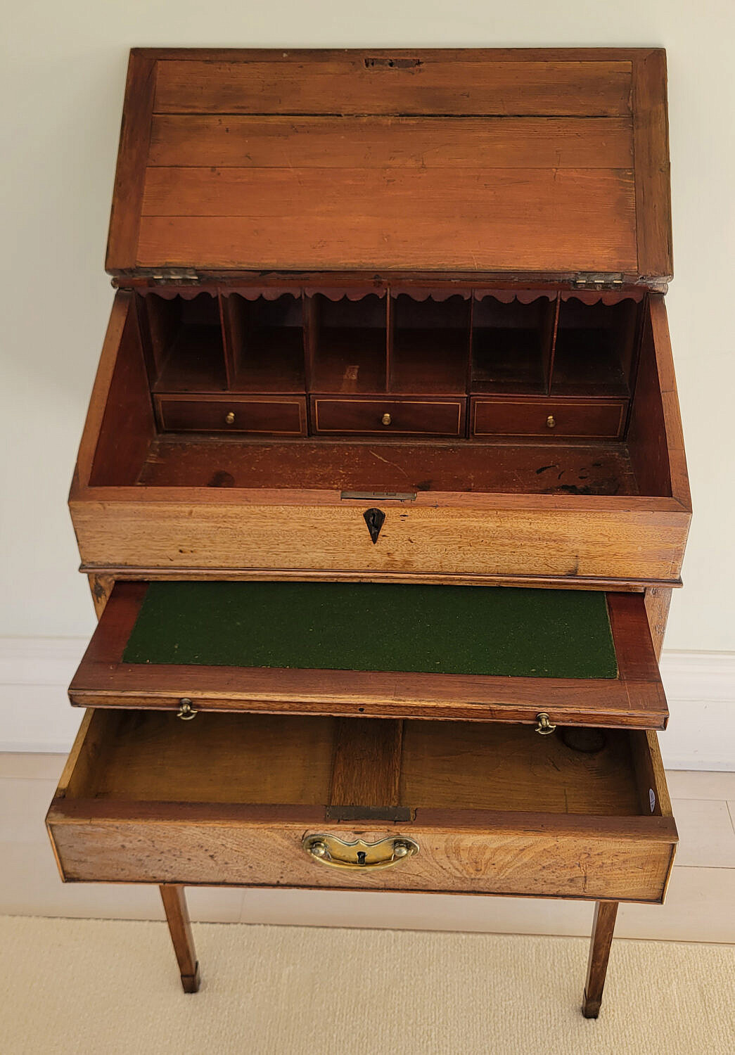 Regency Lady’s Writing Desk, 19th Century, one drawer below felt lined pull-out work surface, accompanied by a 19th Century rush seat side chair
