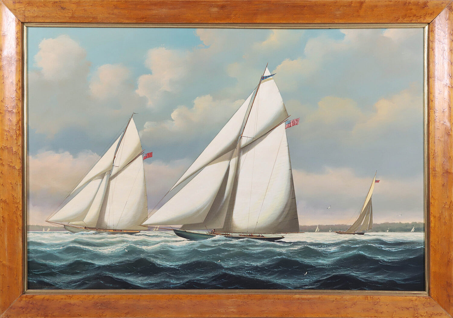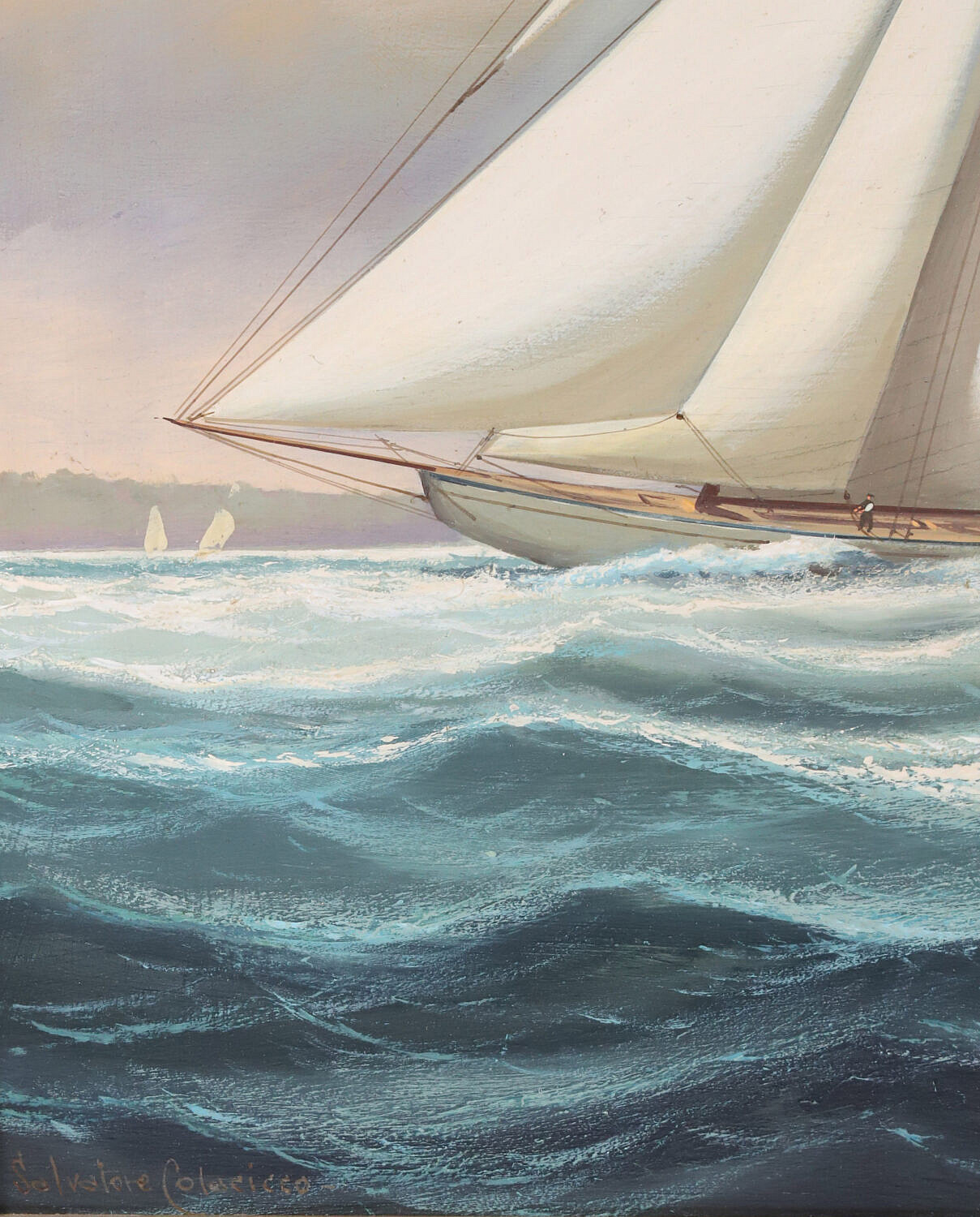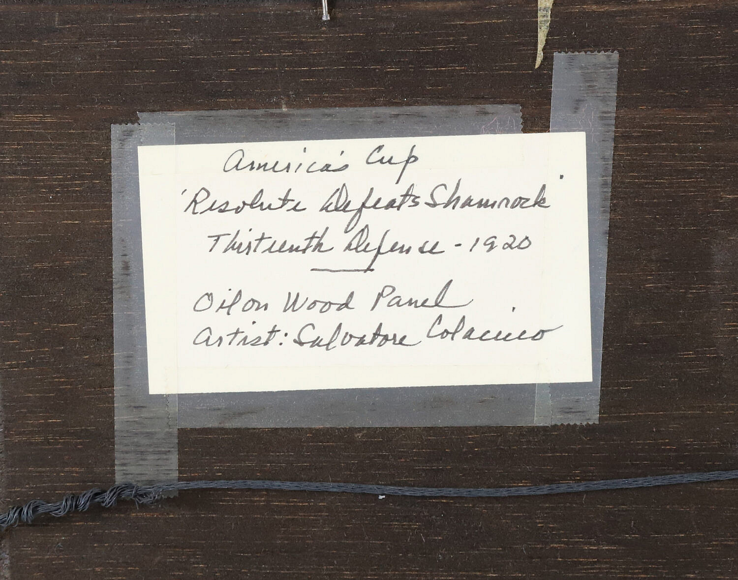 Salvatore Colacicco (Italian b. 1935) Oil on Wood Panel “America’s Cup, Resolute Defeats Shamrock, Thirteenth Defense”, circa 1920, signed lower left Salvatore Colacicco, in maple wood frame with gilt liner