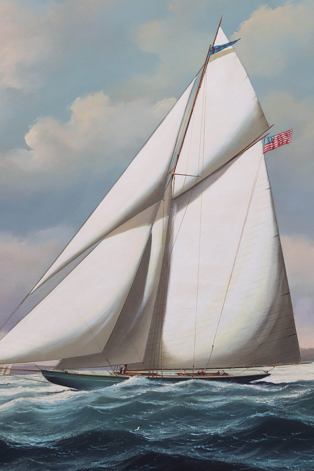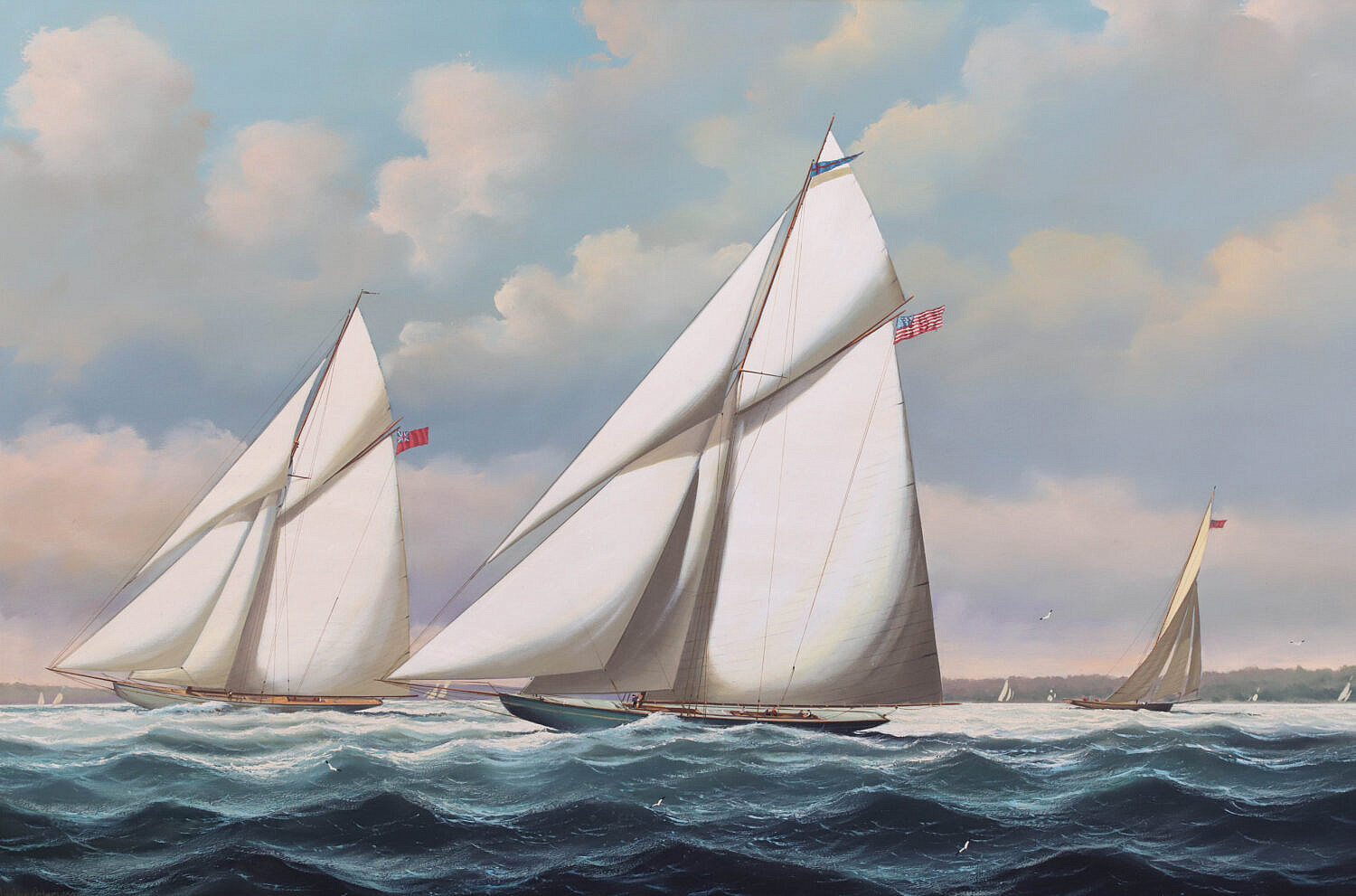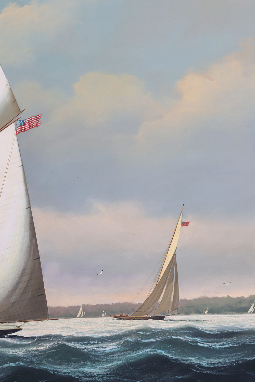Salvatore Colacicco (Italian b. 1935) Oil on Wood Panel “America’s Cup, Resolute Defeats Shamrock, Thirteenth Defense”, circa 1920, signed lower left Salvatore Colacicco, in maple wood frame with gilt liner