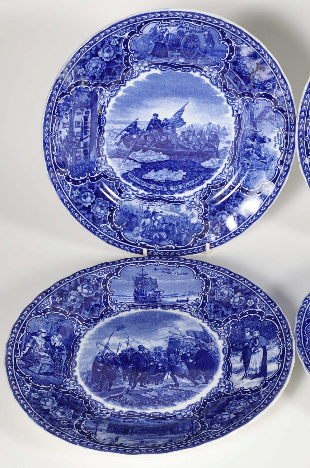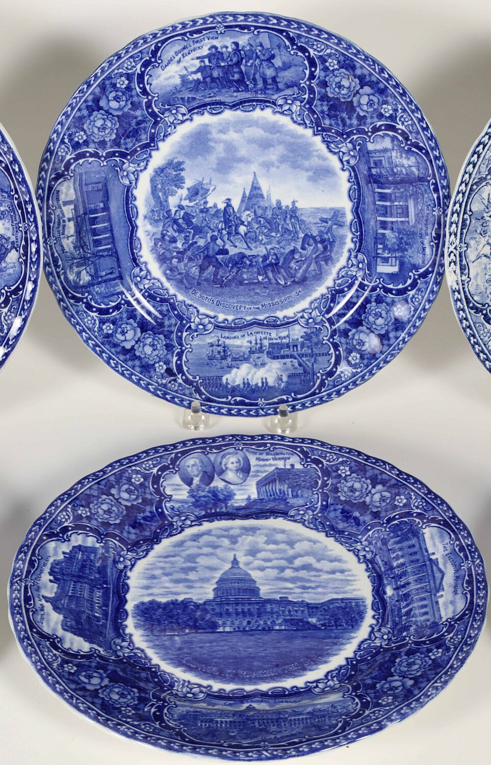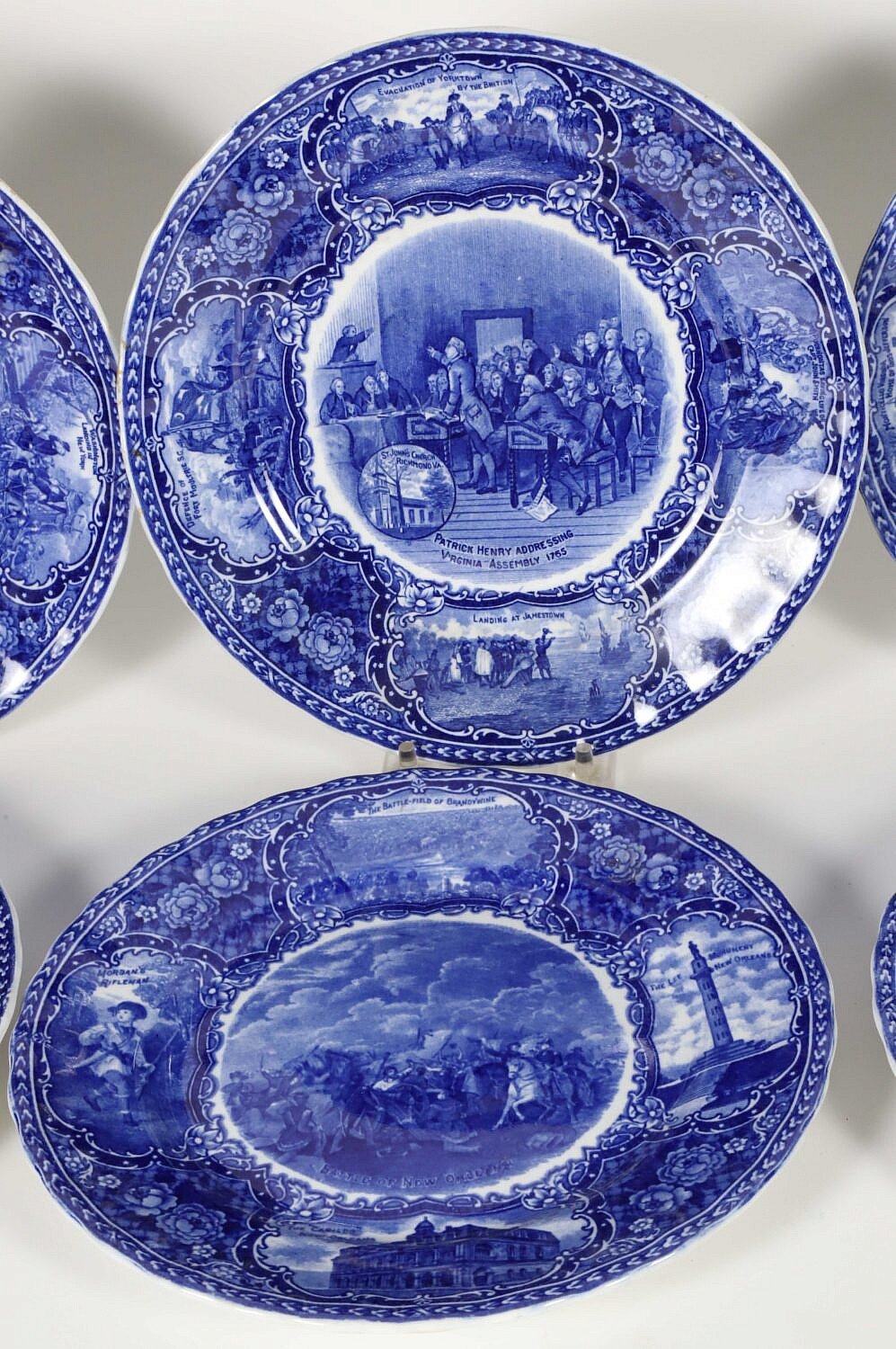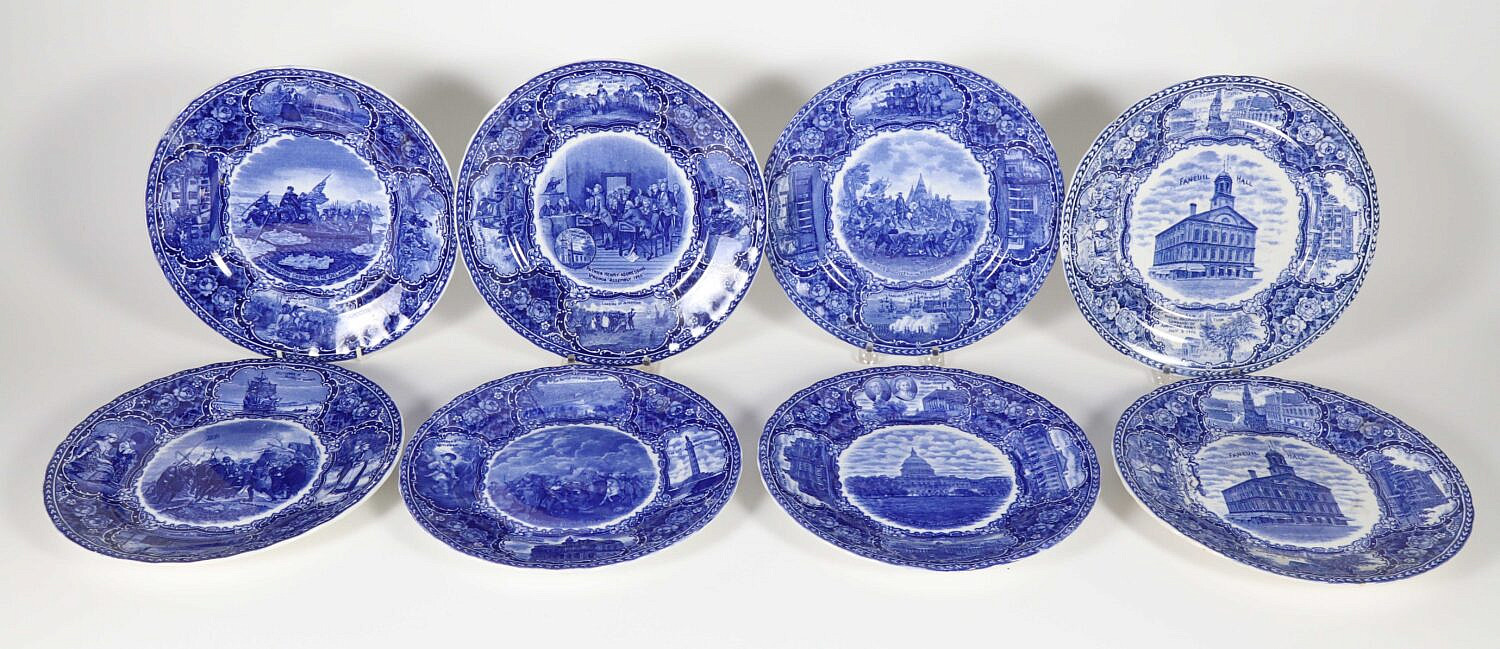 Set of Eight Historic Staffordshire Blue and White Plates Consign Now DeptCeramics & Glass, Decorative ArtsSizeDiameter 9.25 in. Set of Eight Historic Staffordshire Blue and White Plates Two Faneuil Hall Washington Crossing Delaware Capitol of Washington DC Landing of the Pilgrims Battle of New Orleans Virginia Assembly 1765 Desoto’s Discovery of The Mississippi Diameter 9.25 in. Please note that this auction has ended. Click here for an overview of this auction.