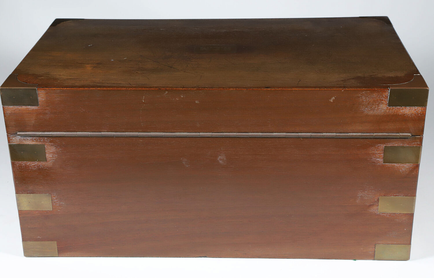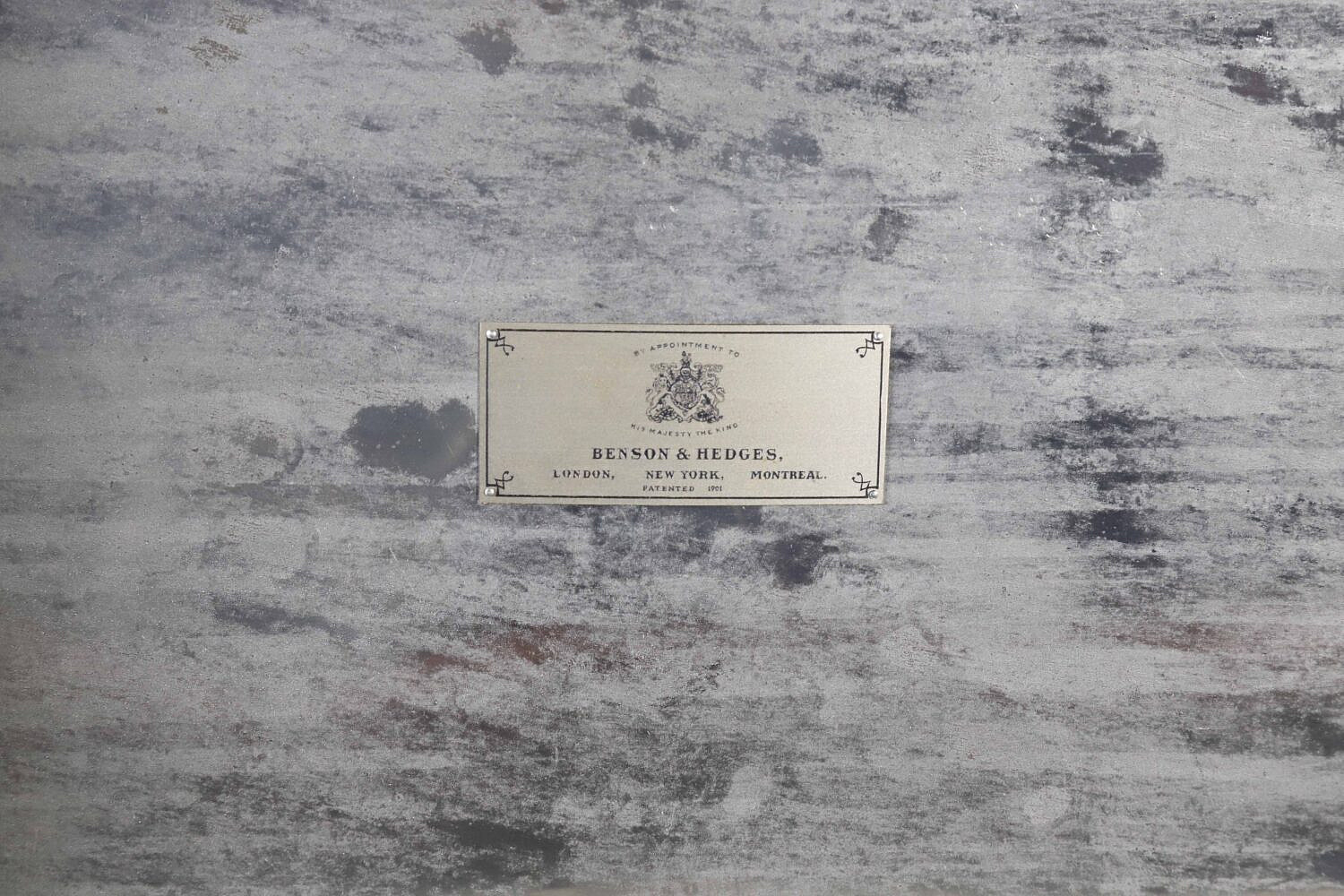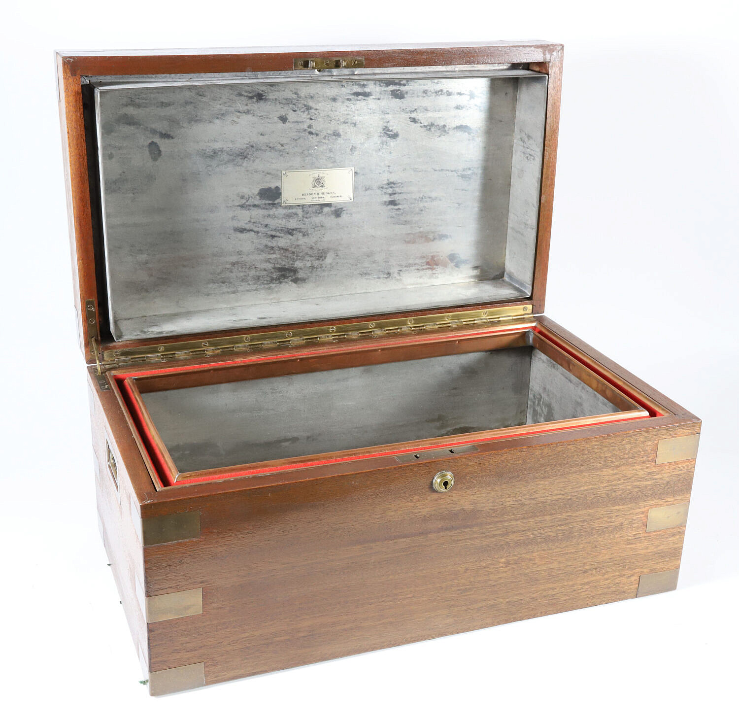 Vintage Benson & Hedges Mahogany Brass Bound Humidor Box, with brass name plaque monogrammed H.E.M., brass bindings intact on all edges, recessed brass carrying handles, original label on interior: Benson & Hedges London, New York, Montreal