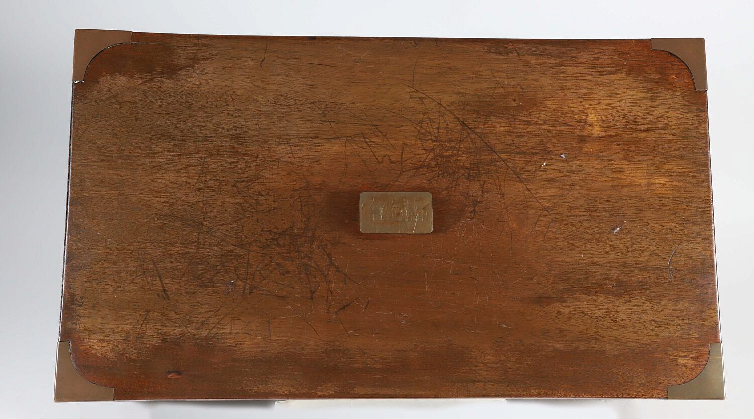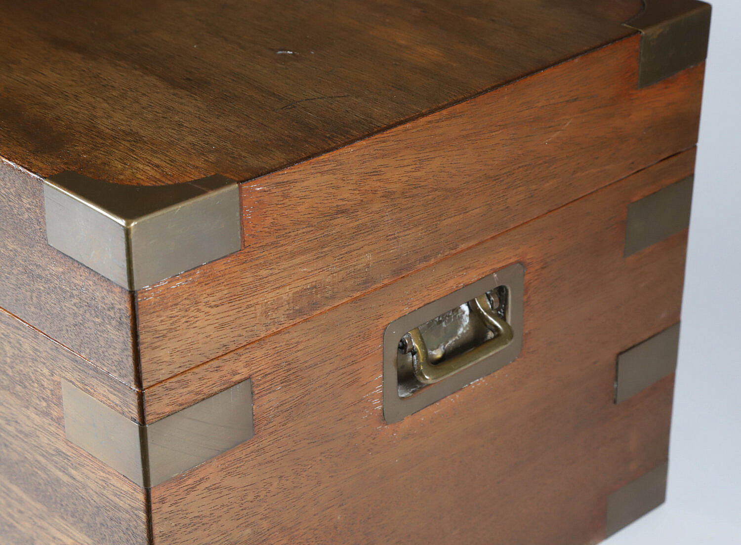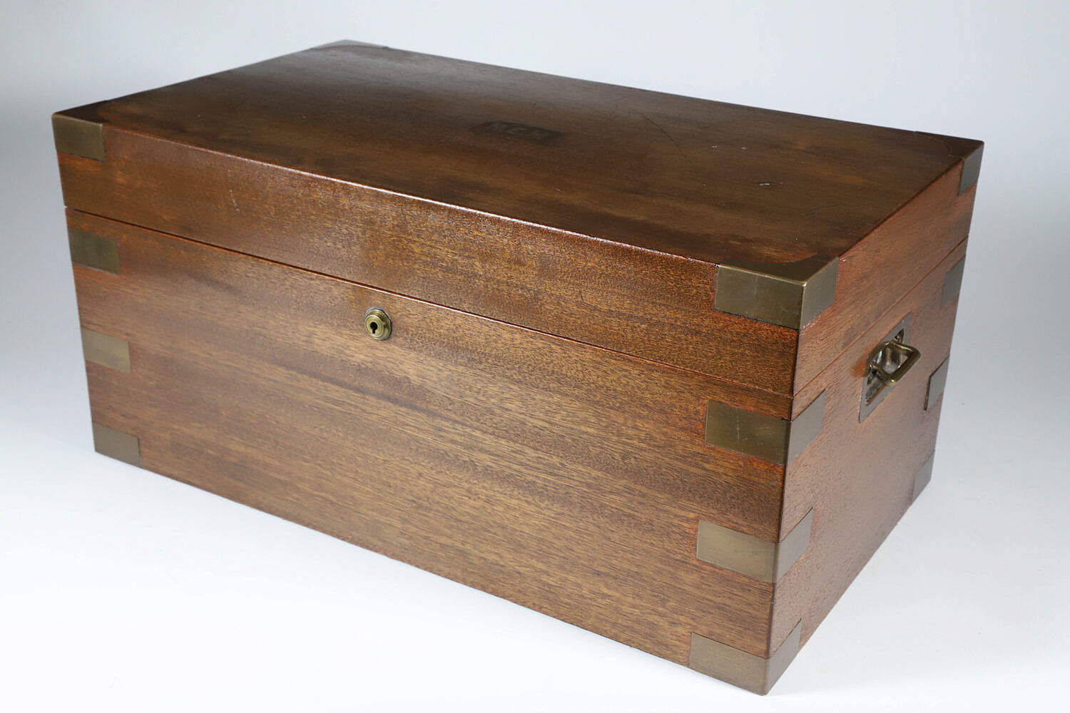 Vintage Benson & Hedges Mahogany Brass Bound Humidor Box, with brass name plaque monogrammed H.E.M., brass bindings intact on all edges, recessed brass carrying handles, original label on interior: Benson & Hedges London, New York, Montreal