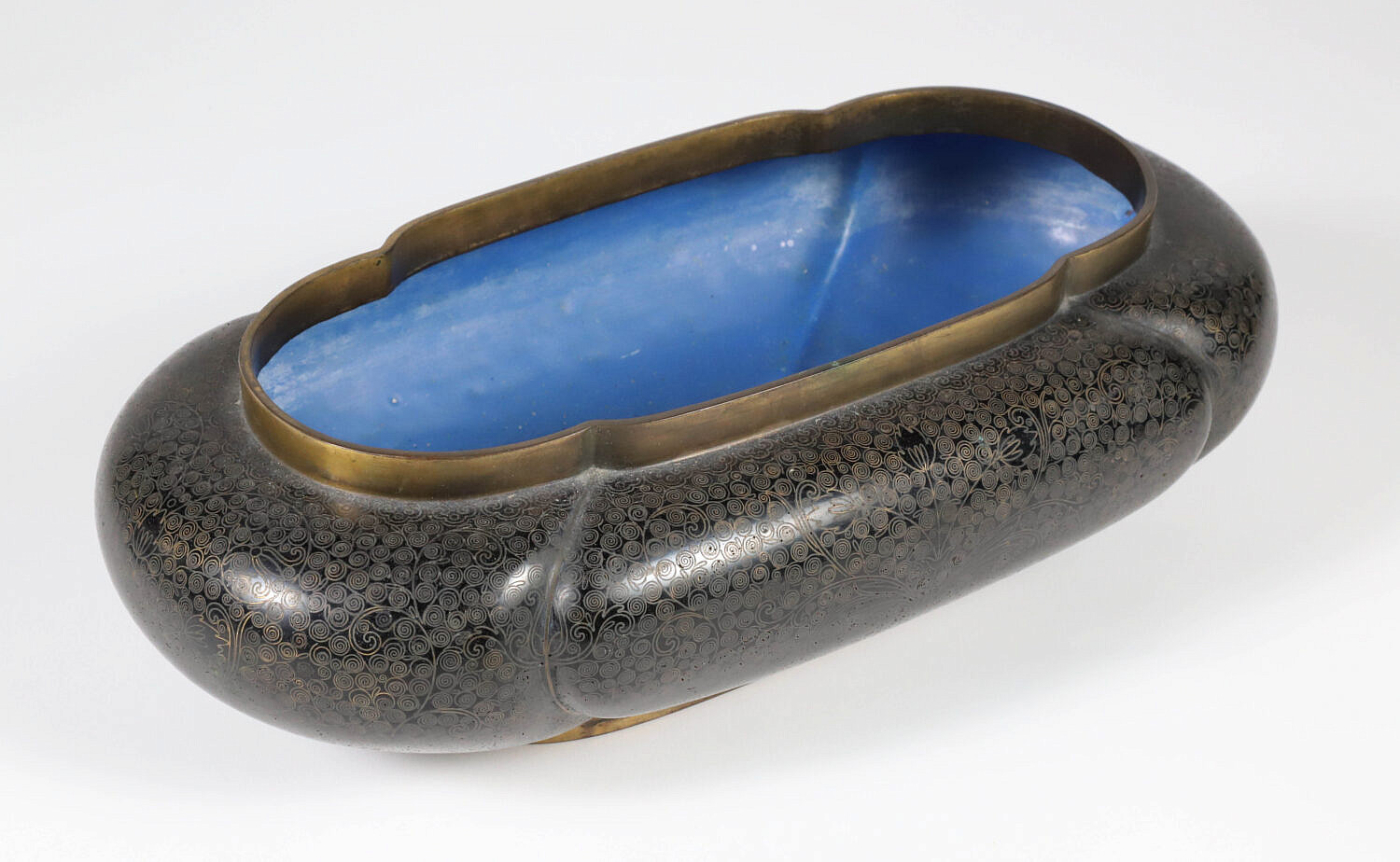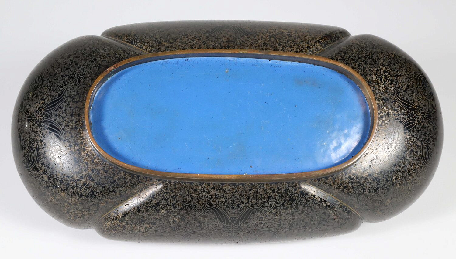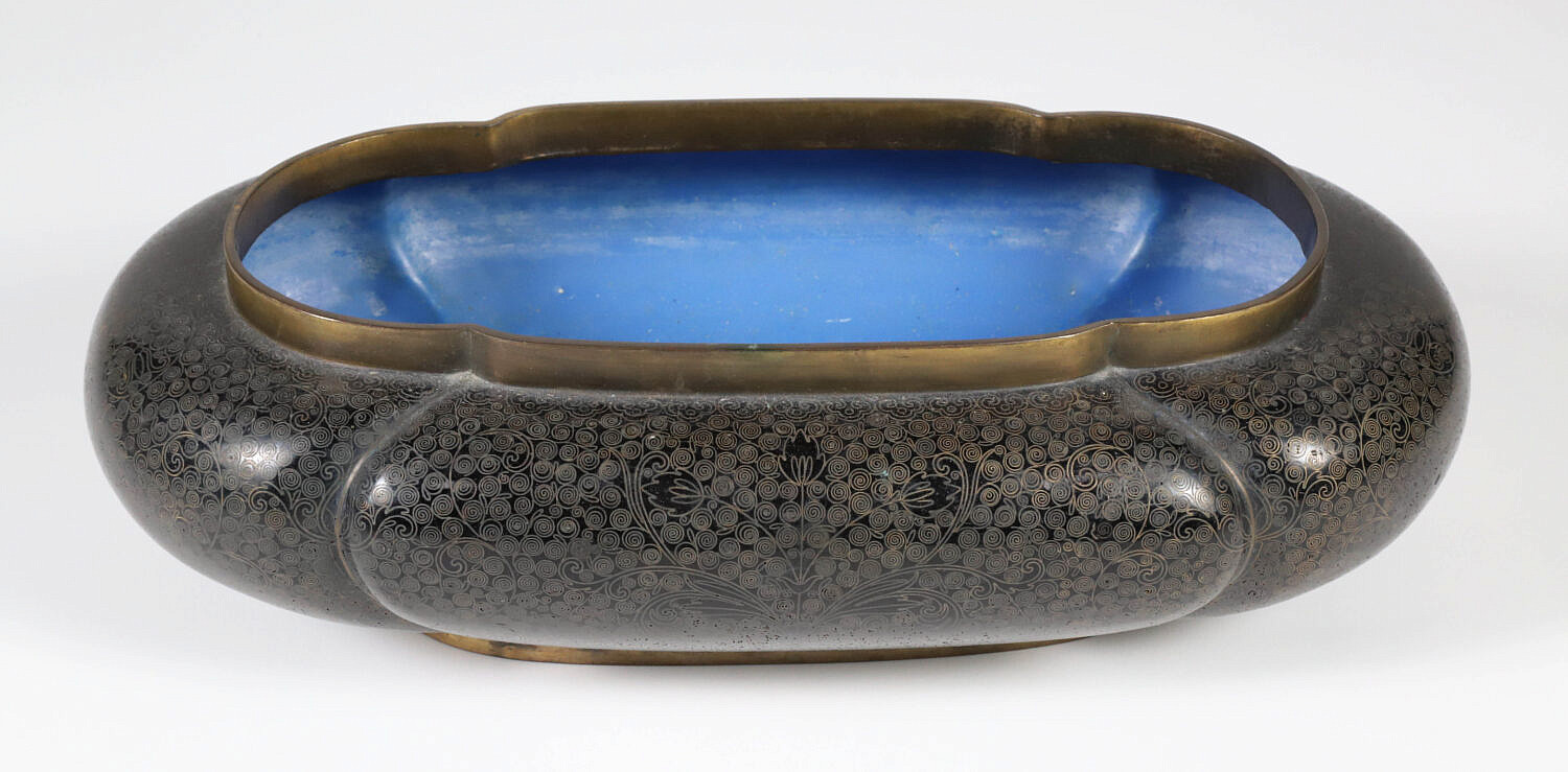 Vintage Chinese Cloisonne Oval Planter Consign Now DeptAsian Arts/China Trade, Decorative ArtsSizeHeight 3 in. Length 12 in. Width 7 in. Vintage Chinese Cloisonne Oval Planter, decorated with continuous foliate scrolls on a black ground, raised on an oval foot Height 3 in. Length 12 in. Width 7 in. Provenance: Collection of Susan Akers, 7 Pleasant Street, Nantucket Island, Massachusetts Please note that this auction has ended. Click here for an overview of this auction.