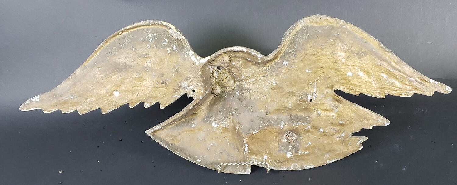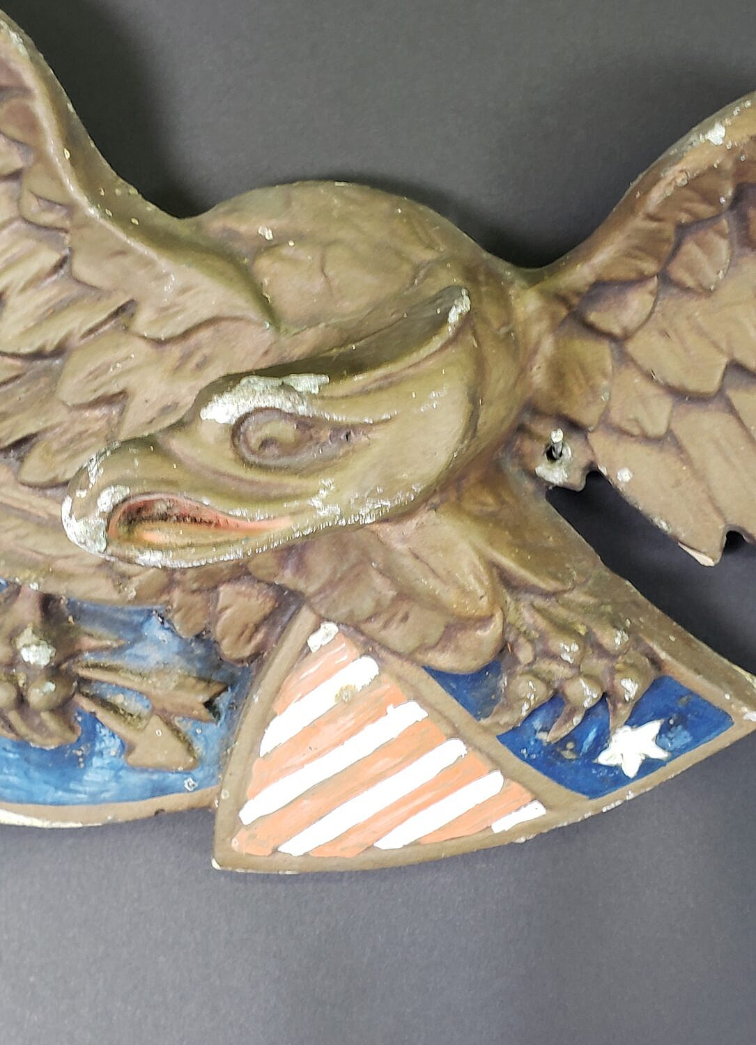 Vintage Painted Metal Lewisburg Style Eagle Wall Plaque Consign Now Dept20th Century Design, Americana and Folk Arts, Decorative Arts, Furniture/Decorative ArtsSize8.5 in. X 21.5 in. Vintage Painted Metal Lewisburg Style Eagle Wall Plaque, clutching a Federal shield, two piece mold. 8.5 in. X 21.5 in. Please note that this auction has ended. Click here for an overview of this auction.