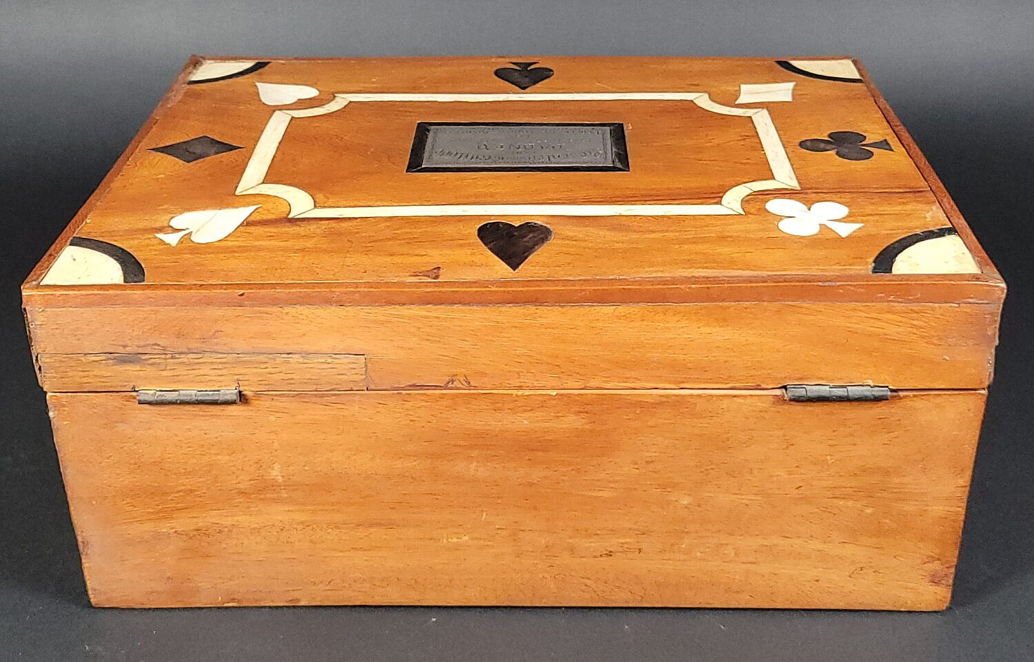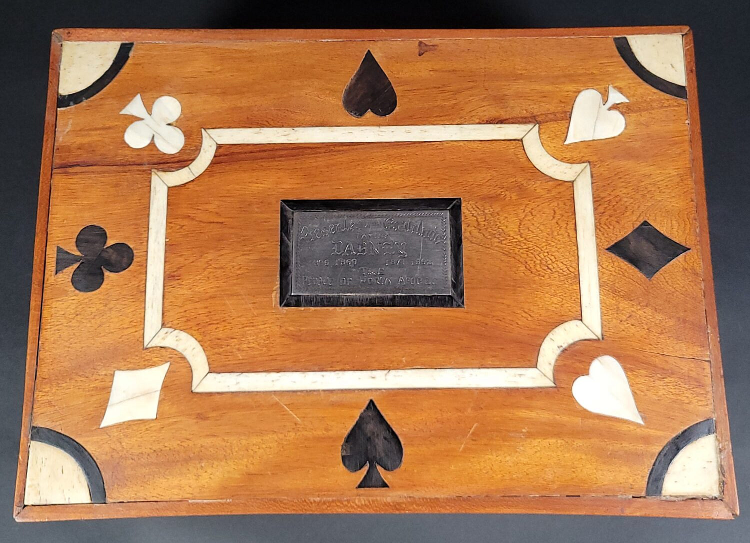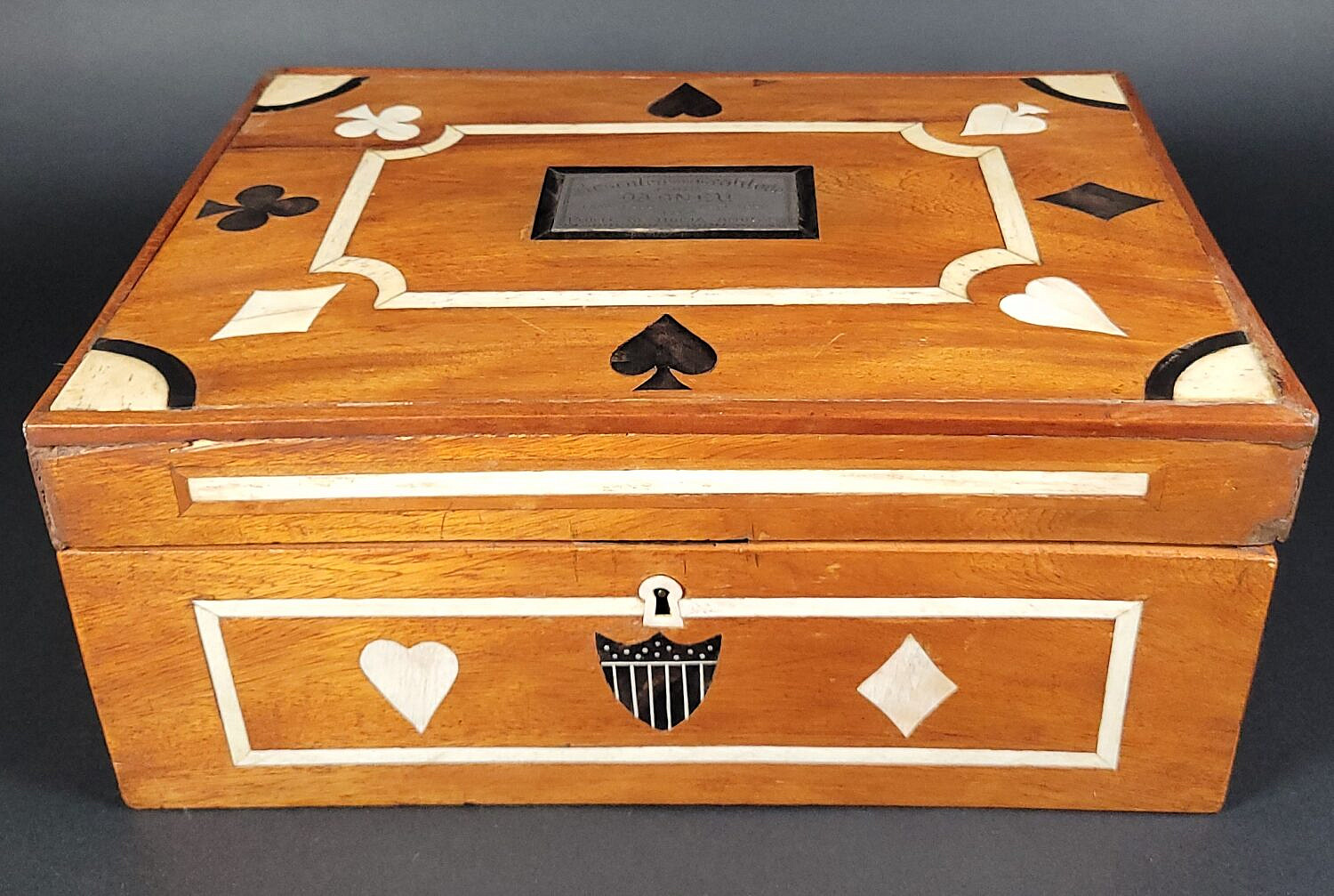 Important 19th C. Sailor Made Inlaid Presentation Box, tropical wood inlaid with whalebone and whale ivory playing card suits, American federal shield and quarter fans, interior with fitted compartment and tray, engraved silver presentation plaque to the Dabney family from the people of Horta, Azores. John B. Dabney was American Consul in the Azores from 1806-1826, his son Charles William Dabney served from 1826-1869, followed by his son Samuel Wyllys Dabney serving from 1872-1892 at which time the Dabney family left the Azores and returned to America.