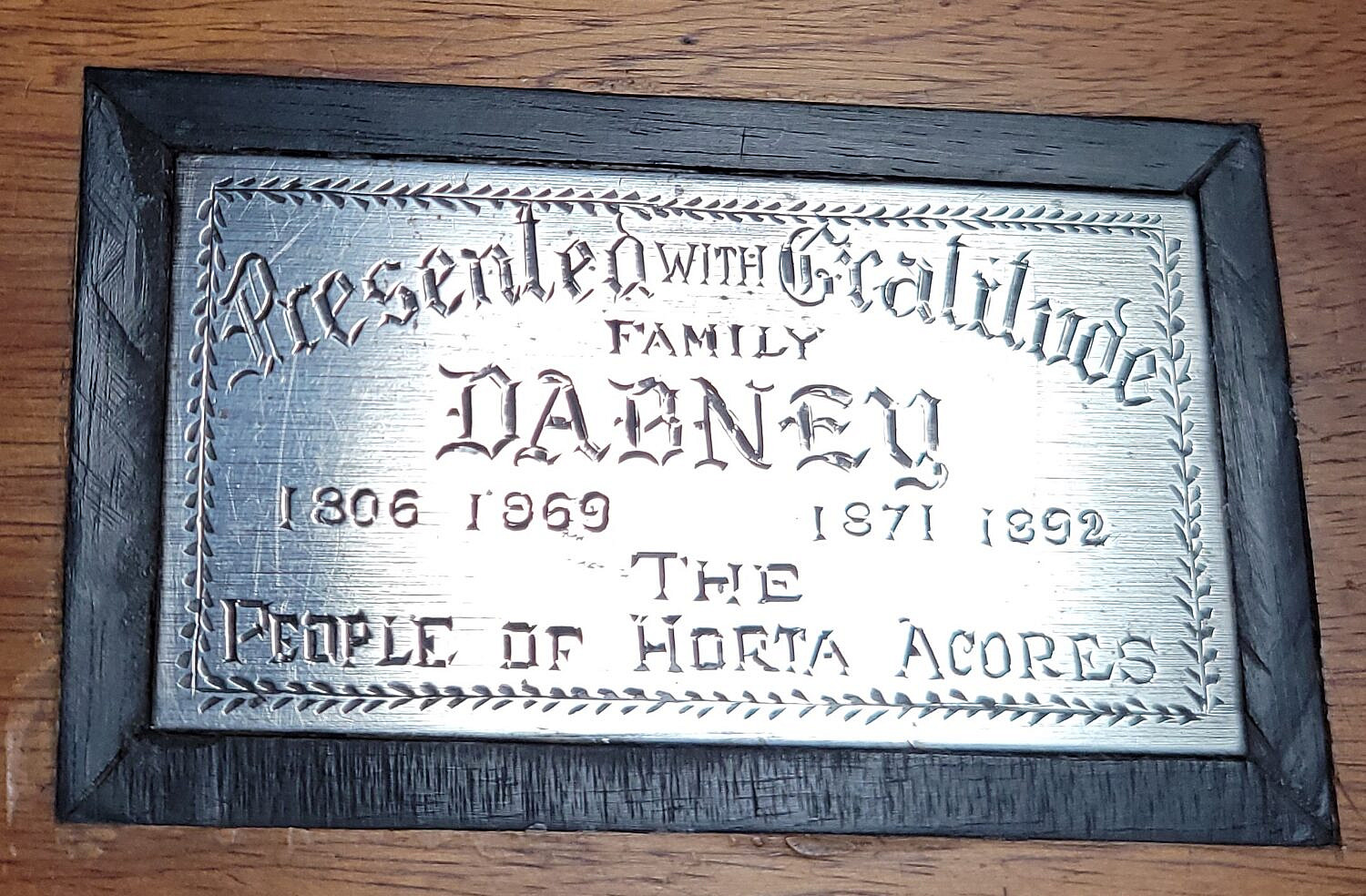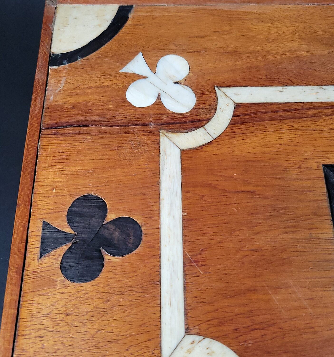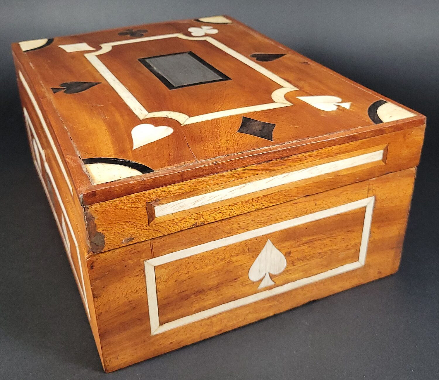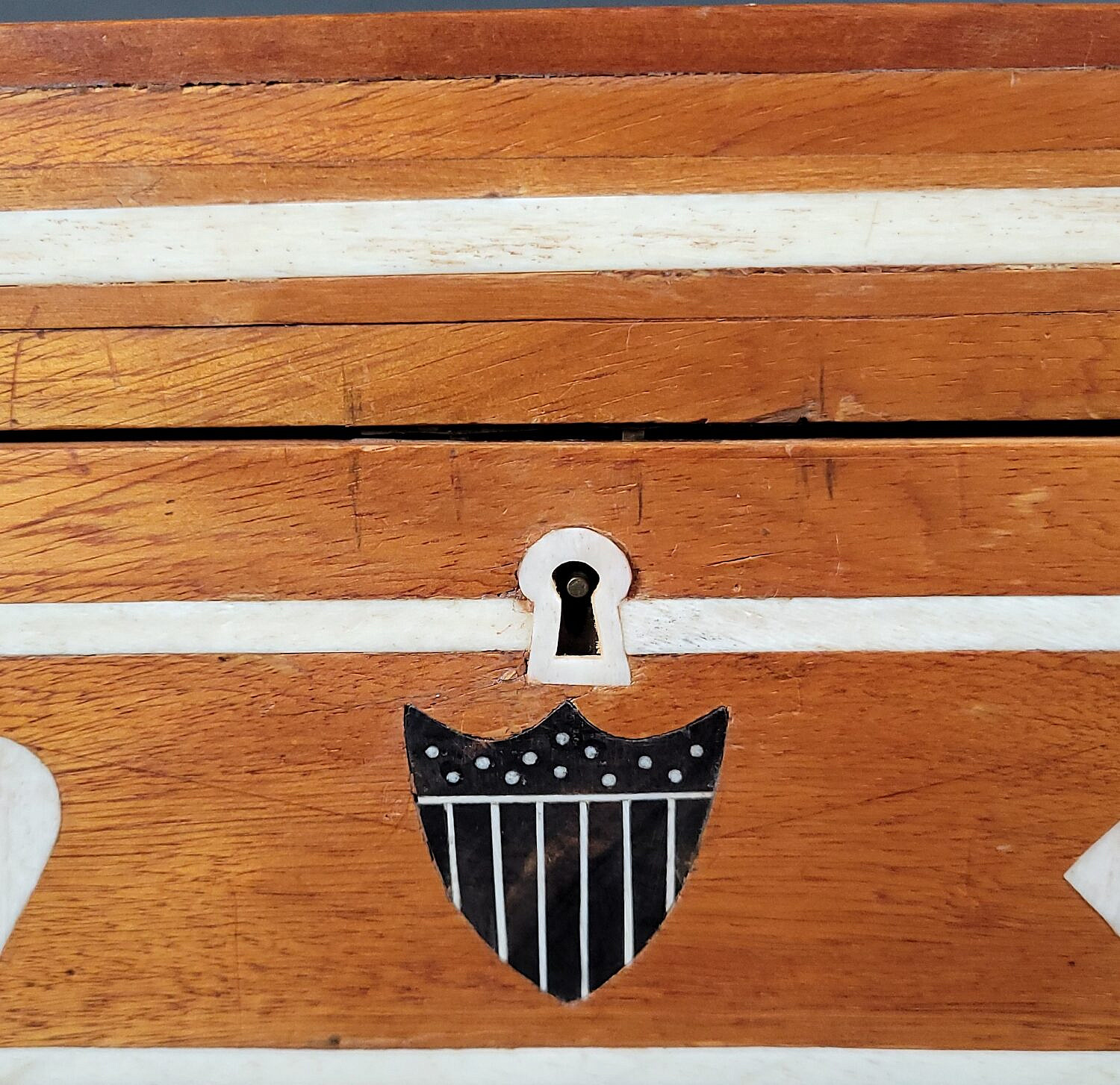 Important 19th C. Sailor Made Inlaid Presentation Box, tropical wood inlaid with whalebone and whale ivory playing card suits, American federal shield and quarter fans, interior with fitted compartment and tray, engraved silver presentation plaque to the Dabney family from the people of Horta, Azores. John B. Dabney was American Consul in the Azores from 1806-1826, his son Charles William Dabney served from 1826-1869, followed by his son Samuel Wyllys Dabney serving from 1872-1892 at which time the Dabney family left the Azores and returned to America.