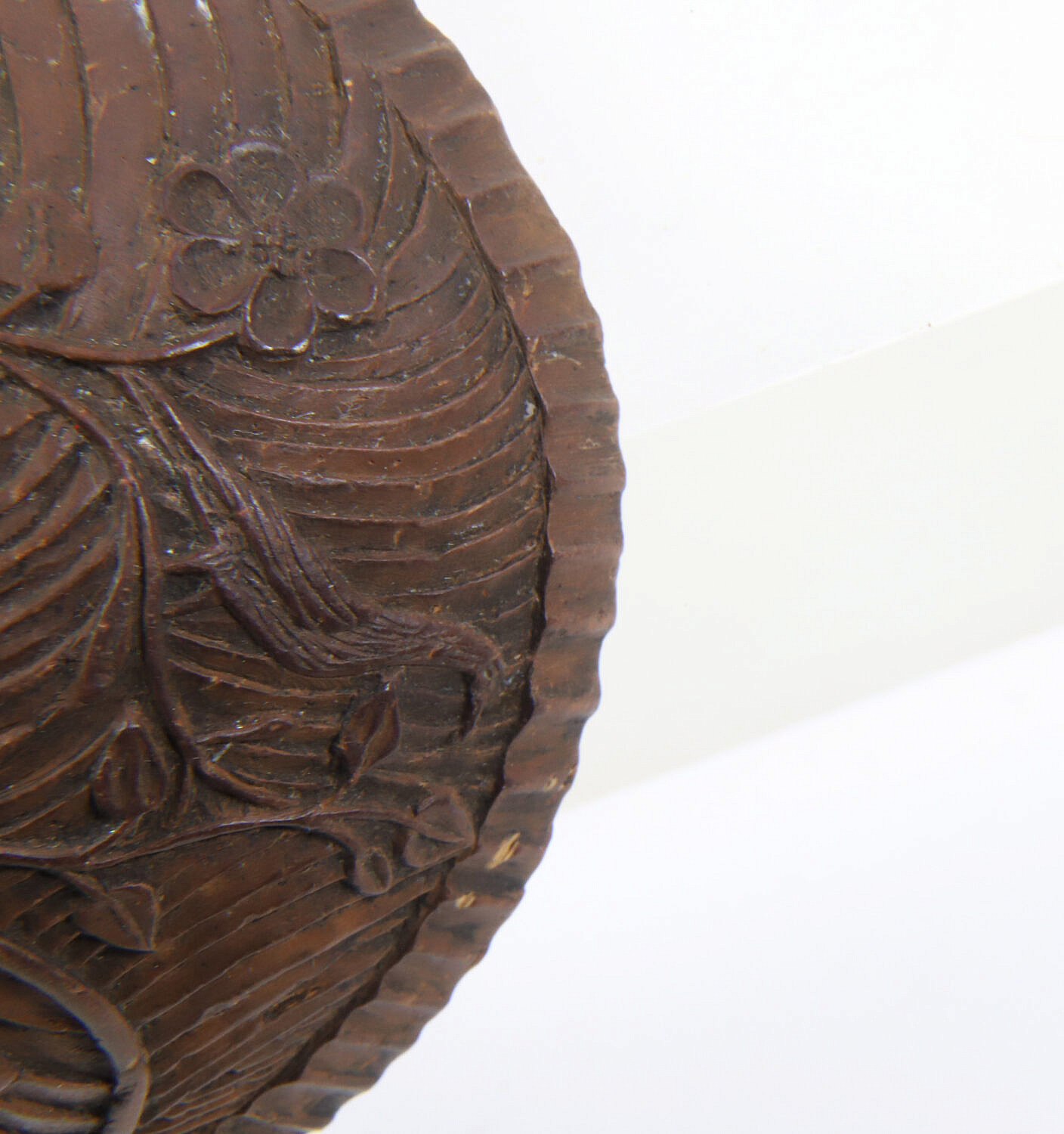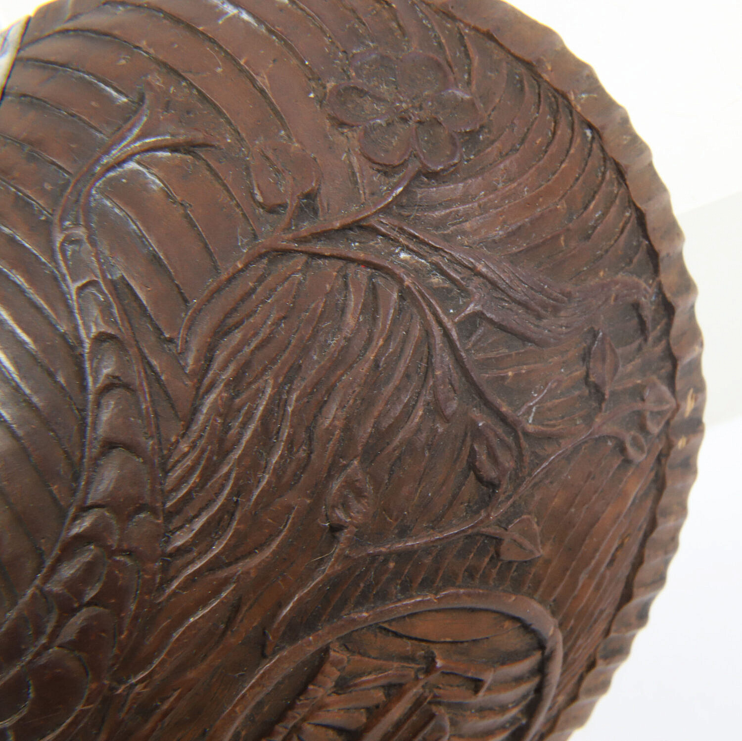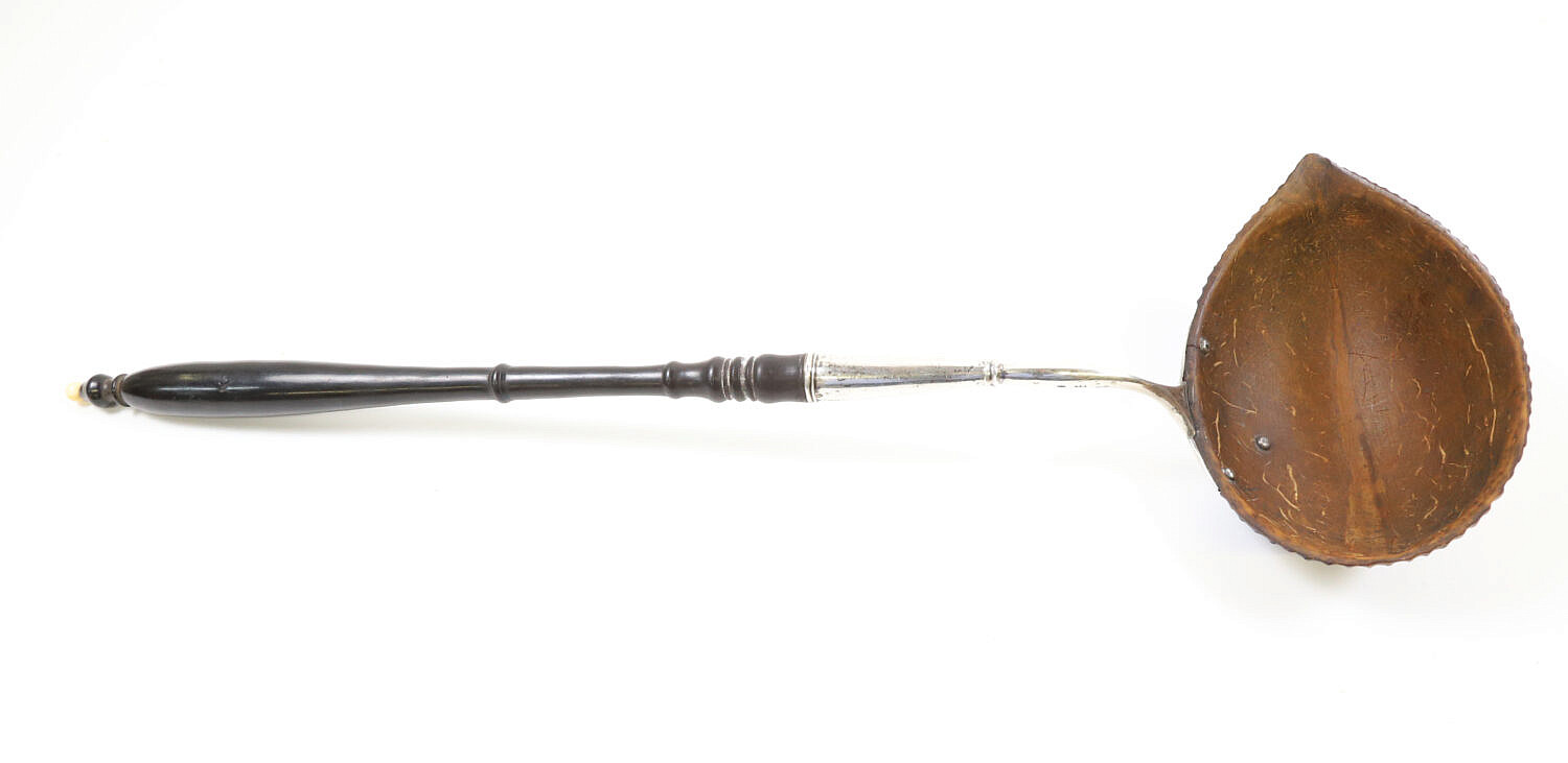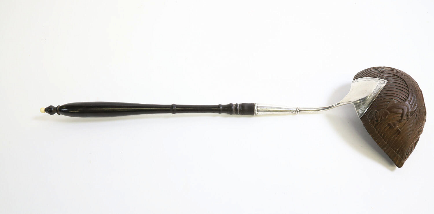 Finely Carved Coconut Ladle, 18th /19th Century, the bowl with a full body mermaid wearing a crown and holding a fork, bird perched on a vine, urn, etc, engraved silver bowl mount fitted with a turned ebony handle