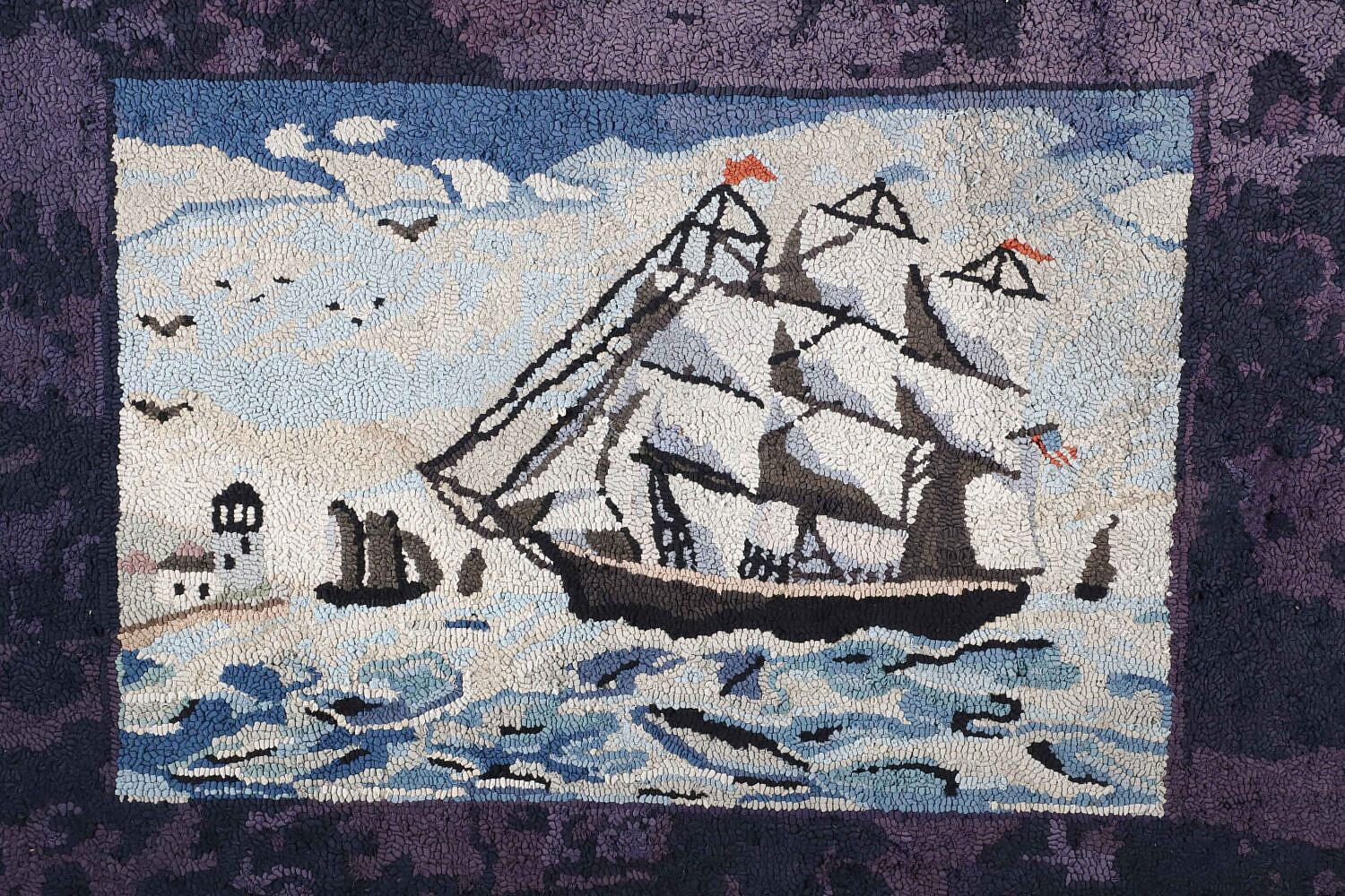 Antique Clipper Ship Hooked Rug Mounted on Board, with lighthouse on headland