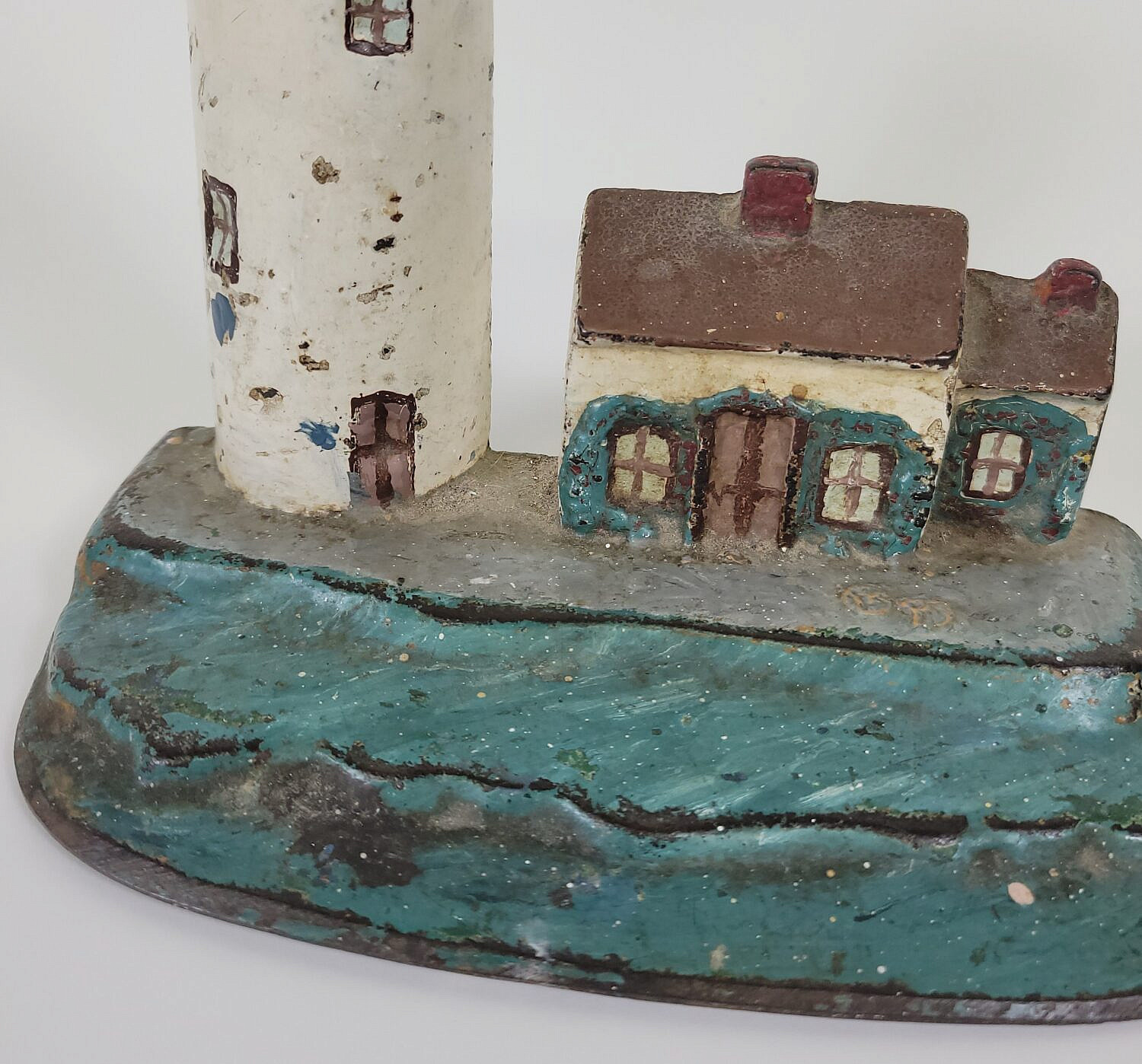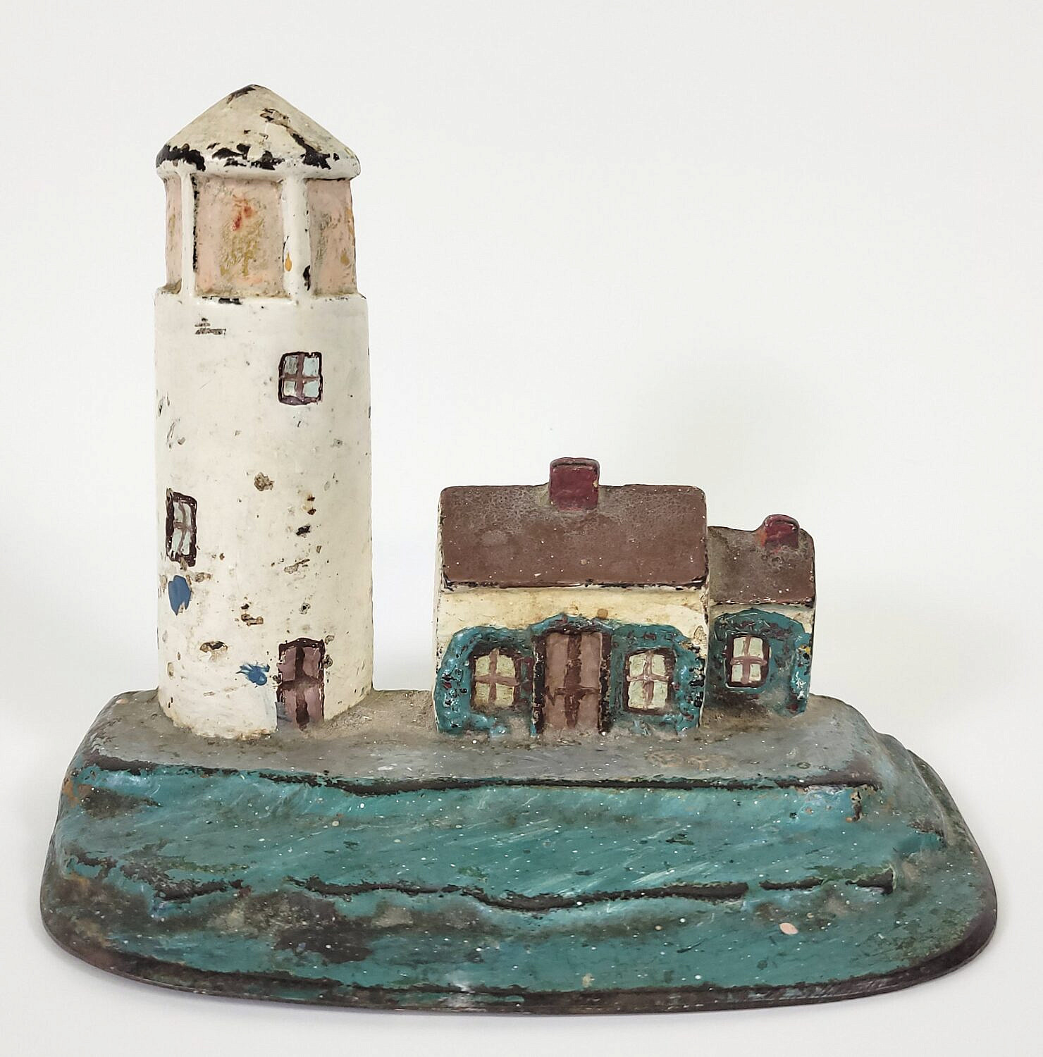 Antique Paint Decorated Lighthouse and Cottage Cast Iron Doorstop