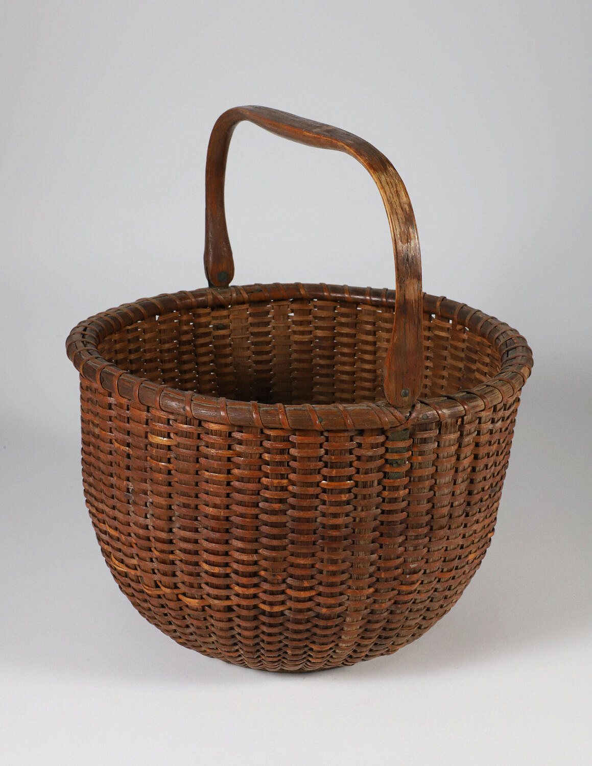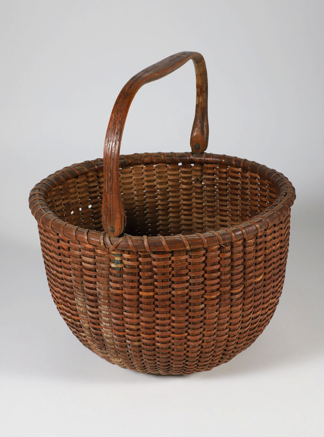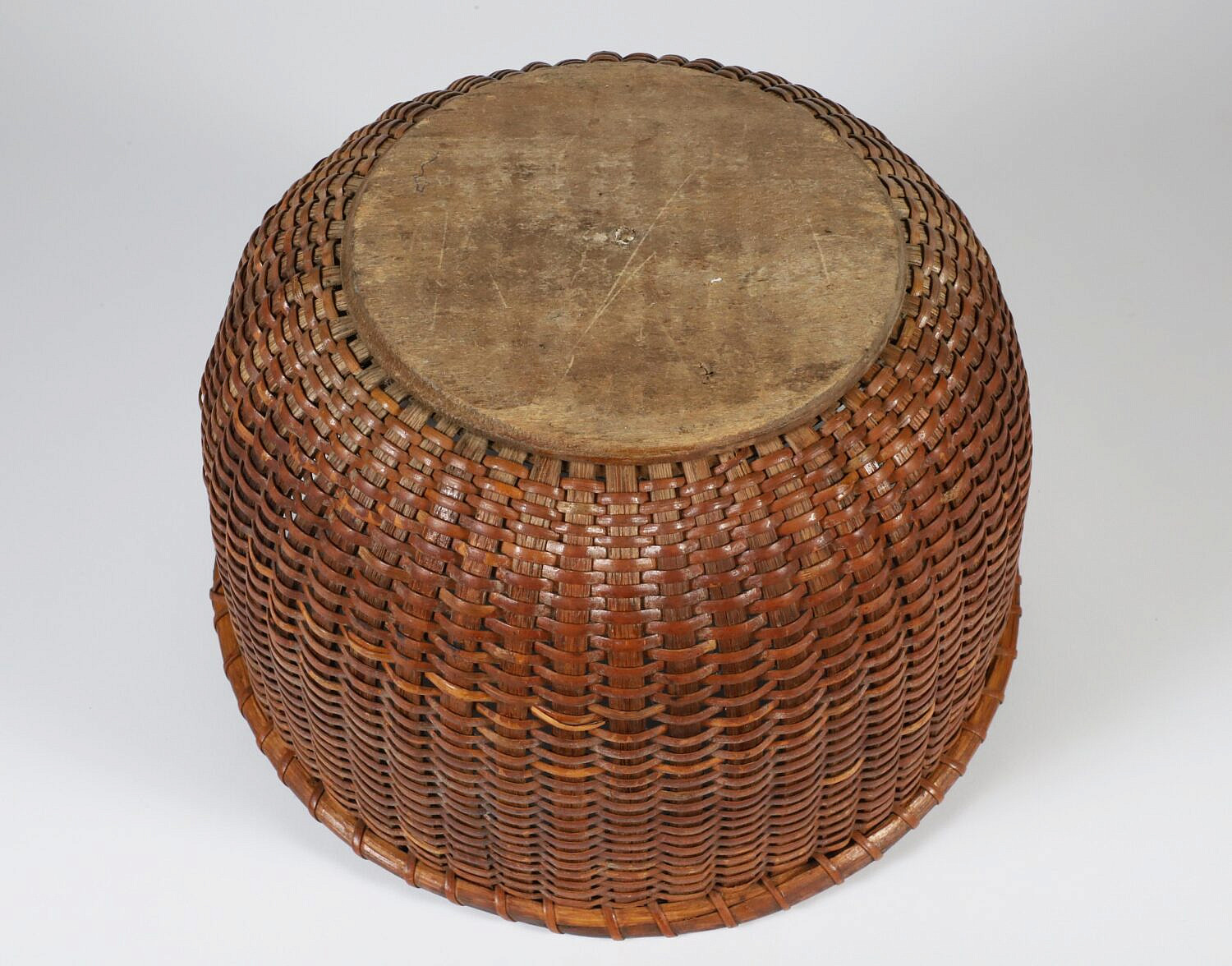 Antique Round Open Swing Handle Nantucket Basket, circa 1920, with two interior concentric circles carved in the base