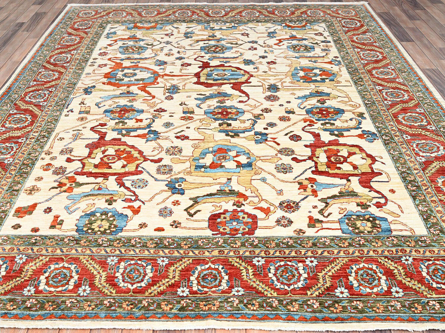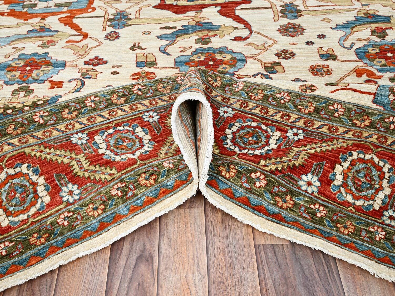 Bone White, Tangerine and Blue Vegetable Dye Heriz Oriental Carpet, 200 Knots Per Square Inch, with all over design
