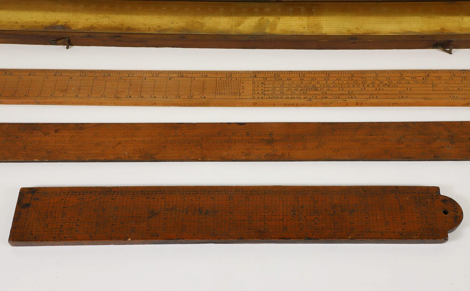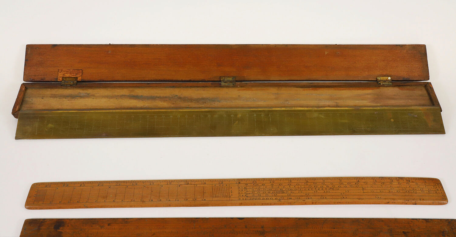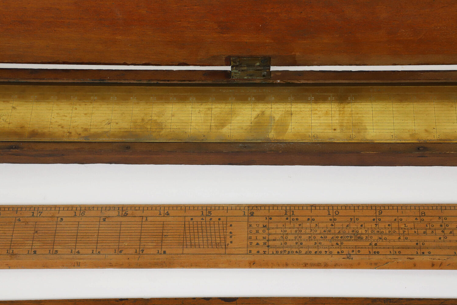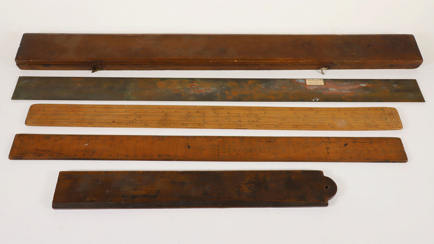 Boxed Brass Flat Rule By H. Hughes & Son, London, with three wooded flat rules