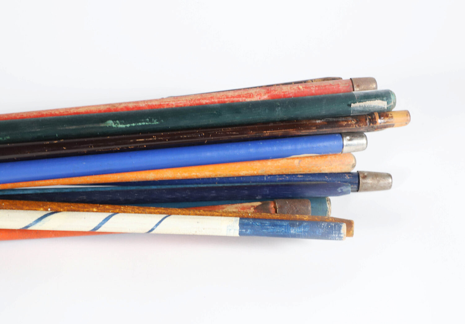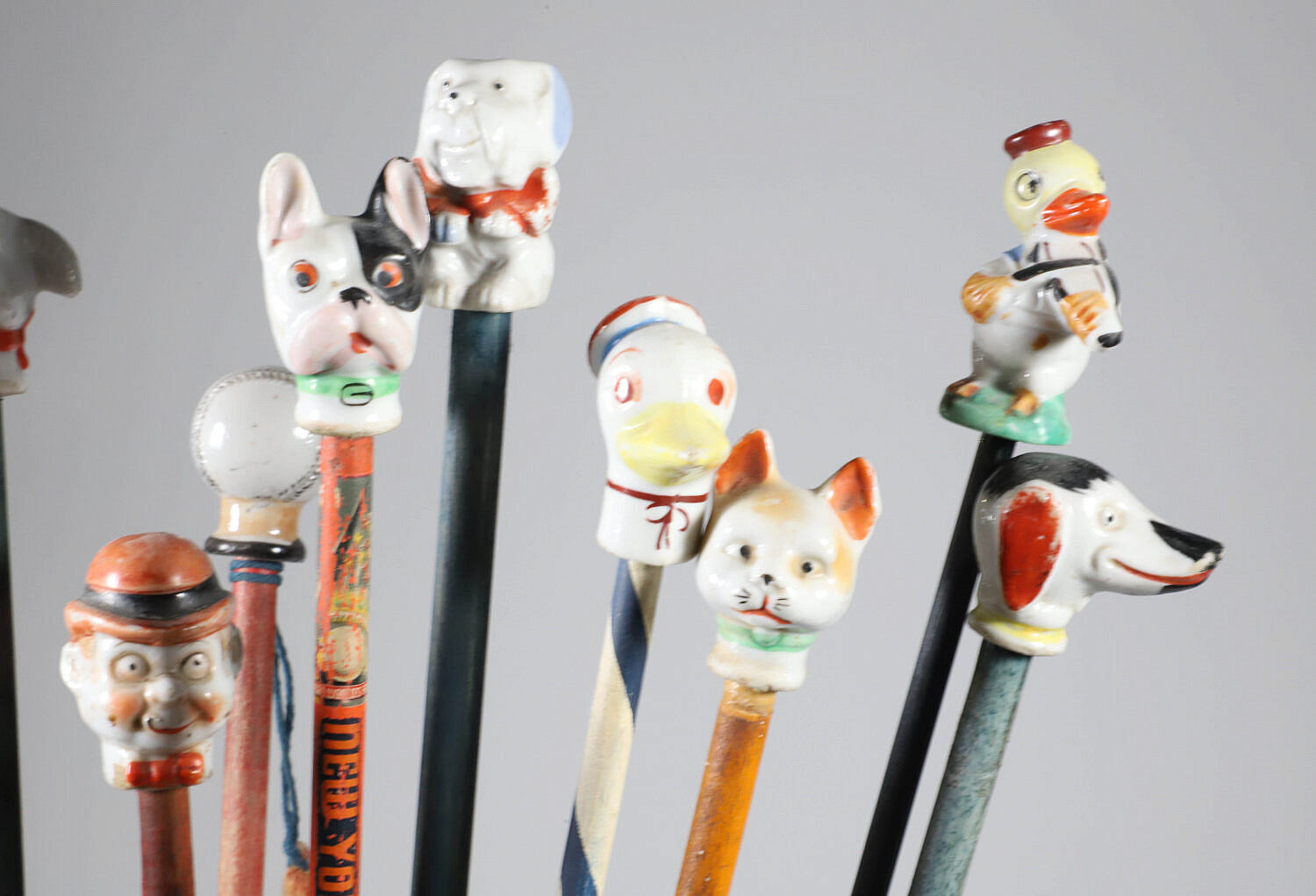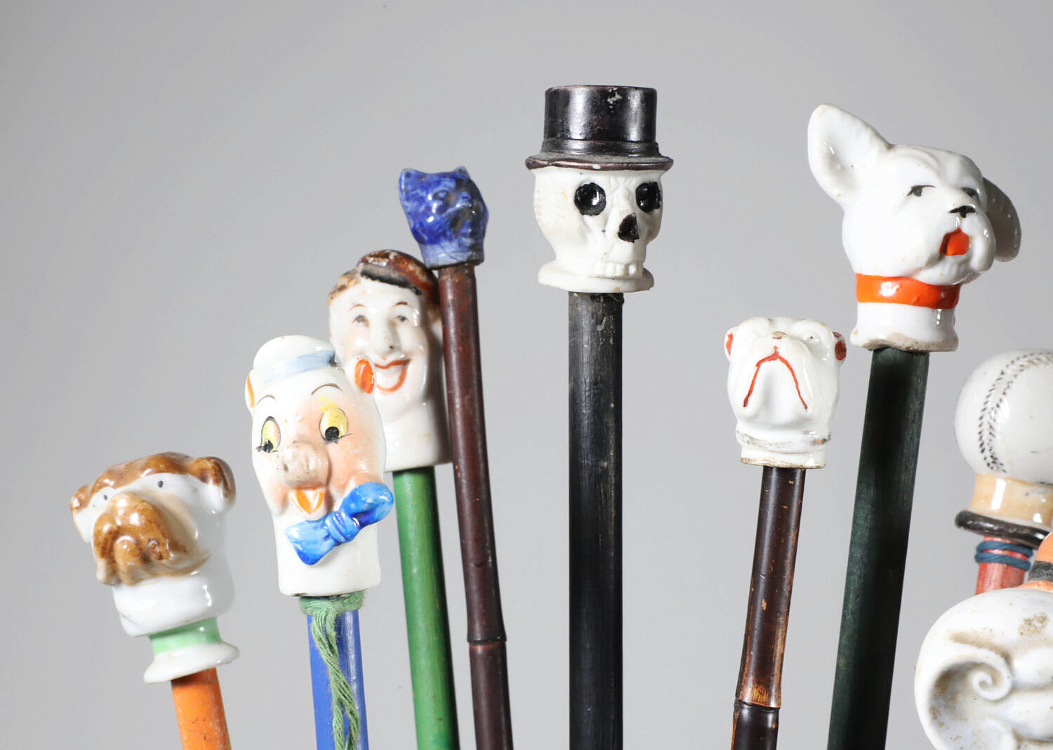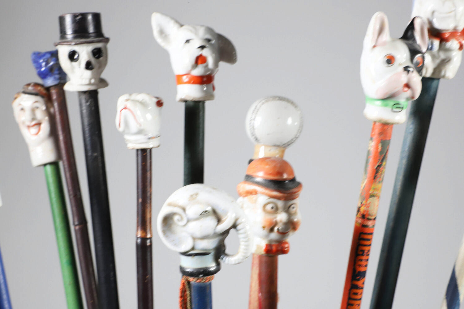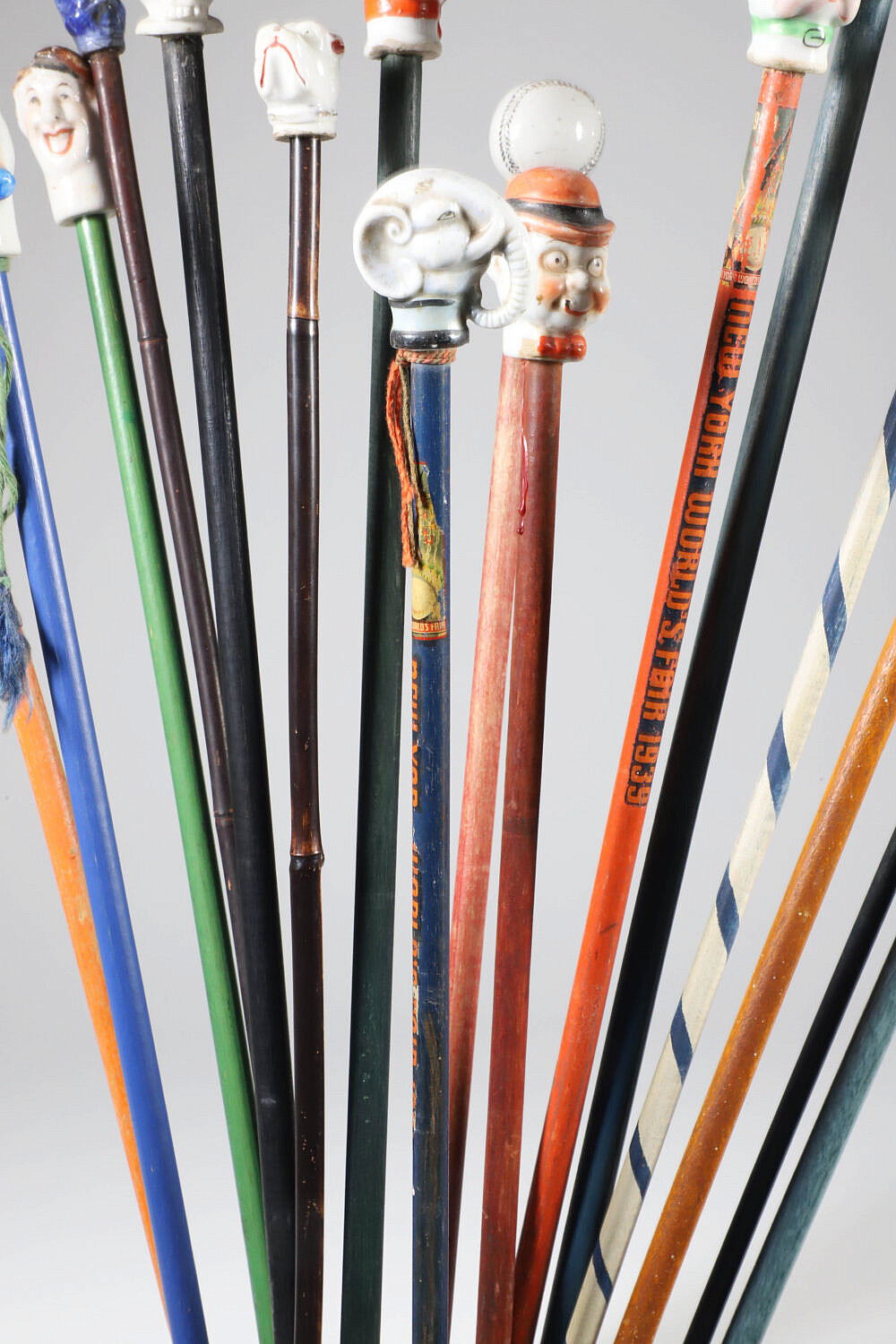 Collection of 16 Assorted Porcelain and Wood Carnival Walking Sticks