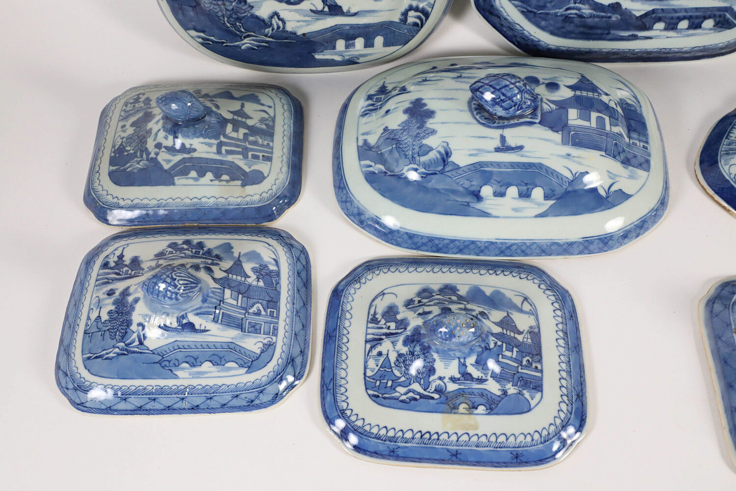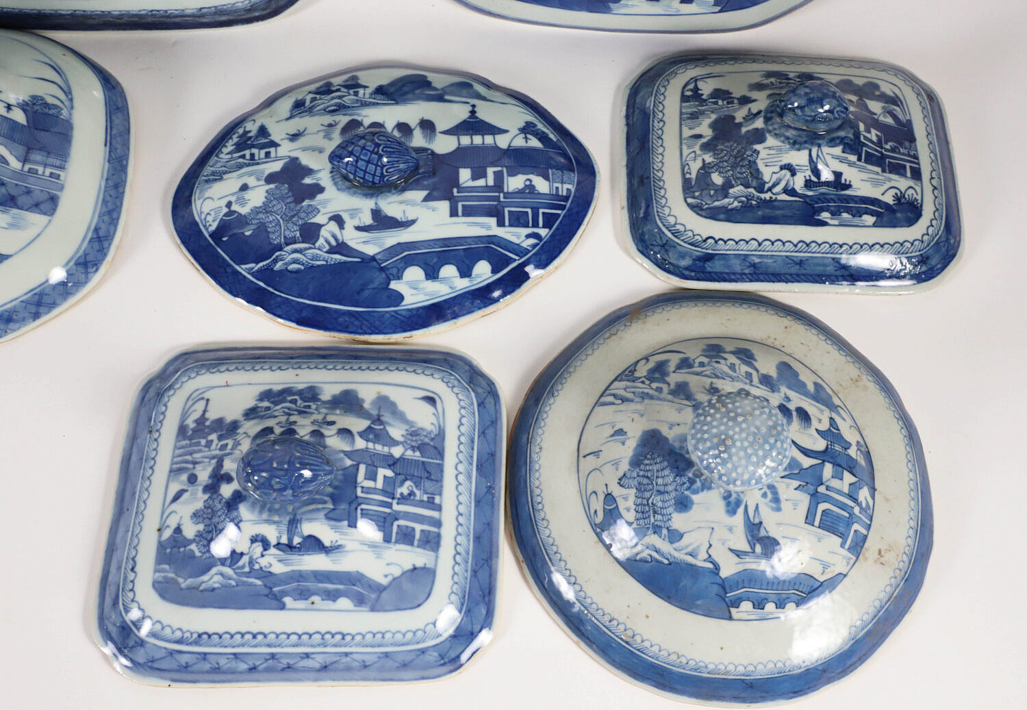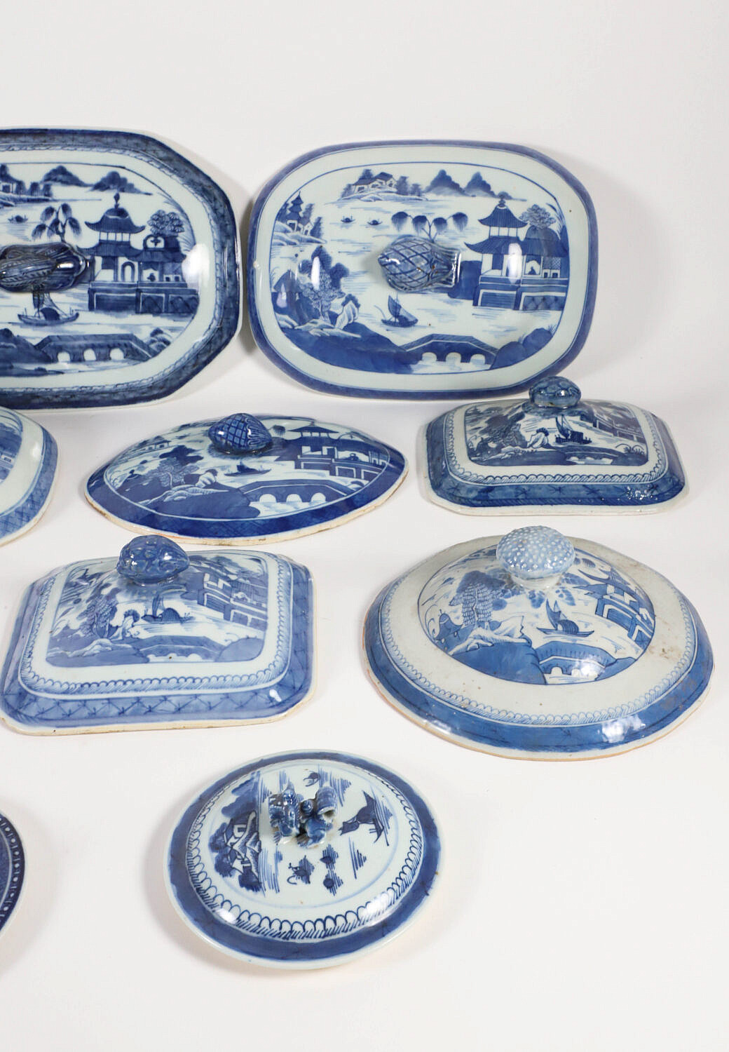 Collection of Fourteen Blue and White Canton Lids and Covers, 19th Century, four round and 10 oval and rectangular