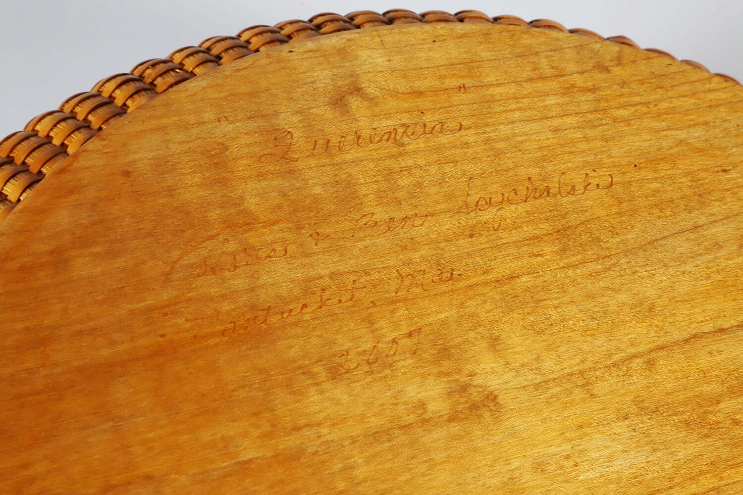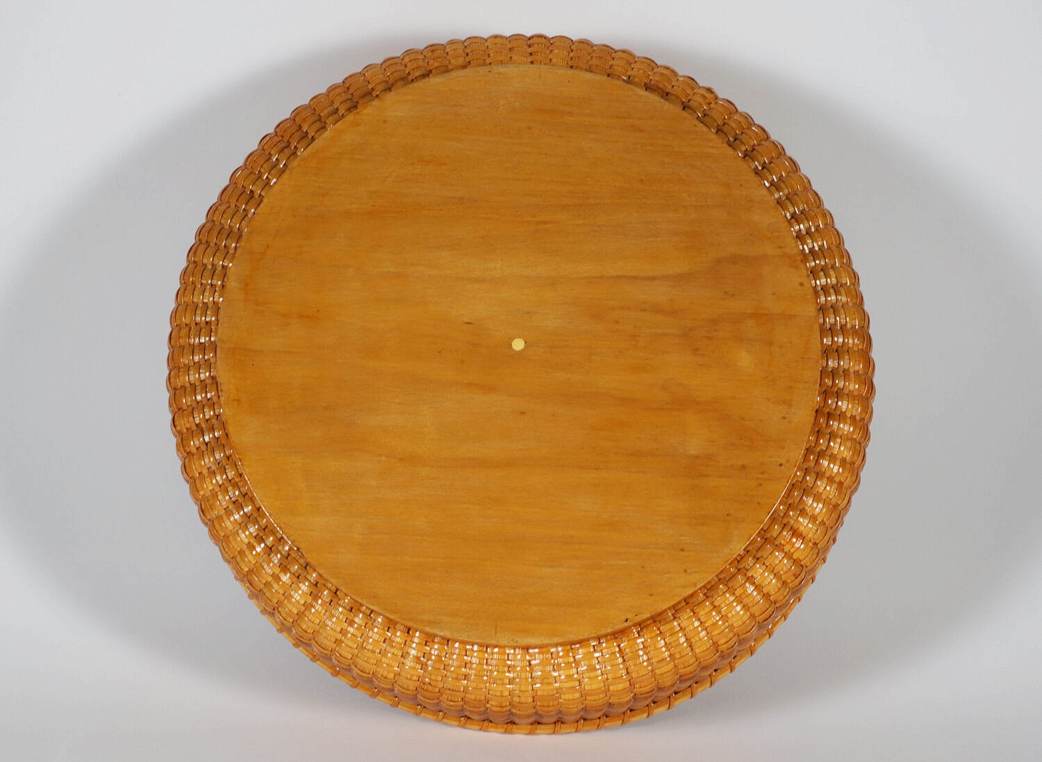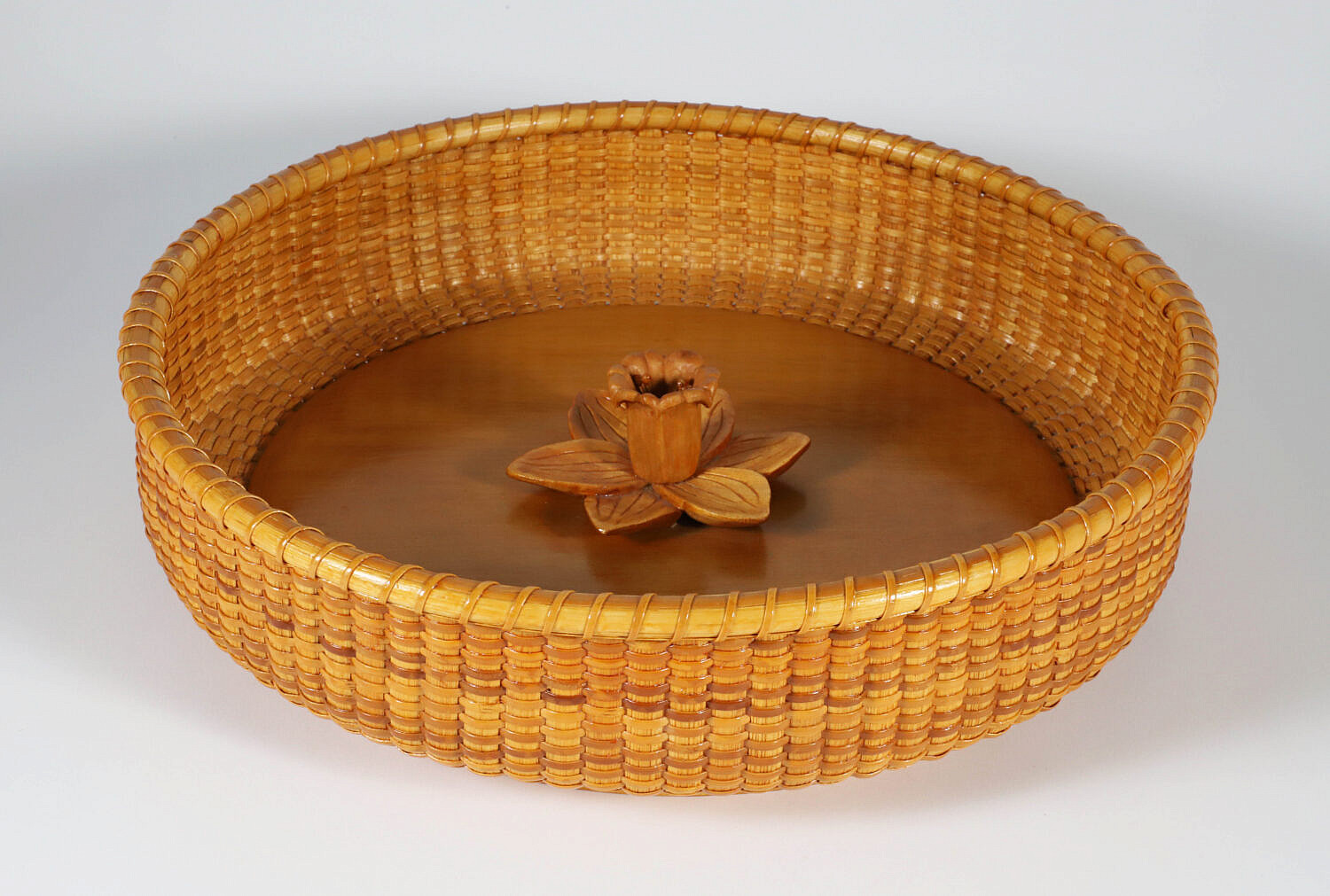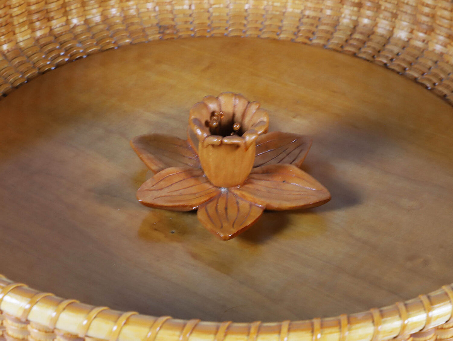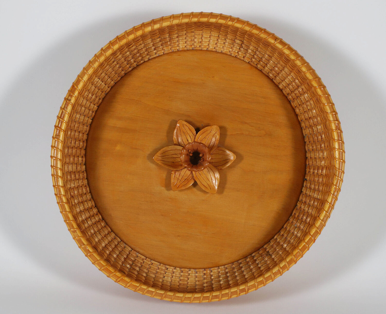 Delores and Ben Spychalski Round Nantucket Basket Tray, circa 2007, with central daffodil carved center, signed upon the base Querencia Delores and Ben Spychalski, Nantucket, MA, 2000