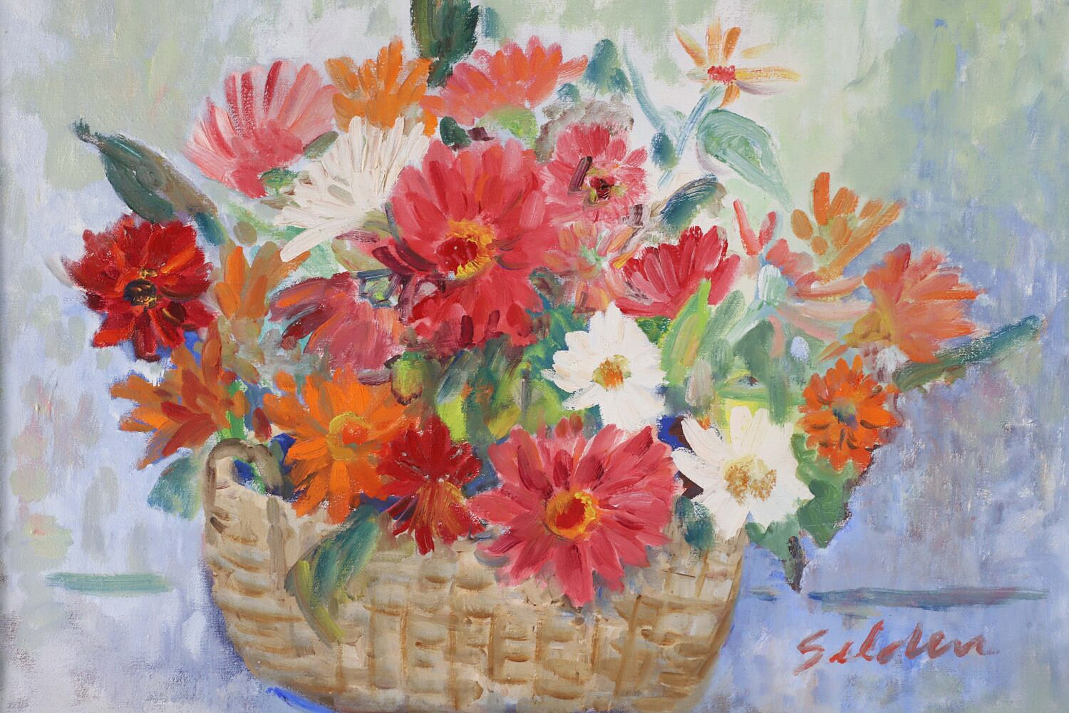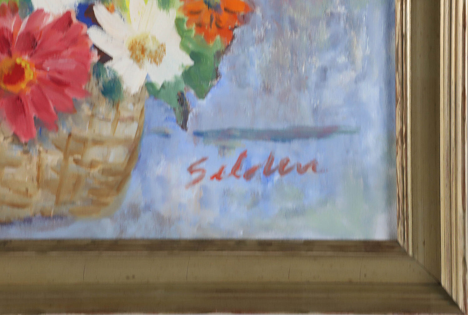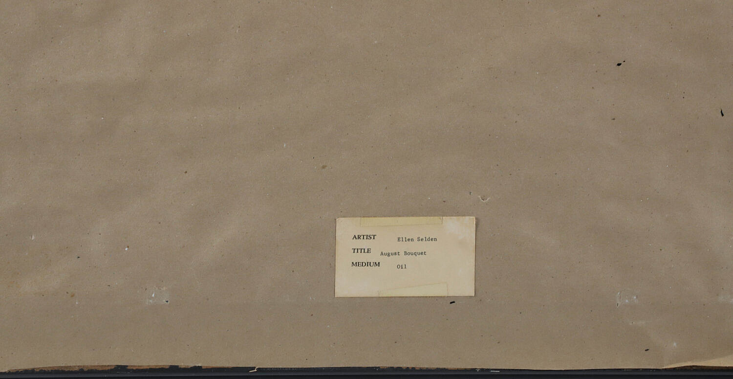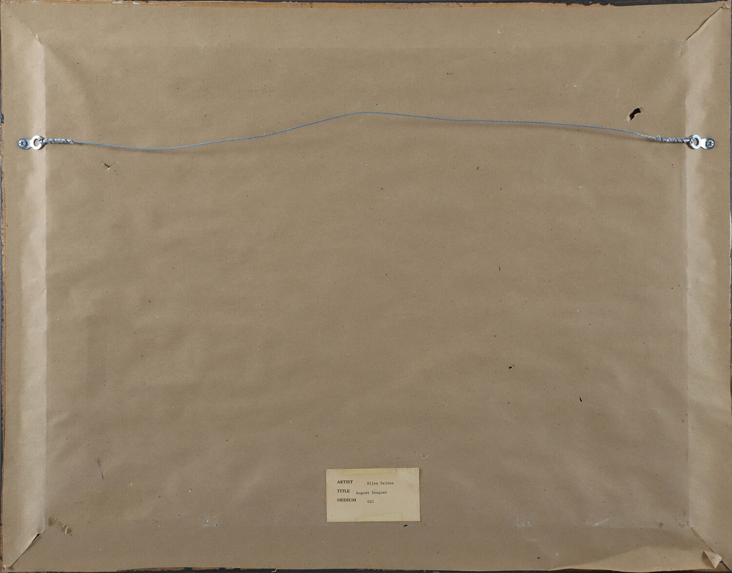 Ellen Selden (American 20th Century) Oil on Canvas “August Bouquet Still Life”, signed lower right Selden, artist name and title on back, in molded gilt frame
