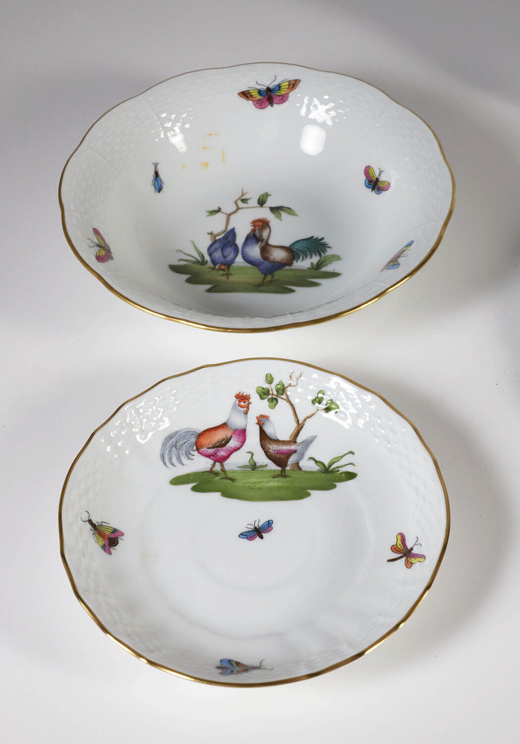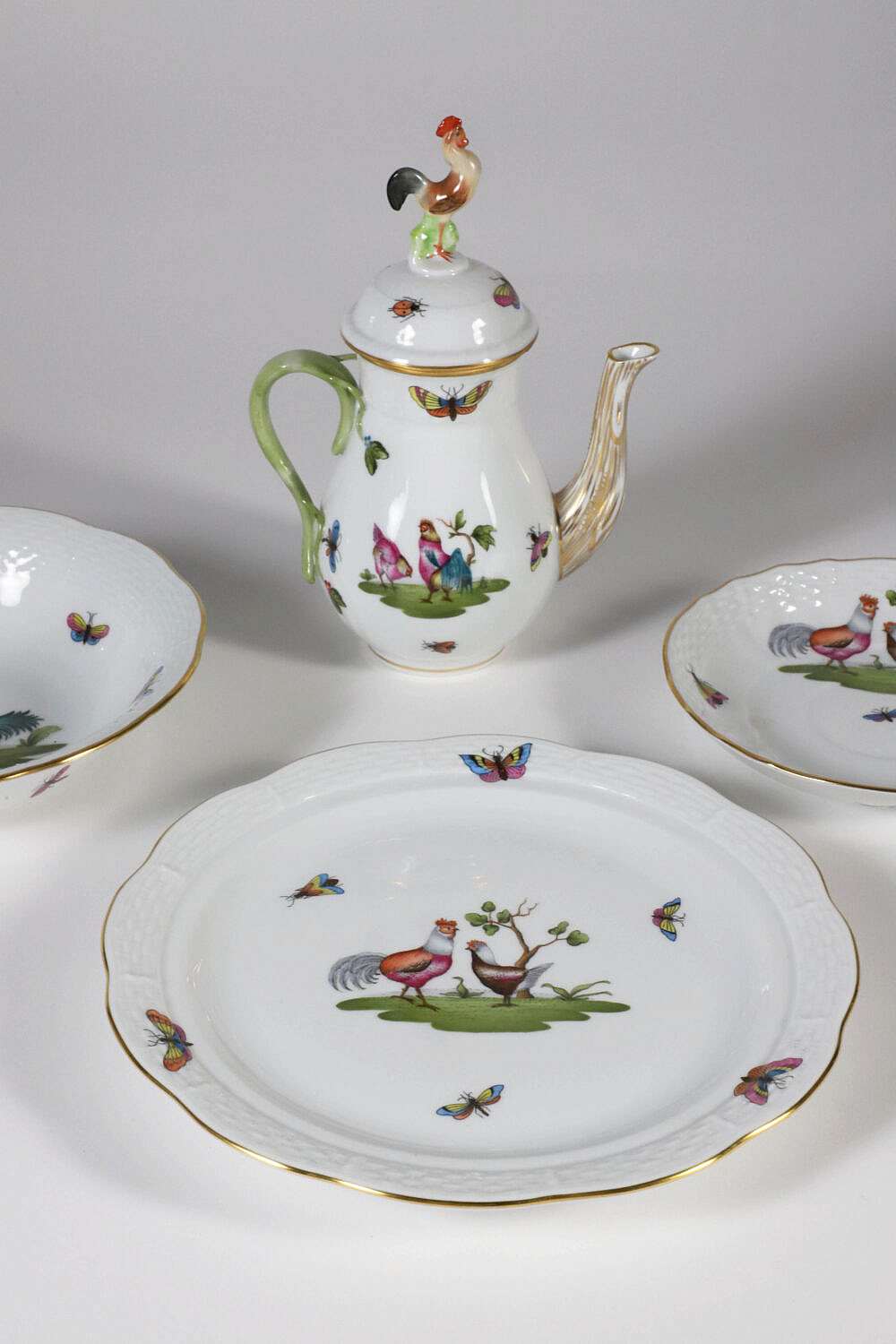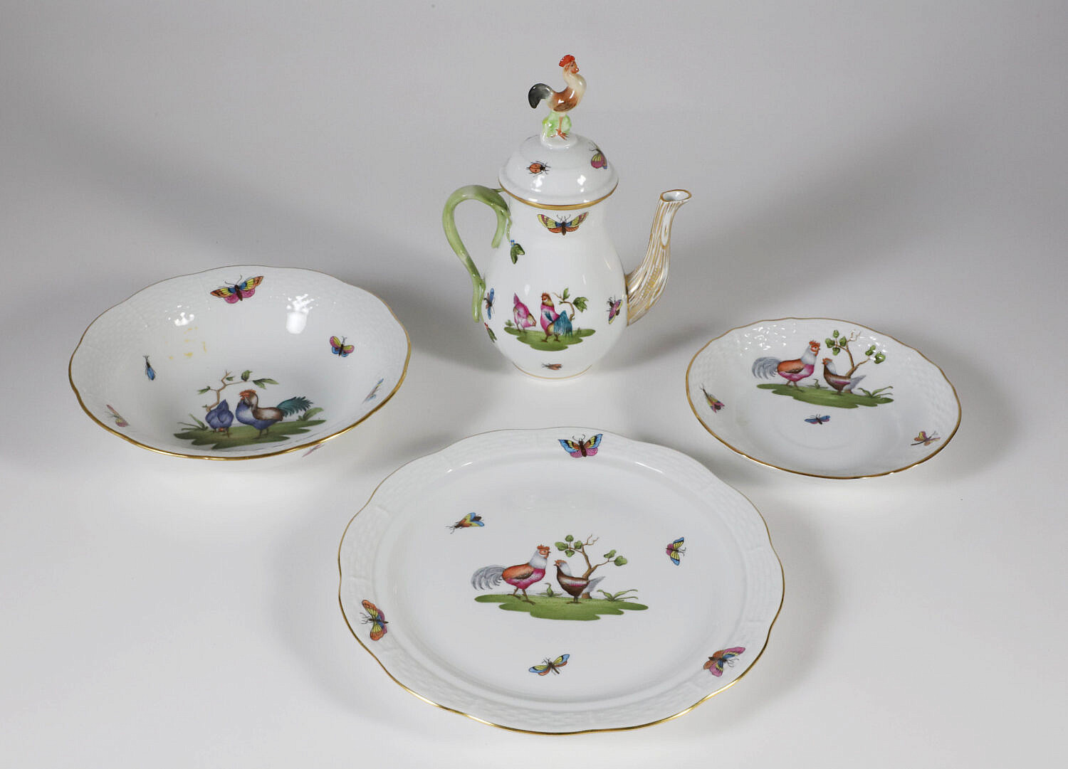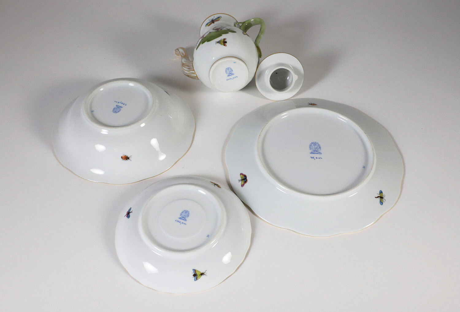 Five Pieces of Herend Hungary Hand-painted Porcelain Including a Teapot, Plate, Saucer, and Bowl
