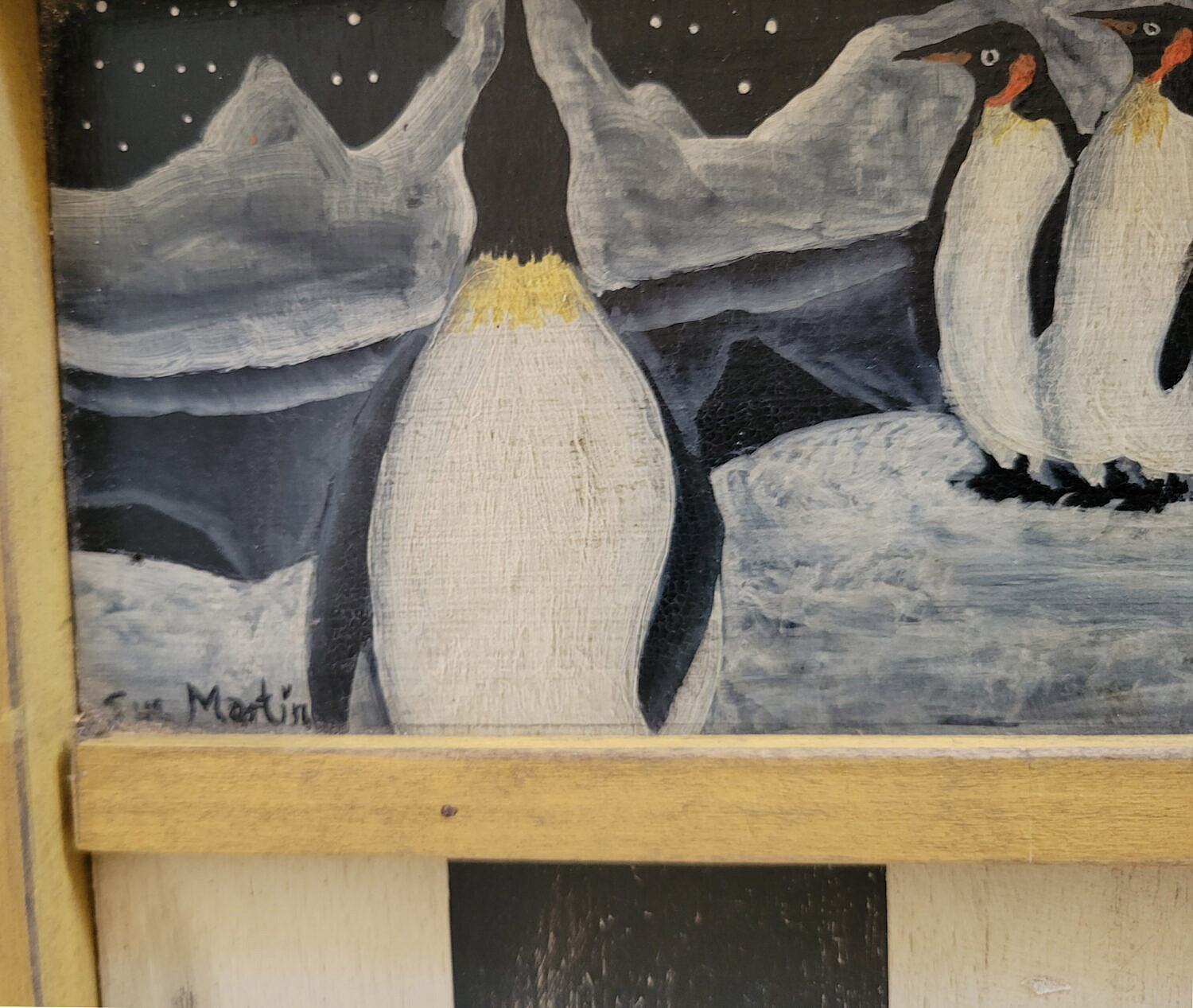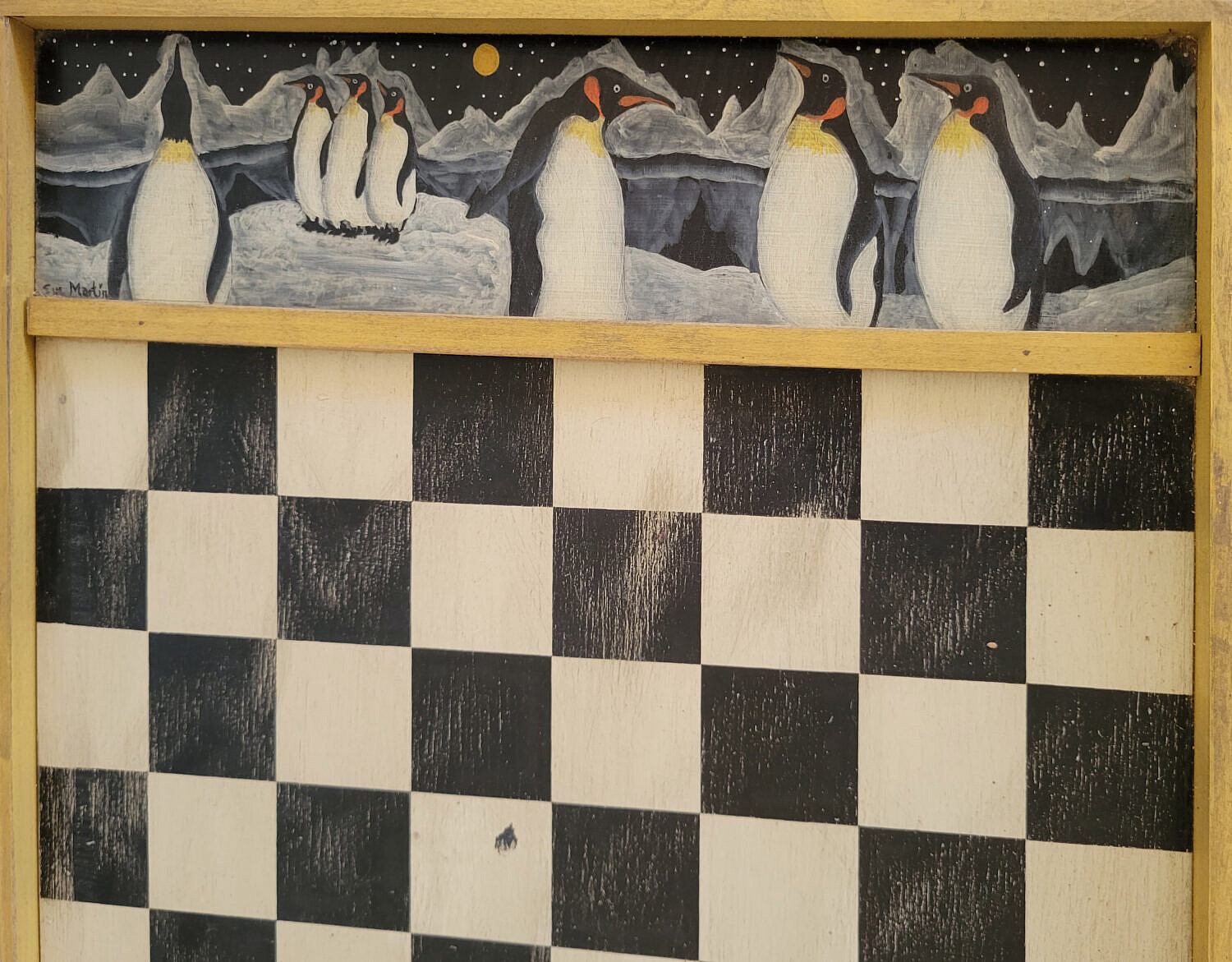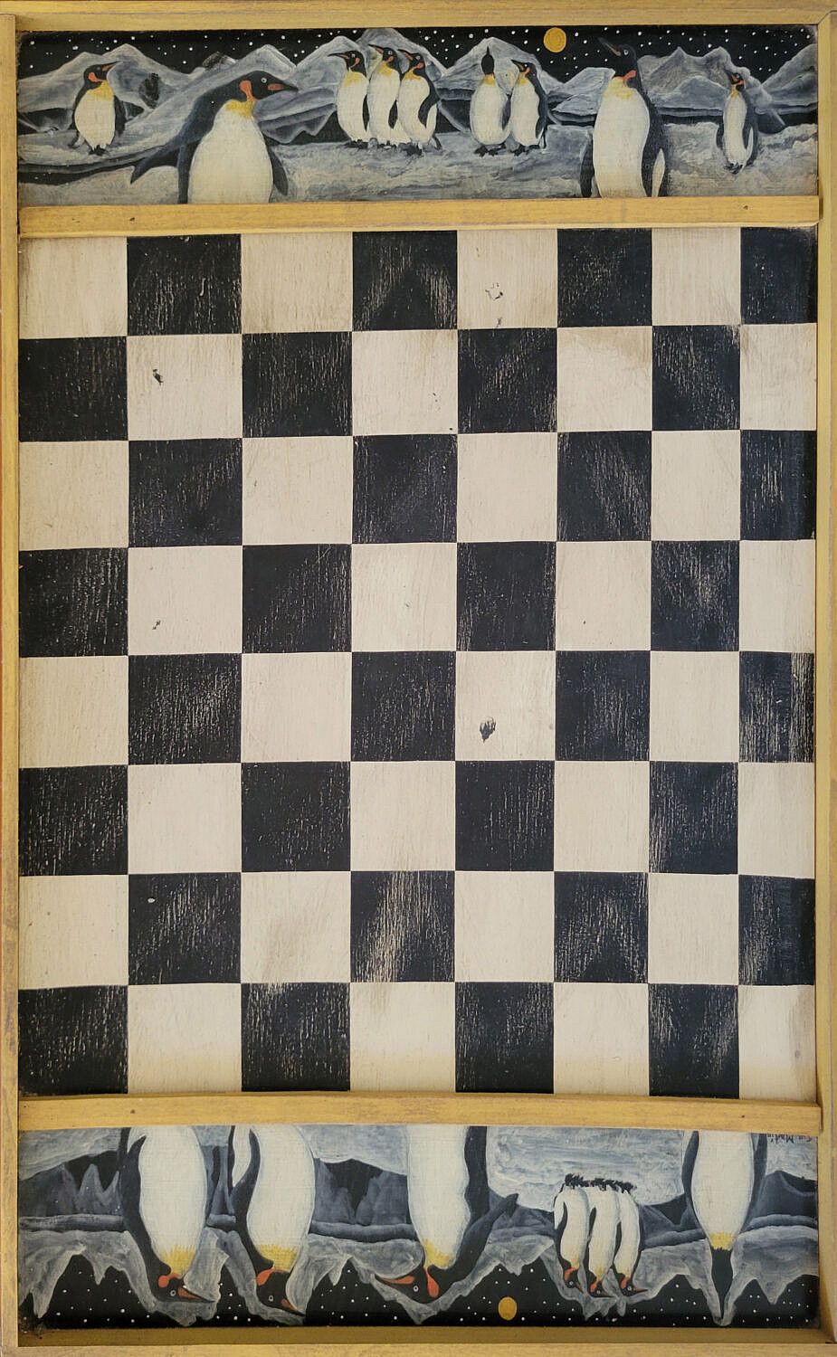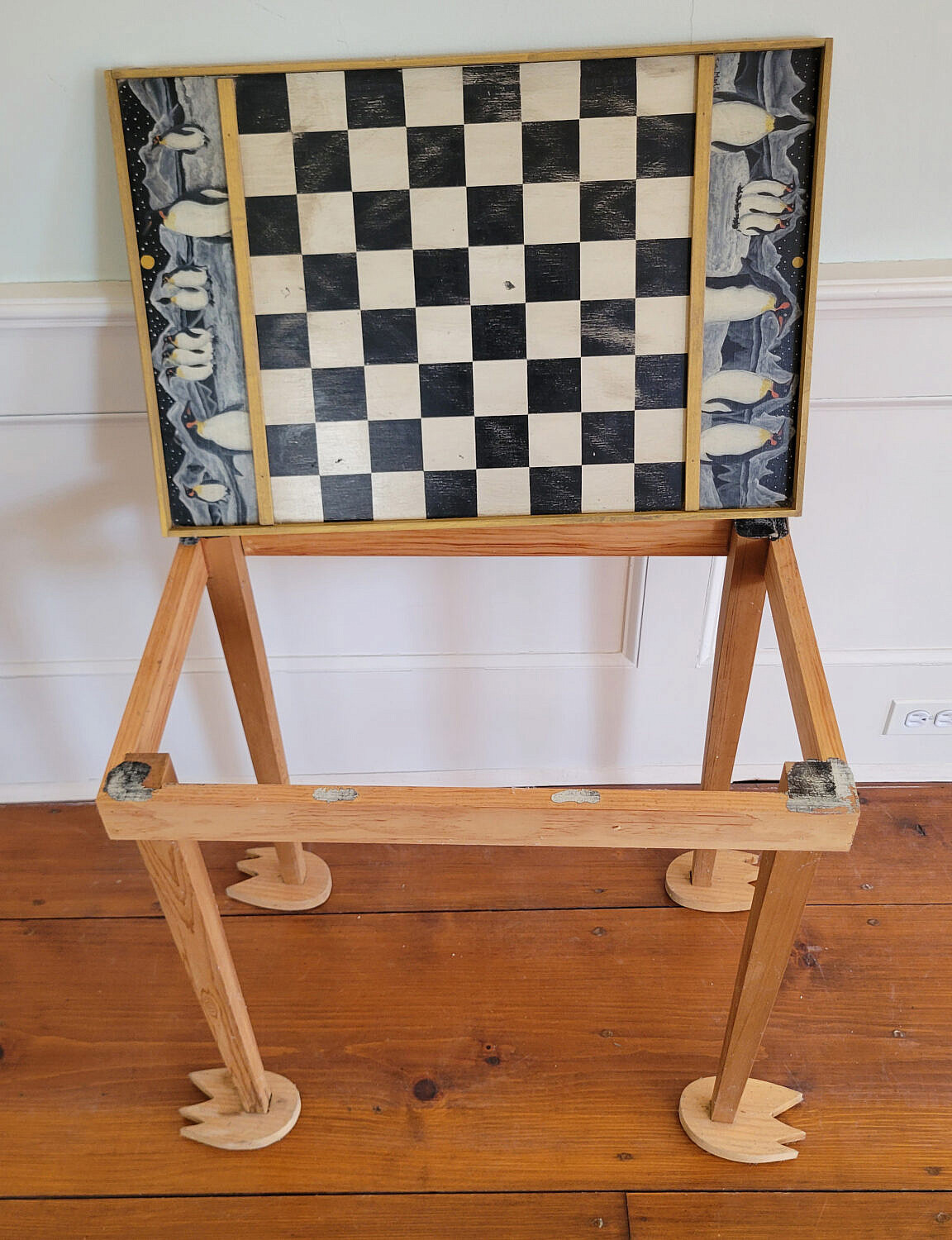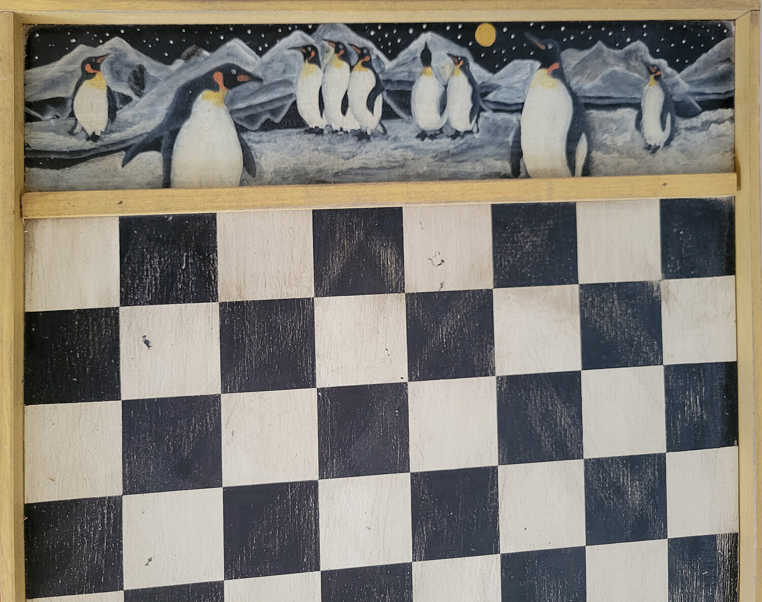 Folk Art Paint Decorated Penguin Themed Chess – Checkerboard on Stand